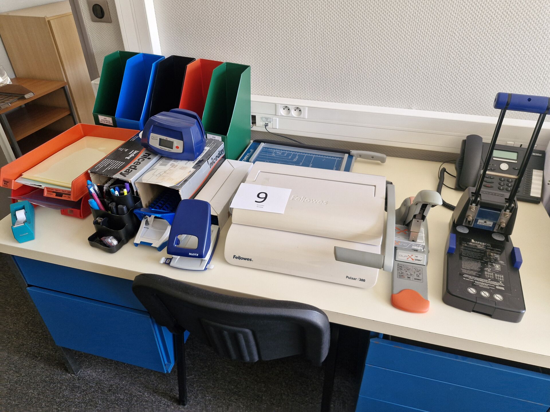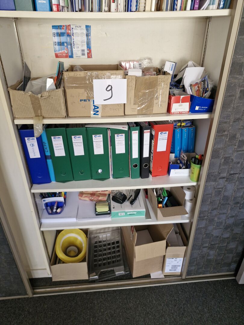 1 balance pour courrier ALBA Precisio 2001 1 perforatrice RAPESCO modèle 2200 1 agrafeuse professionnelle RAPID + le contenu d'un placard et d'une petite réserve de fournitures de bureau comprenant : crayons, piles, enveloppes etc 1 relieuse FELLOWES 1 massicot DAHLE 502