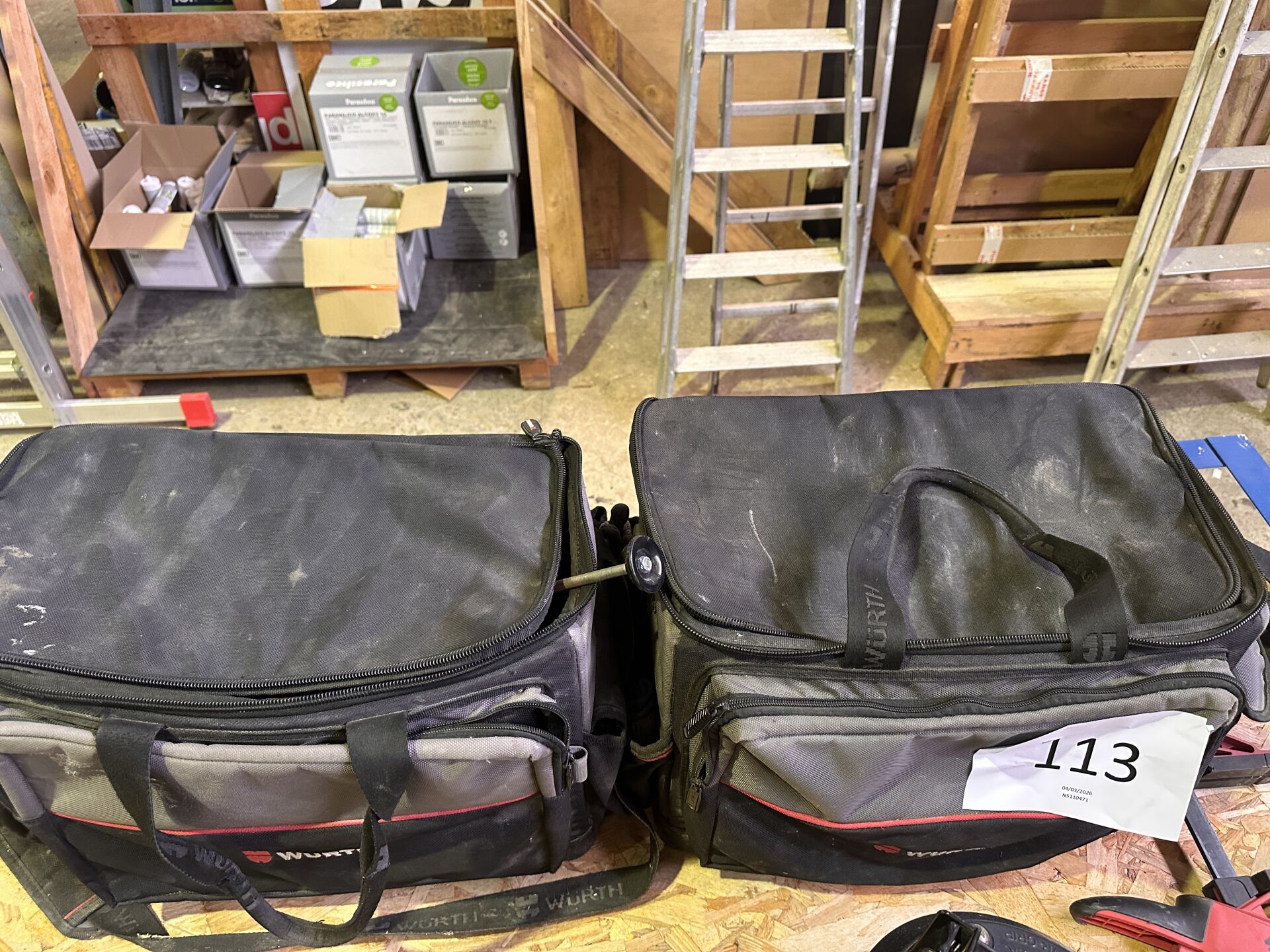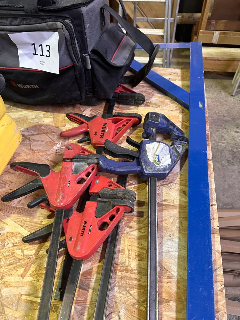 2 sacoches souples de chantier WURTH avec 1 équerre alu 140 x 70 cm, 4 serre-joints : 2 WURTH et 2 IRWIN en 30, 40 et 50 cm