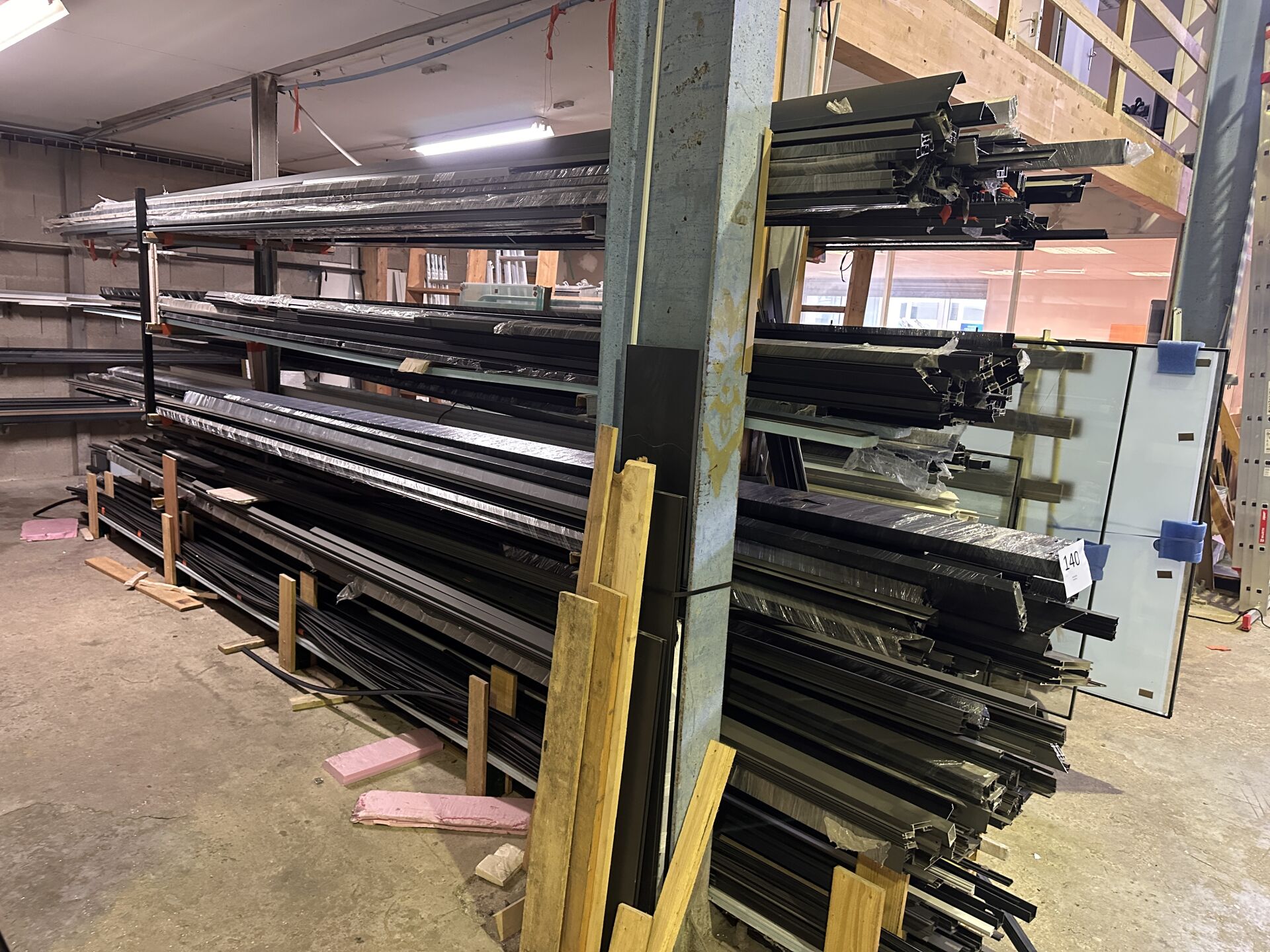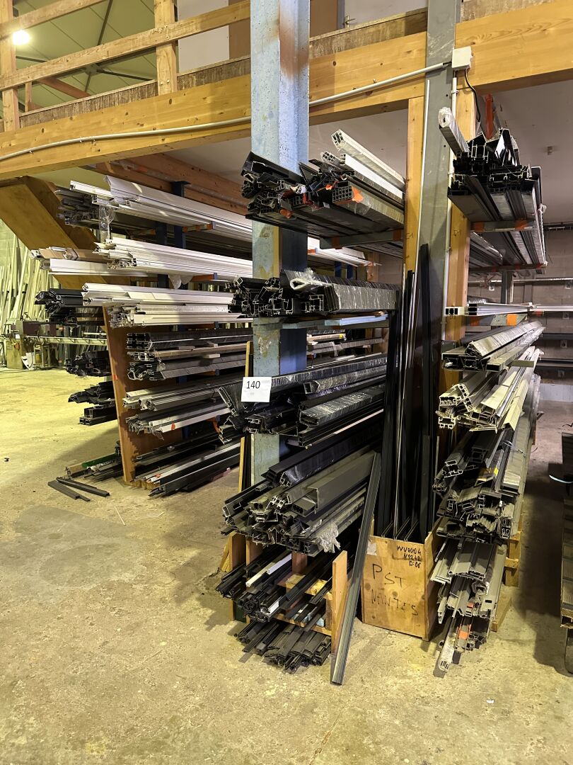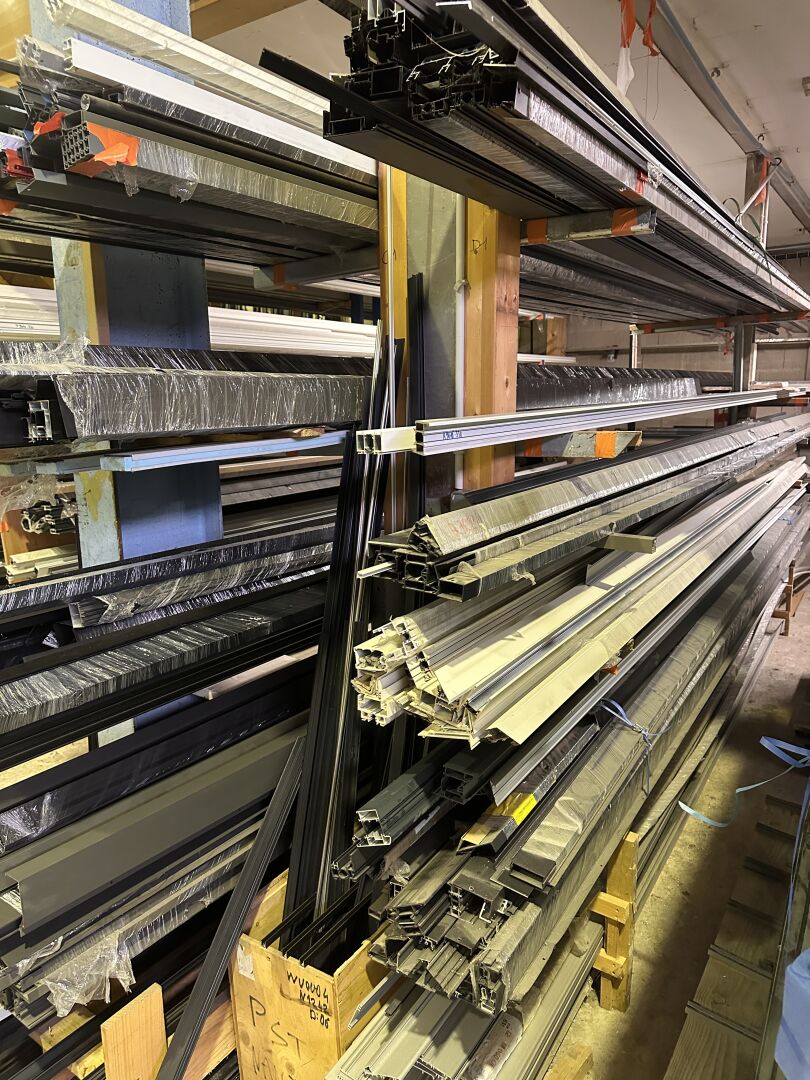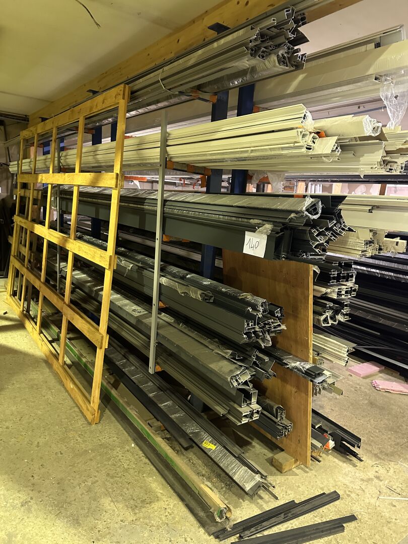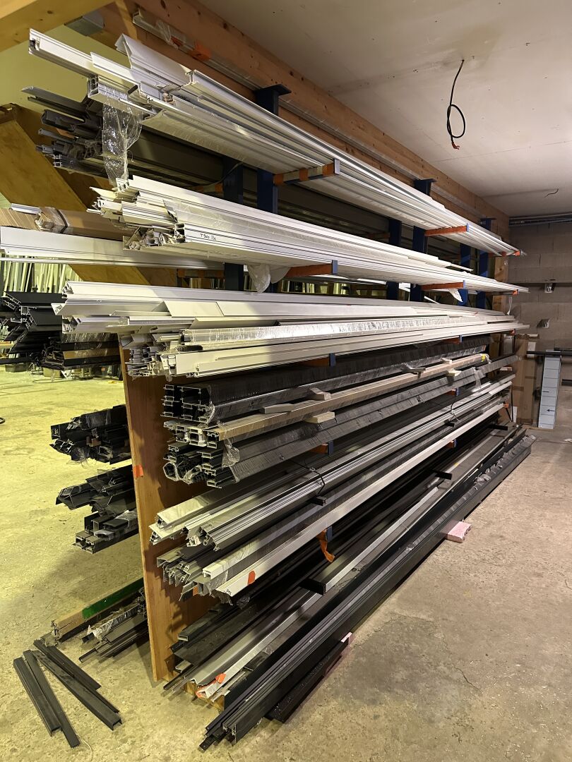Dans 2 racks Cantilever : 1 stock de profils alu en 6 m, anthracite, gris ou blanc
