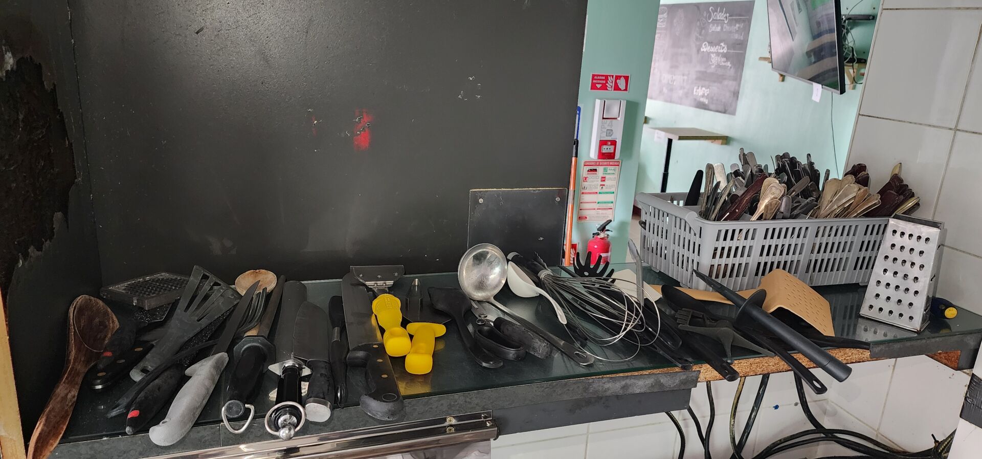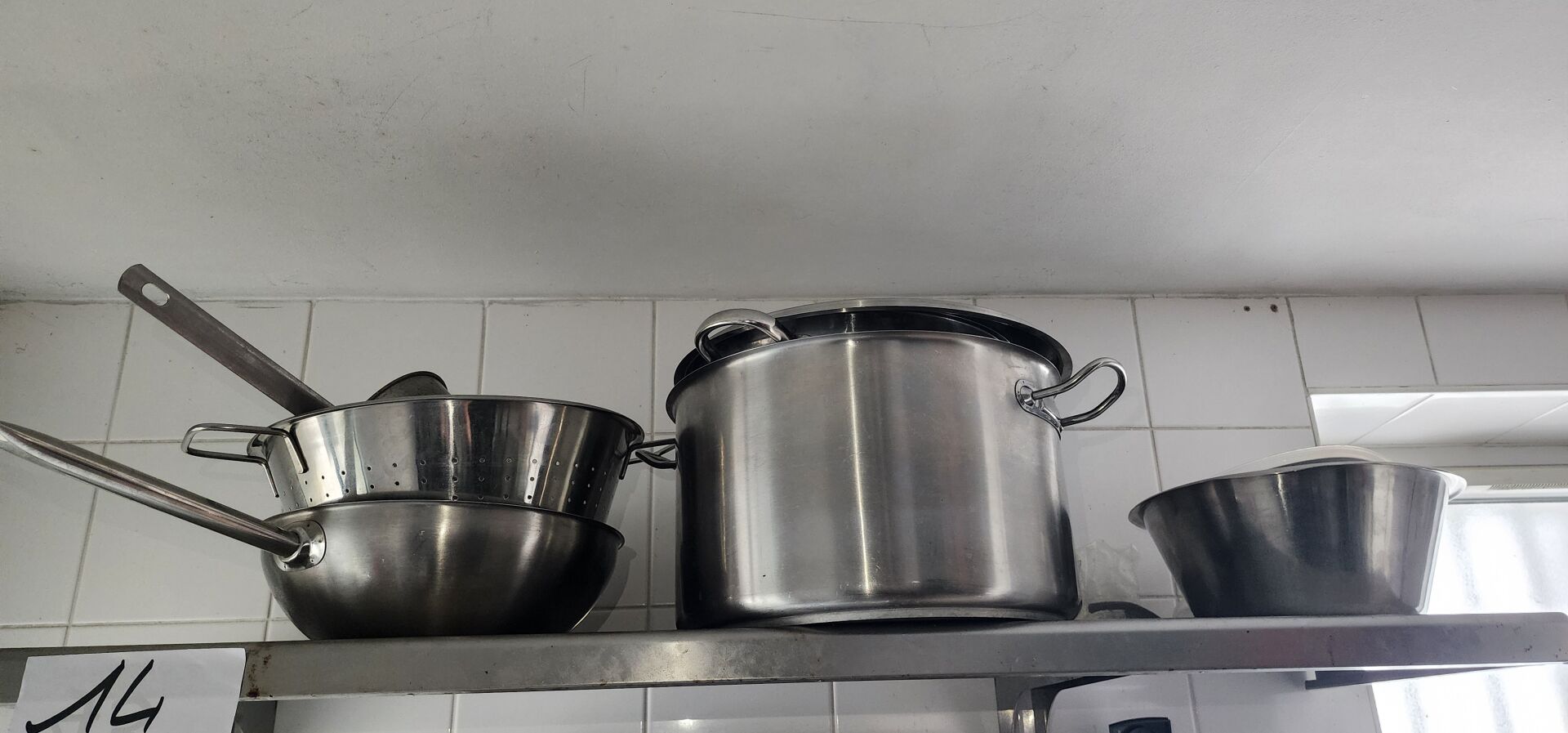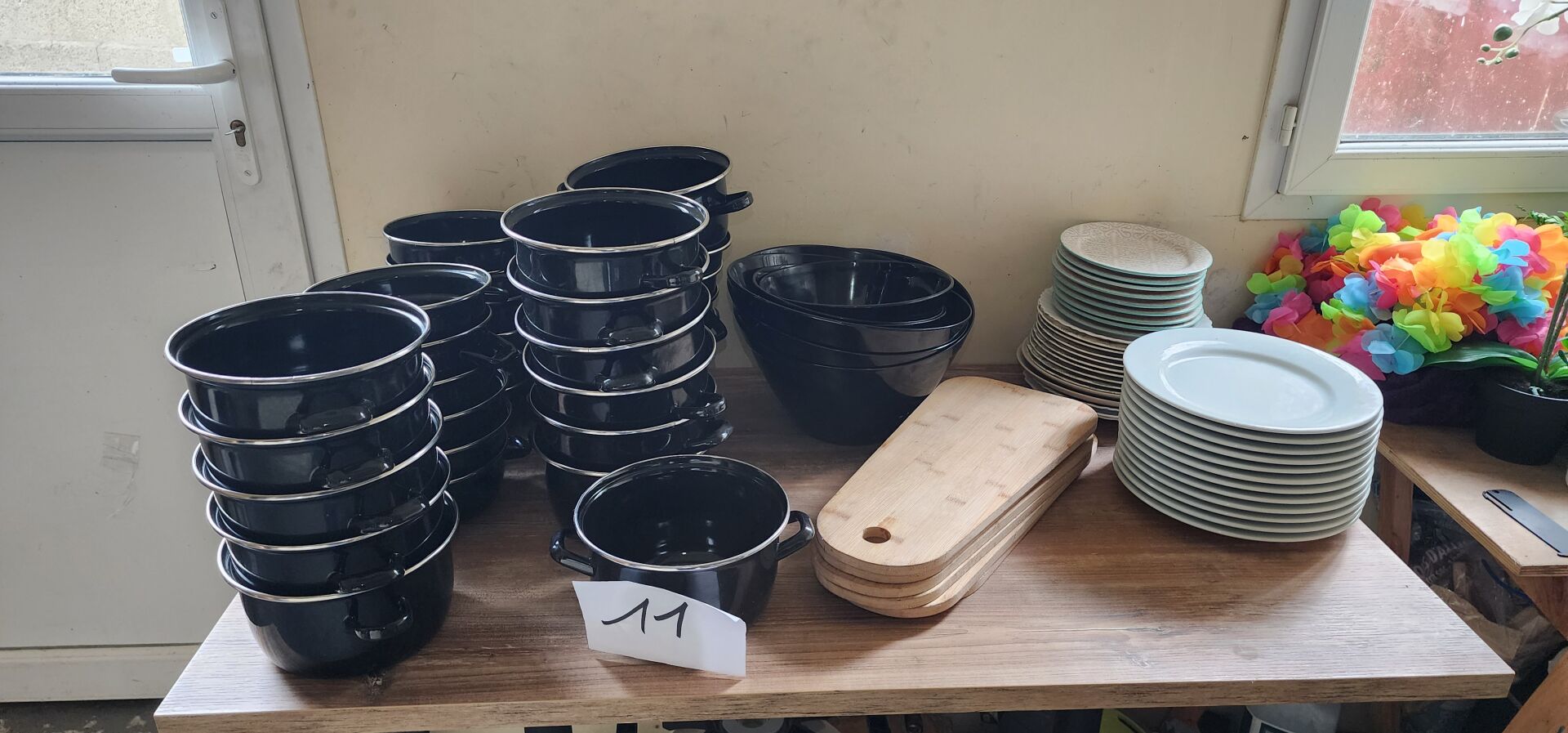 1 lot de vaisselle (dont assiettes) et couverts, 1 lot d'ustensiles de cuisine dont casseroles, marmite et bacs gastro,