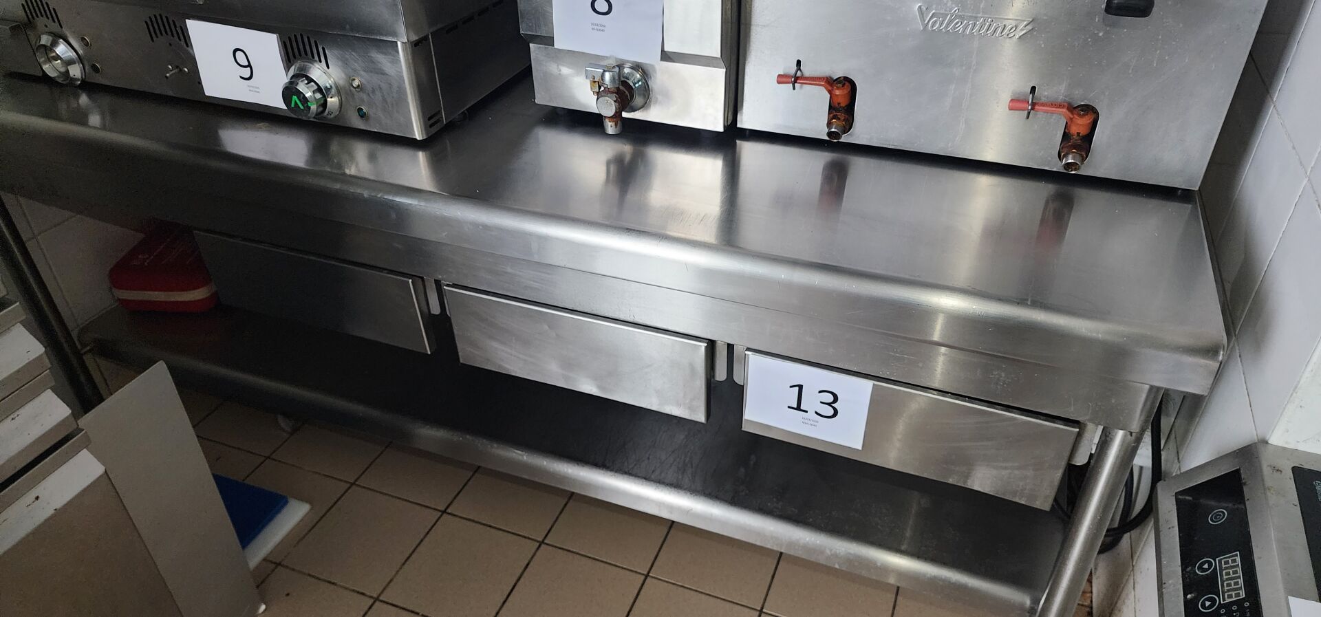 1 table inox 3 tiroirs avec plateau d'entre-jambe et dosseret 180 x 70 cm