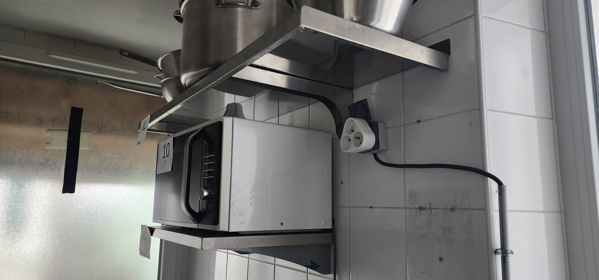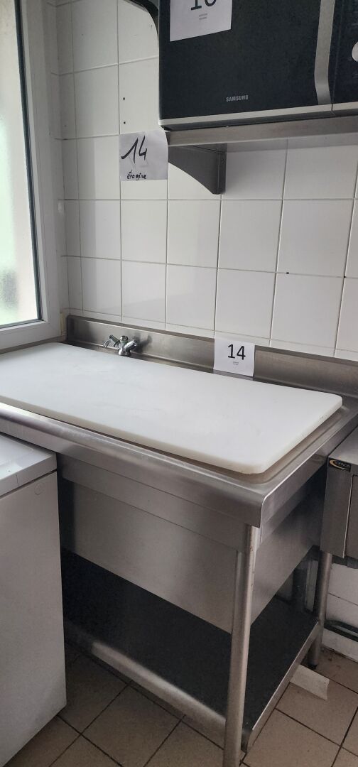 1 plonge inox transformée en table inox avec plateau de découpe plateau d'entre-jambe et dosseret (1200 x 700) avec 2 étagères murales inox : 120 x 40 cm et 60 x 40 cm