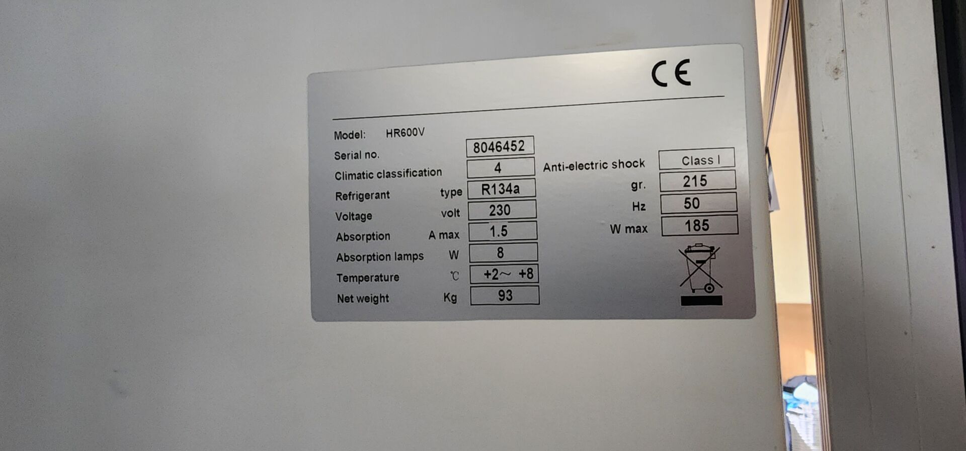 1 armoire réfrigérée vitrée HR600V - N/S : 8046452 78 x 70 x 189 cm