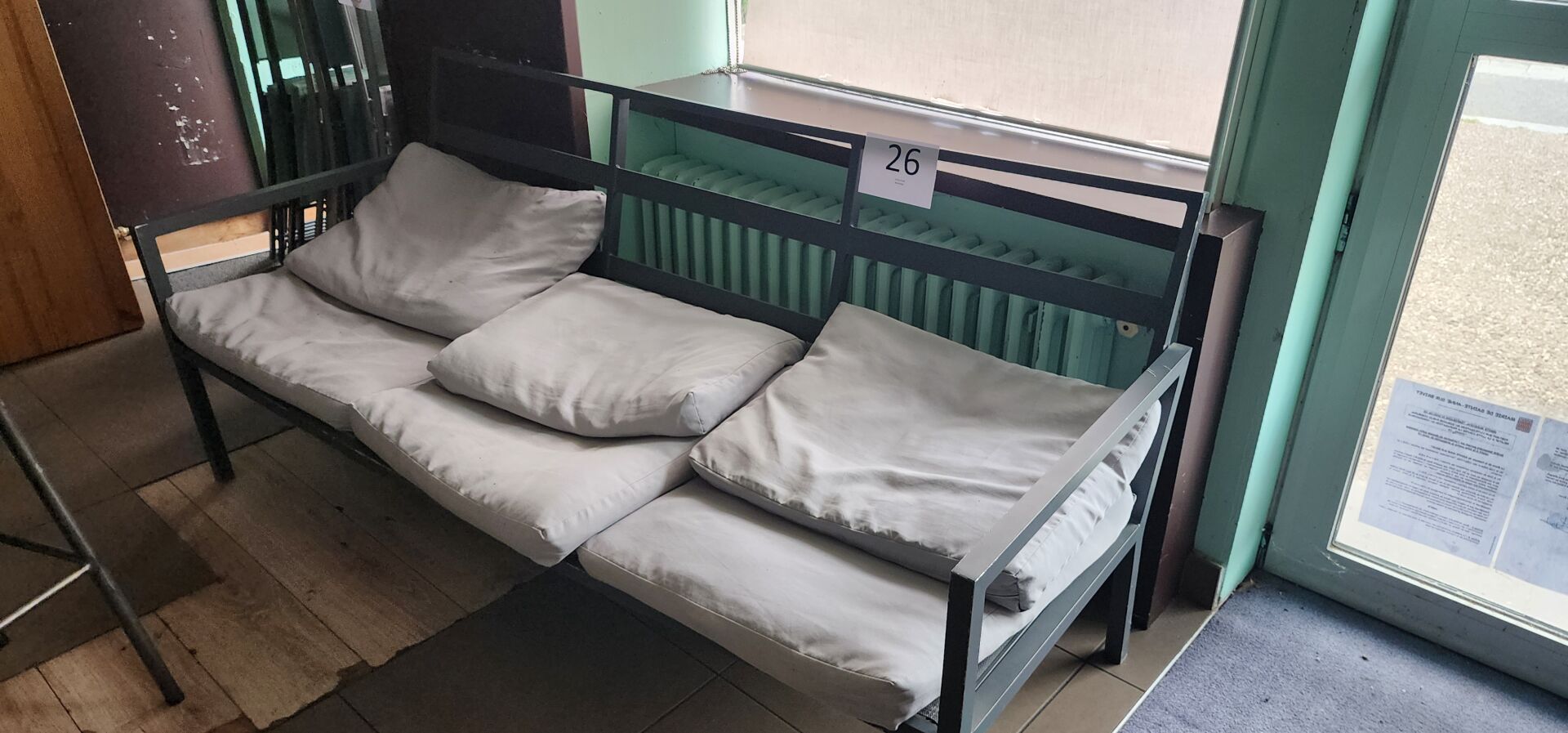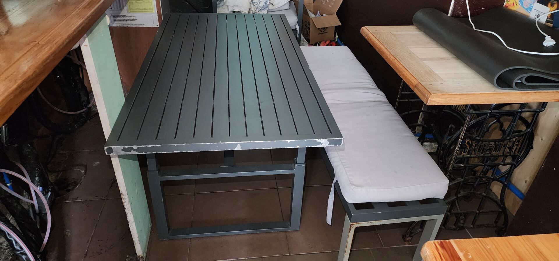 Salon extérieur, comprenant : 1 banquette métal gris (186 x 80cm) avec coussins, 1 table basse métal gris (140 x 72cm), 1 banc métal gris avec coussins, 1 fauteuil métal gris avec coussins