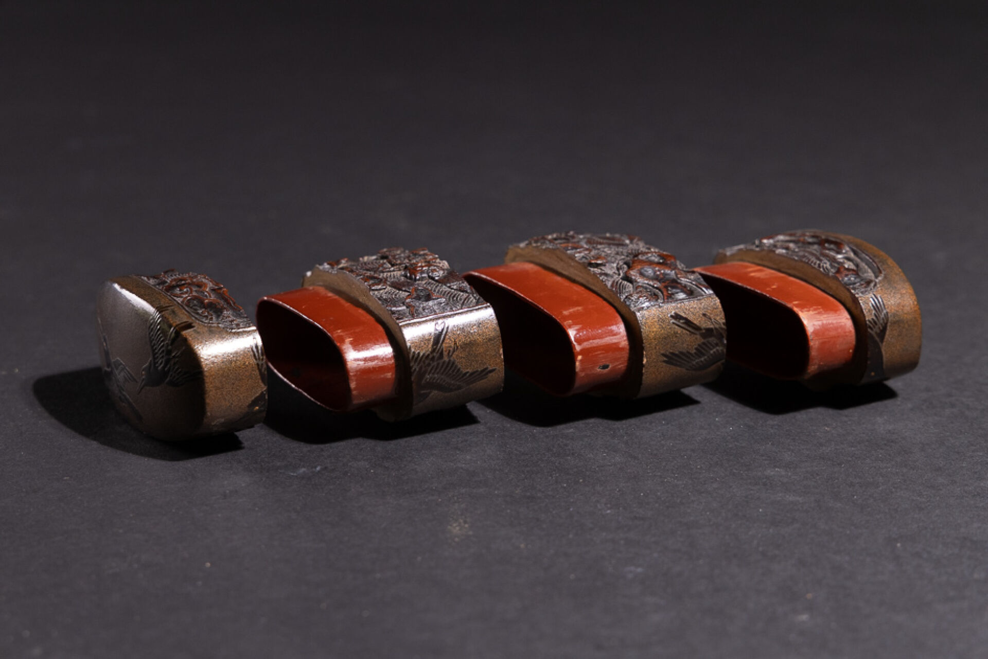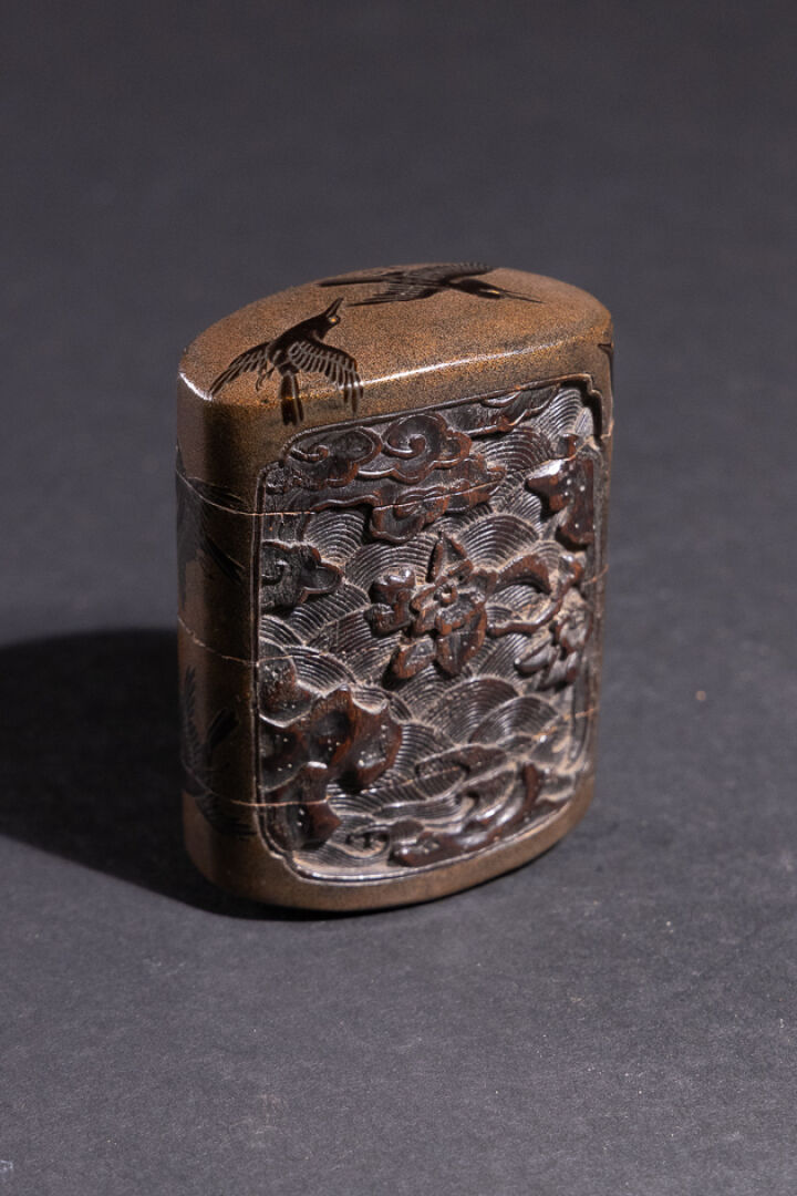 Inro en bois sculpté et laqué, l'avers à décor de fleurs, le revers d'un faucon branché, les montants figurant les corneilles voltant en laque. Travail japonais - XIX siècle. Haut. : 10.5 cm - Larg. : 8.5 cm