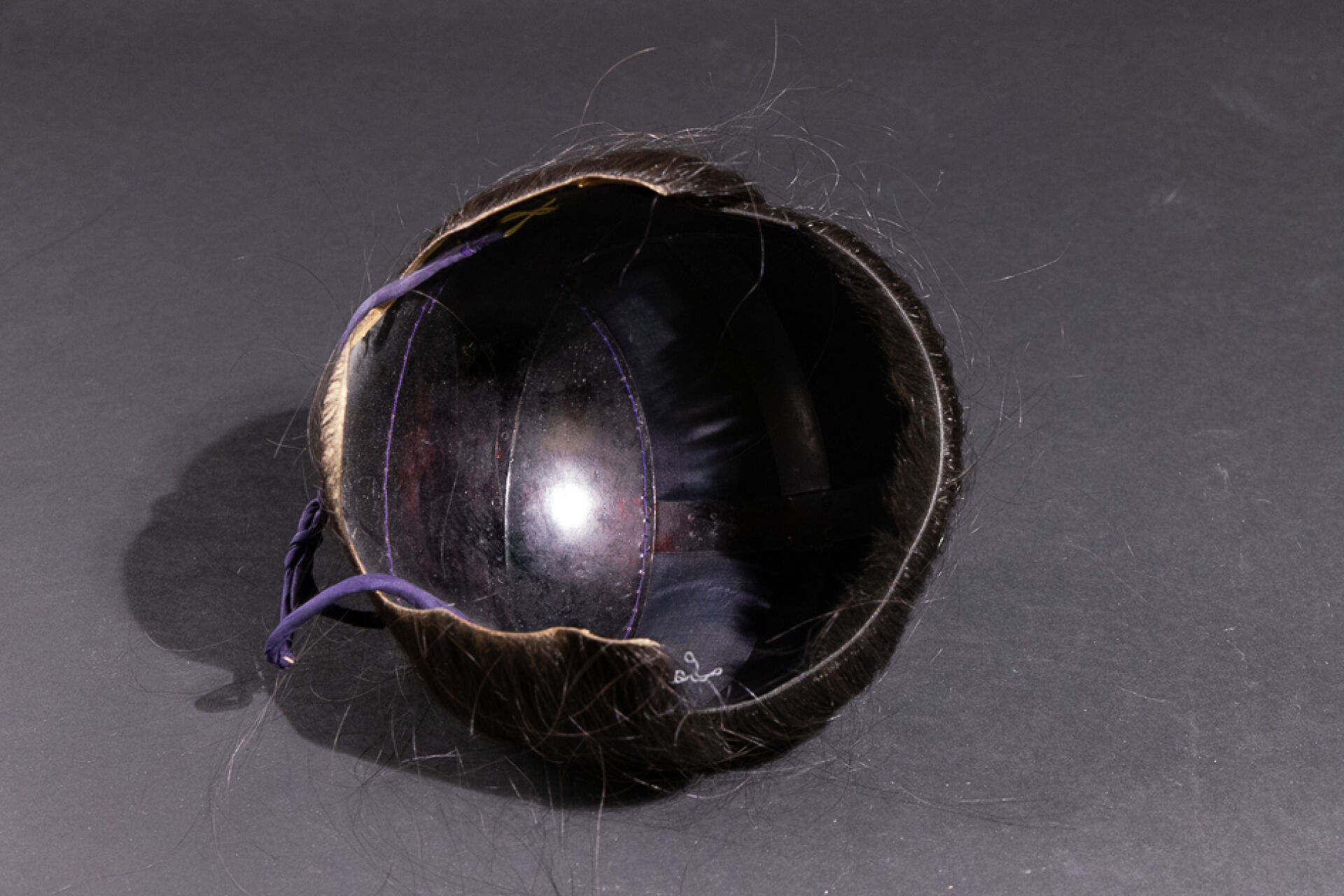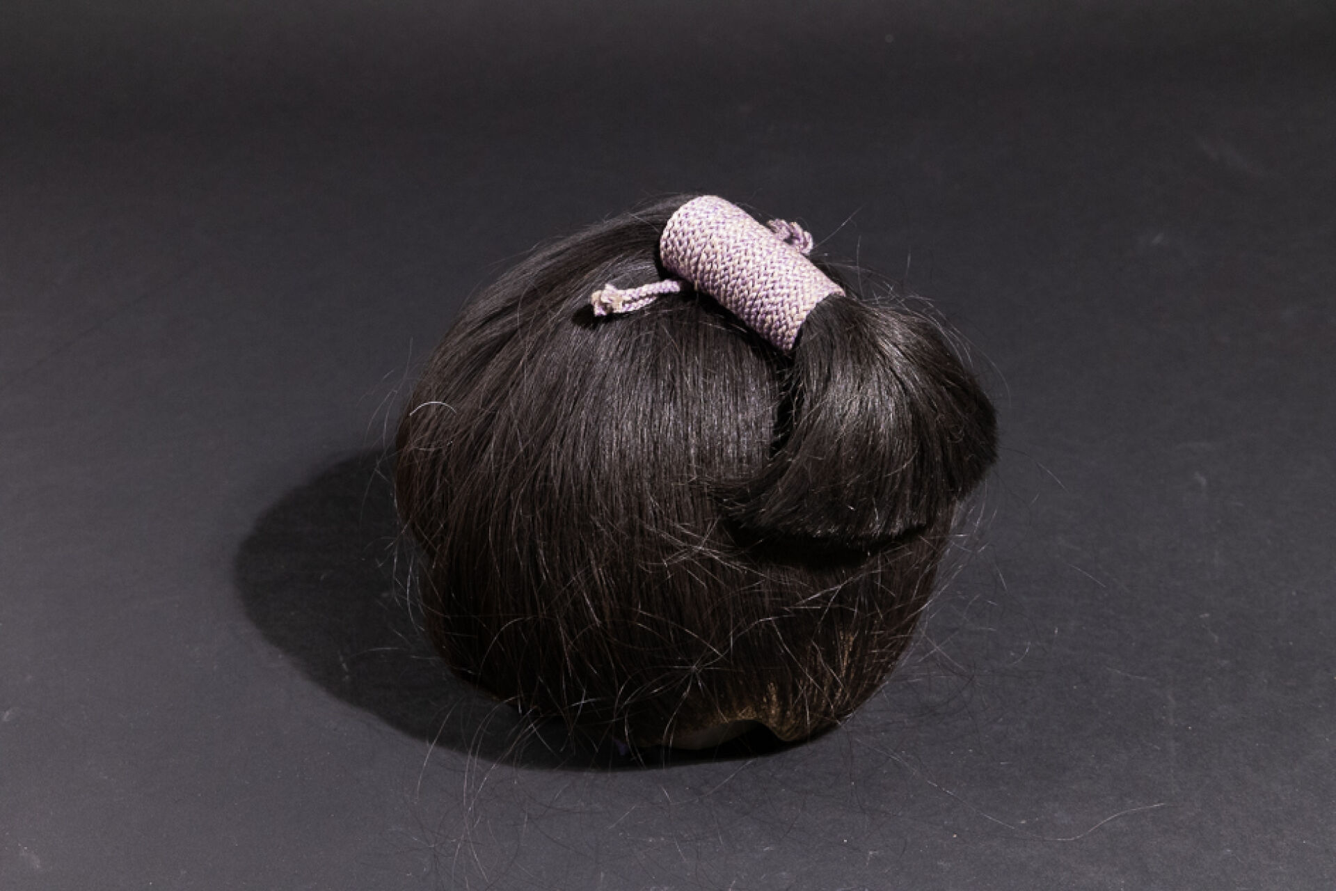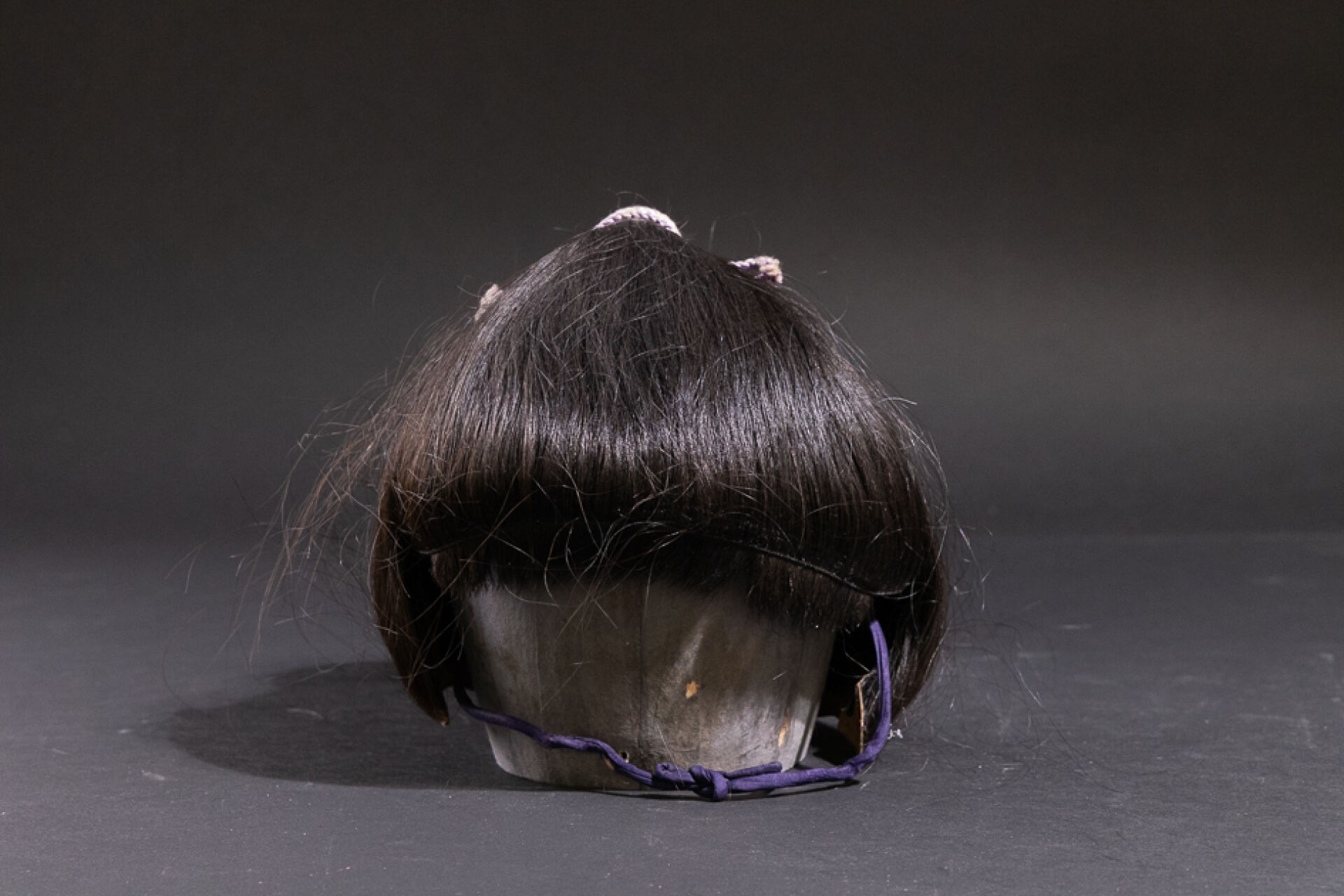 Perruque à la natte cordée sur une armature métallique et tissu. Japon, XXe siècle. Haut. : 19 cm On joint : Forme en carton.