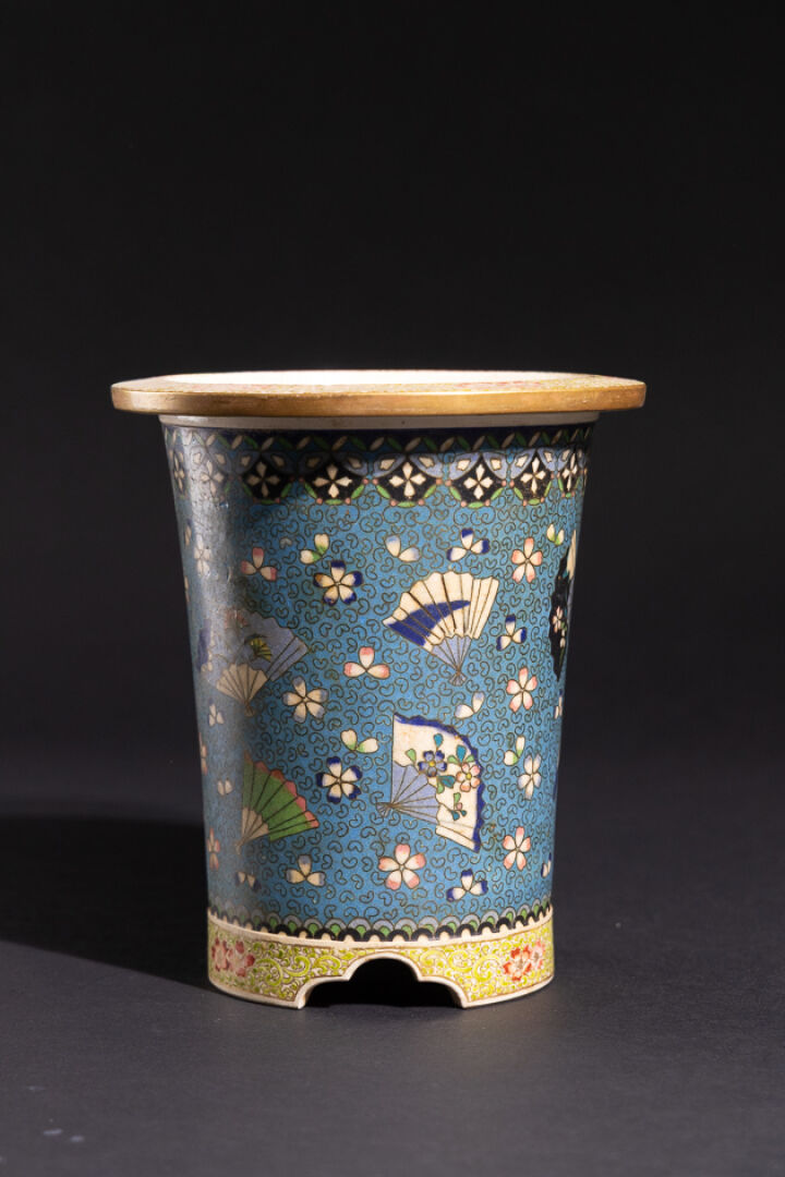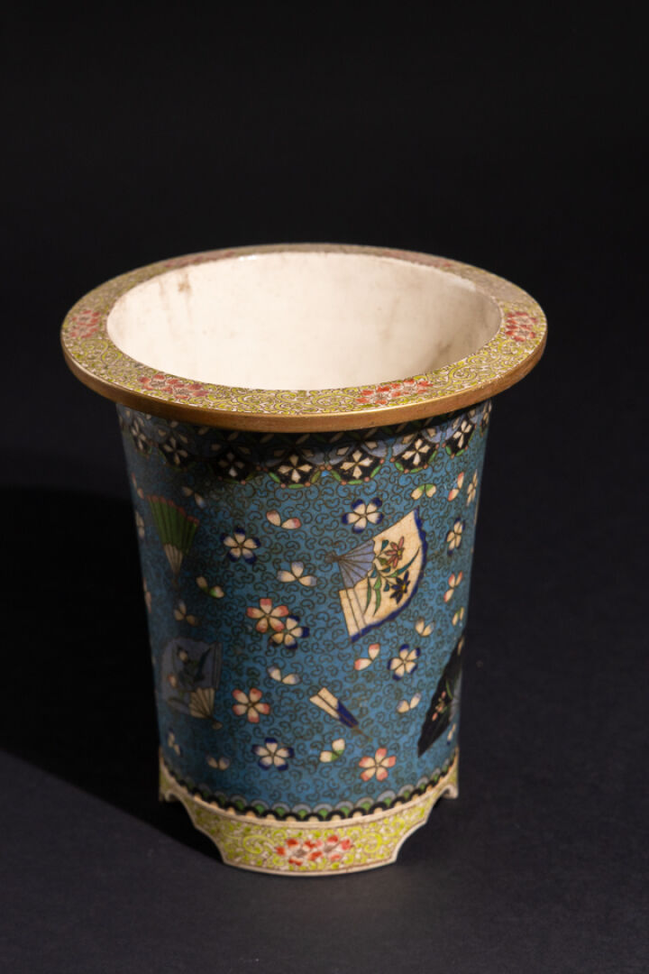 Cache-pot tubulaire à col évasé et piètement tripode trilobé en faïence et émail cloisonné à décor d'éventails et fleurettes. Cachet au revers. Style japoniste. Haut. : 22 cm - Larg. : 19 cm