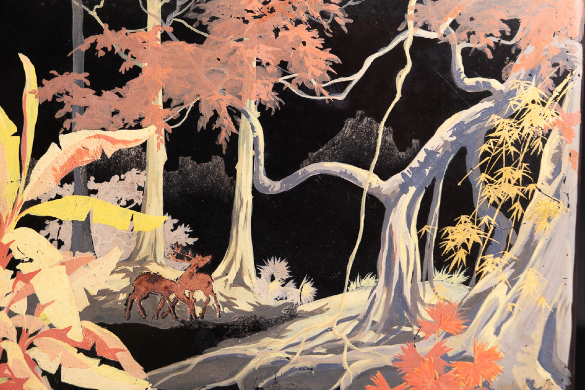 Deux panneaux de laque à décor polychrome et or sur fond noir de cervidés dans la jungle (fentes, accidents et restaurations).Signés THANH-LE. Vietnam vers 1950. Haut. : 35 cm et 23 cm - Larg. : 24,5 cm et 33 cm