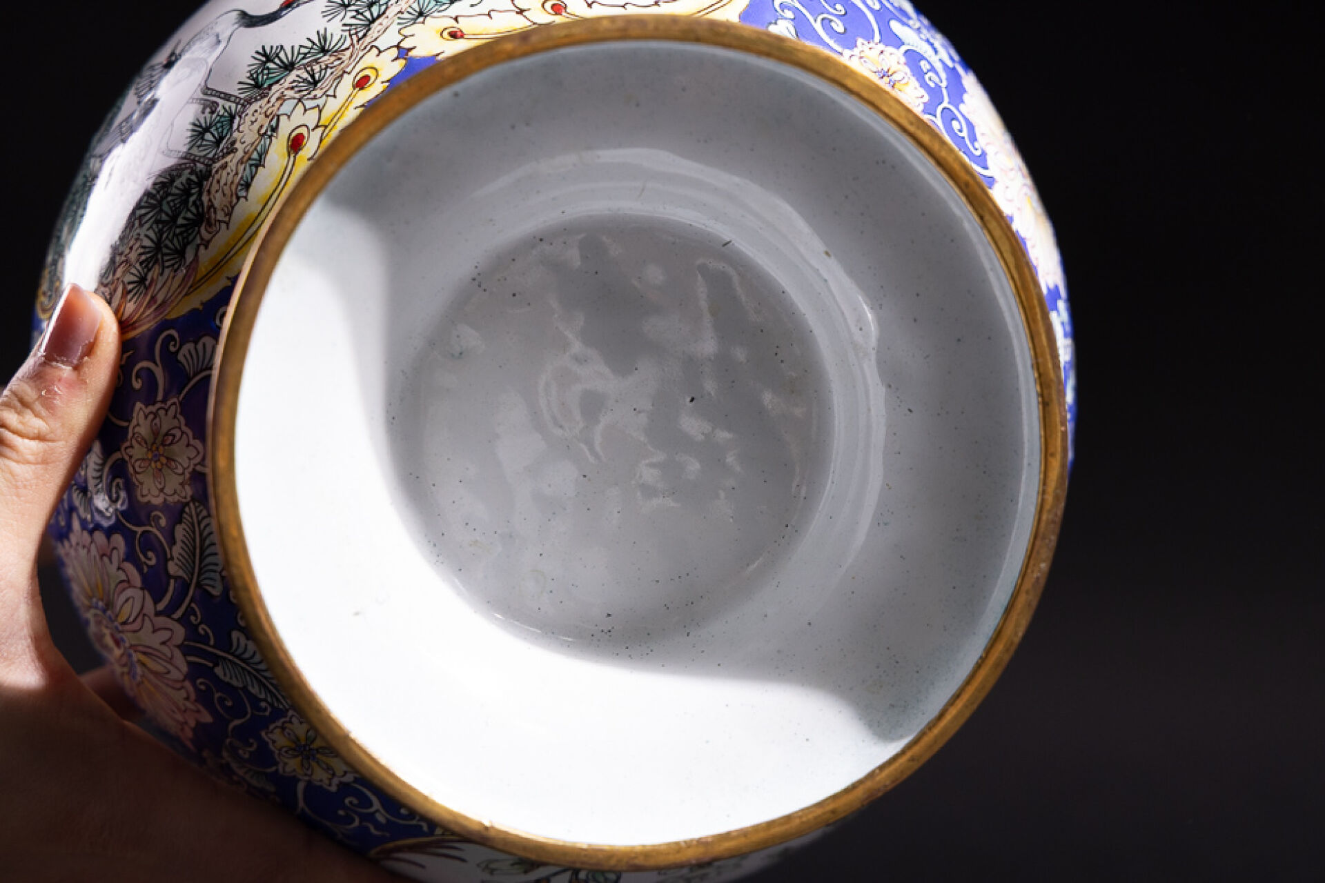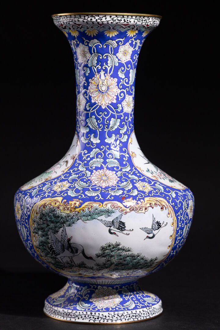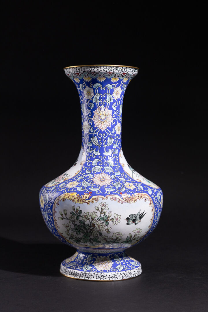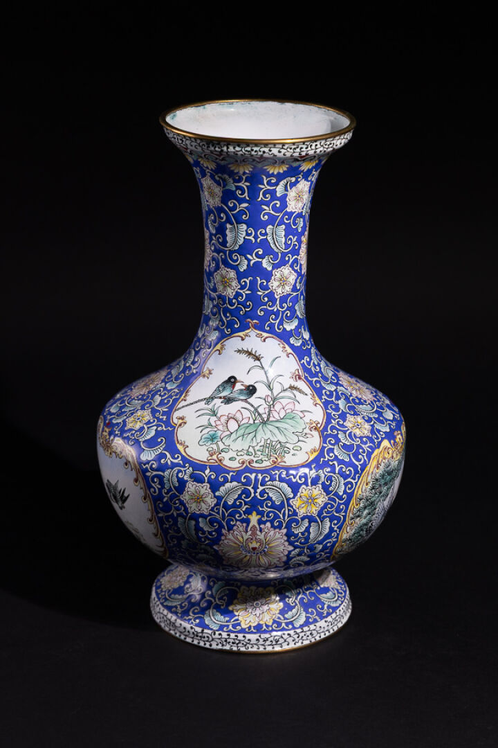Vase balustre en émail peint à décor de cartouches habités d'oiseaux sur des rinceaux fleuris sur fond bleu. Le col évasé, la panse ventrue. Chine, XXème siècle. Haut. : 37 cm