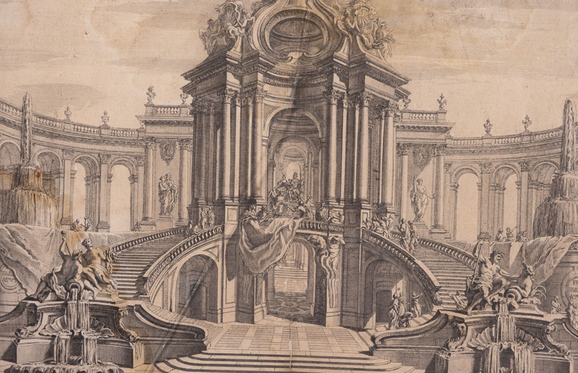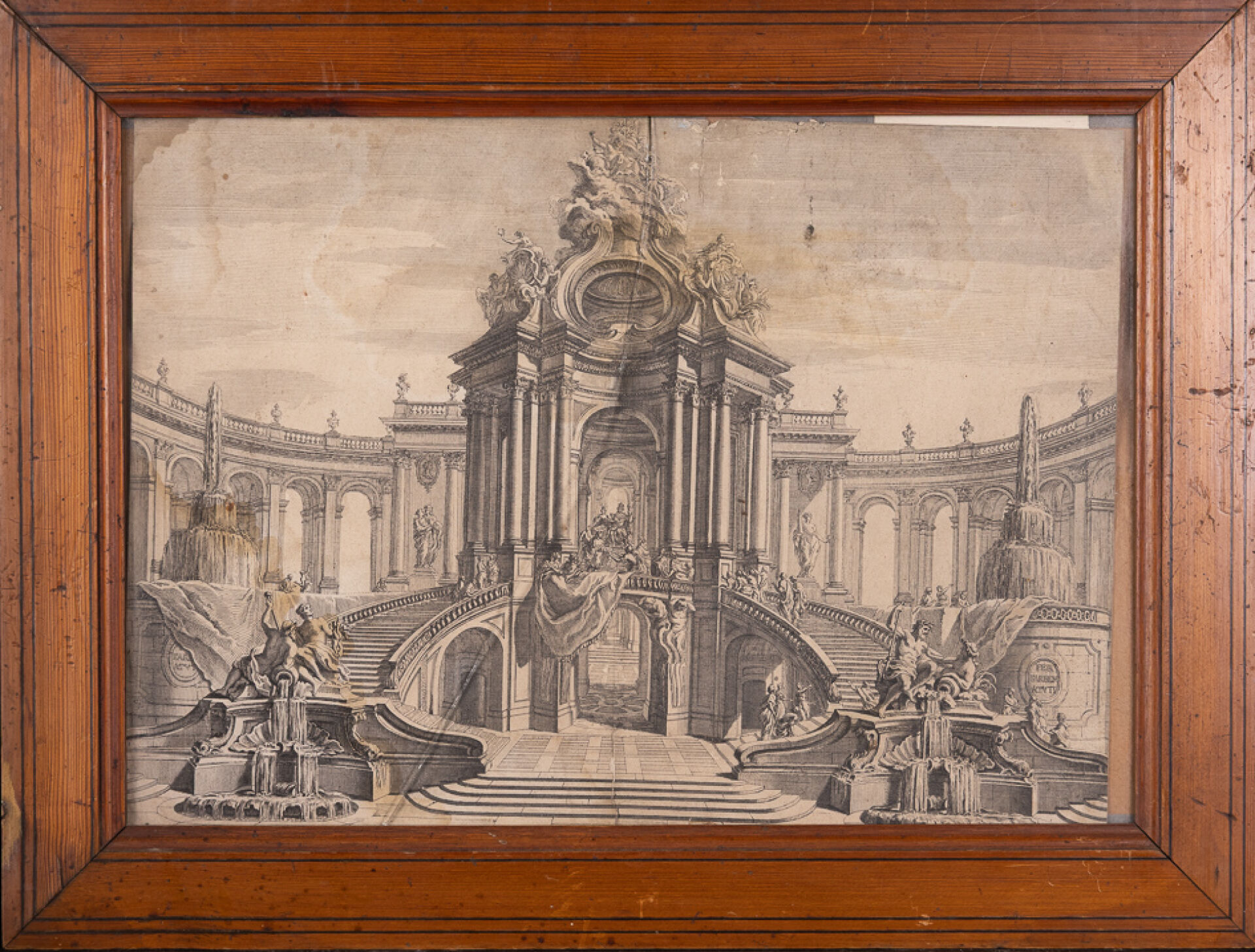 D'après Juste-Aurèle MEISSONNIER (1695-1750). Vue architecturée à la colonnade. Lithographie en noir (auréoles, marge coupée, verre cassé). Dim. à vue : Haut. : 30 cm - Larg. : 43.5 cm