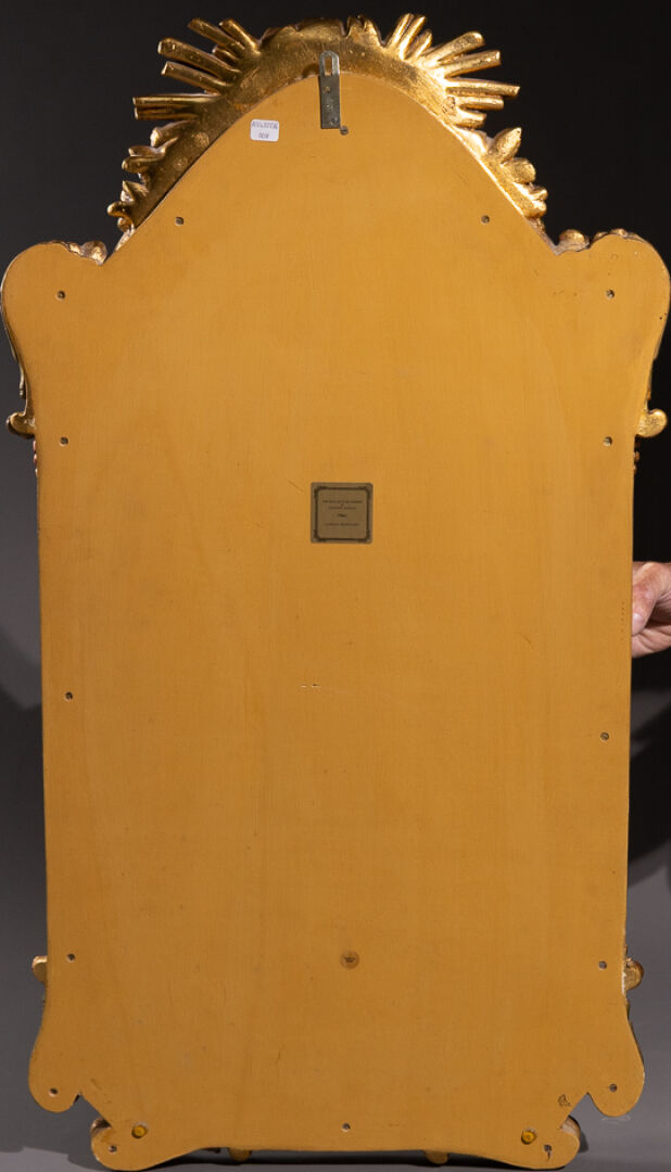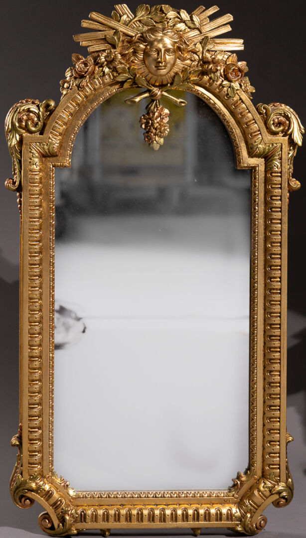 Miroir d'entre deux en bois et stuc doré aux trois ors, la partie haute centrée ornée mascaron apollinien rayonnant, à guirlandes de roses, l'encadrement à godrons et feuilles d'oves, les écoinçons à volutes. Style Louis XIV vers 1980. Haut. : 96 cm - Larg. : 55 cm