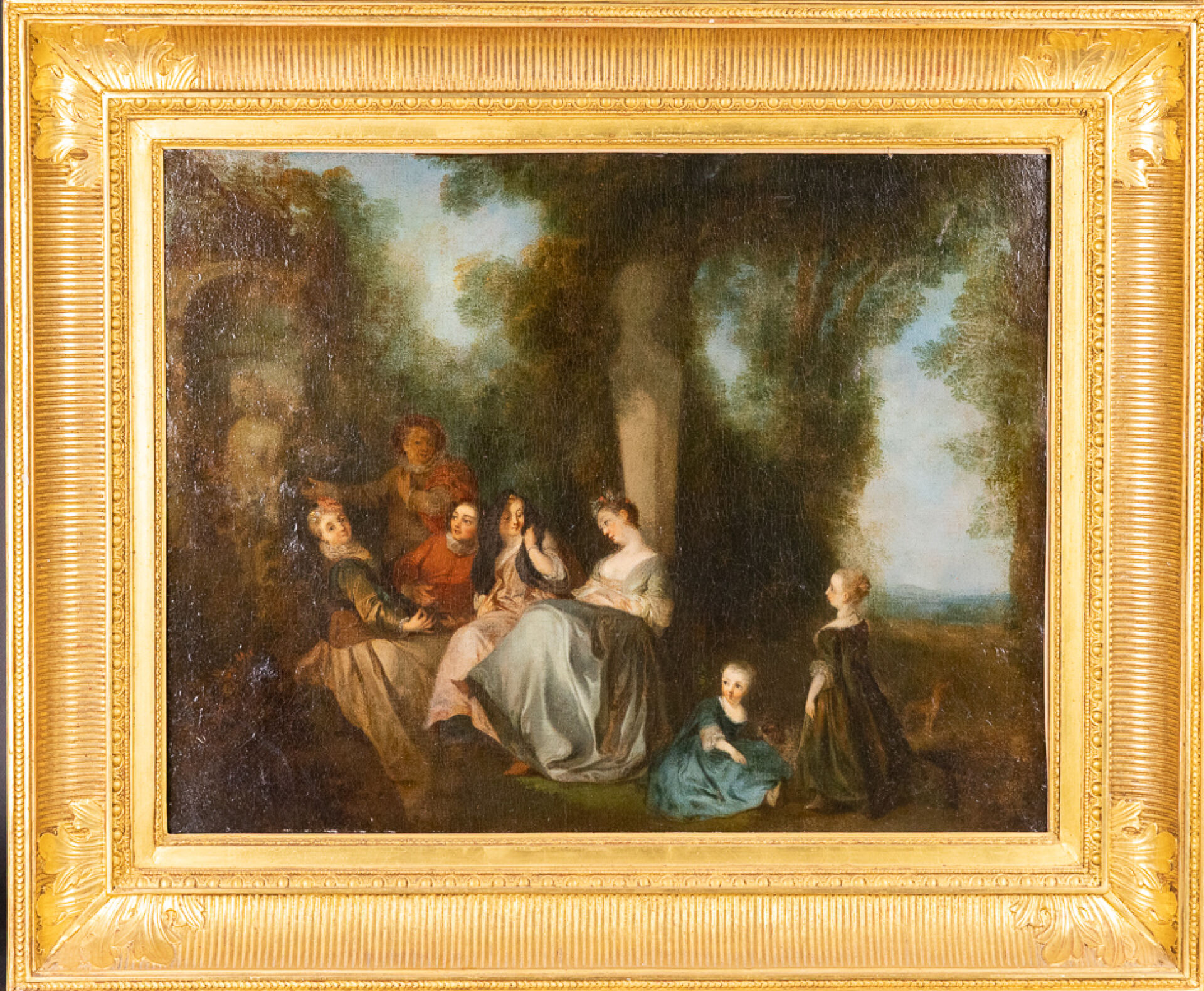 École Française du XVIIIe siècle, d'après Nicolas LANCRET. Musiciens dans un parc Huile sur toile, reprise de la composition de Lancret conservée à l'Ermitage - Saint Petersbourg (restaurations anciennes). Haut. : 58,5 cm - Larg. : 75 cm Expertise réalisée par le Cabinet TURQUIN.