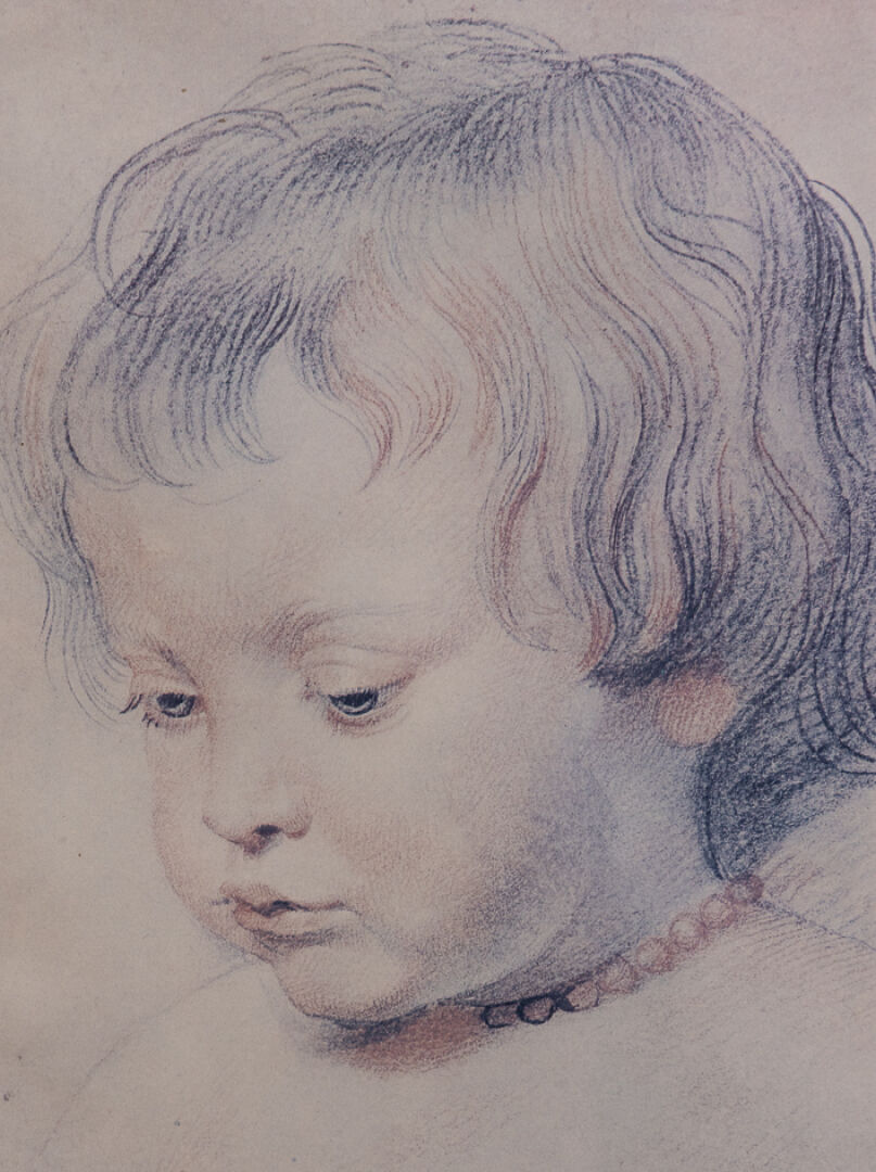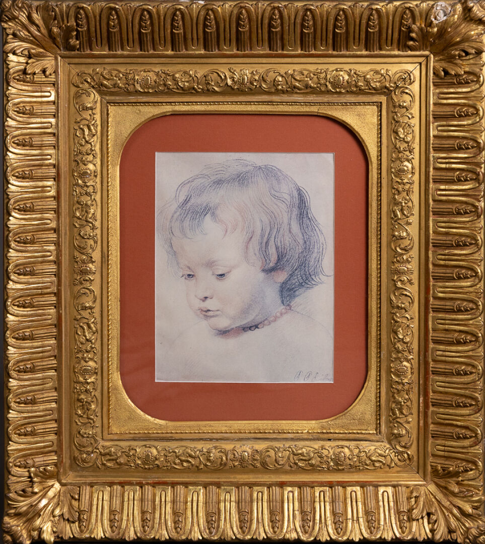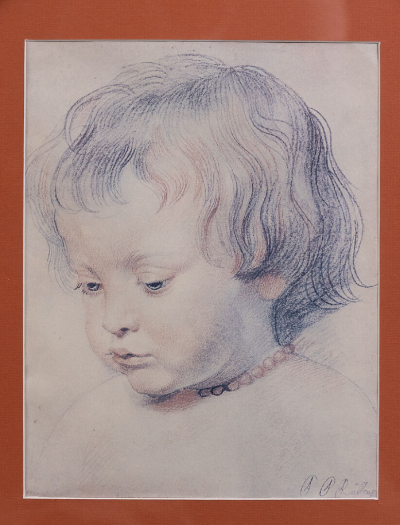 D'après Pierre Paul RUBENS (1577-1640). Tête de nourrisson au collier. Reproduction. Dim. à vue : Haut. : 30.5 cm - Larg. : 24 cm