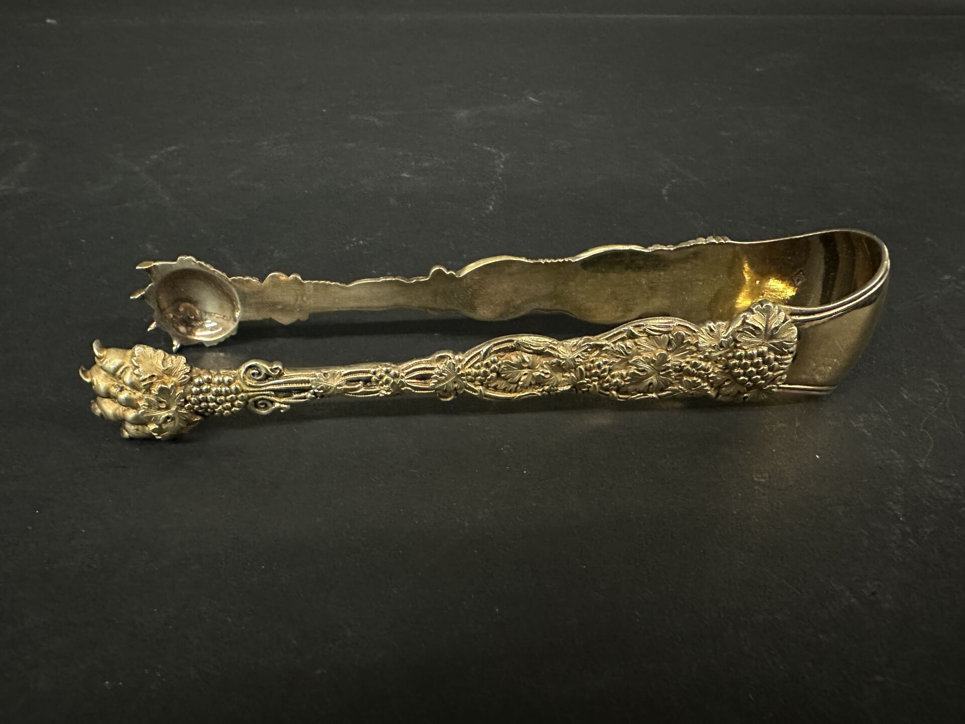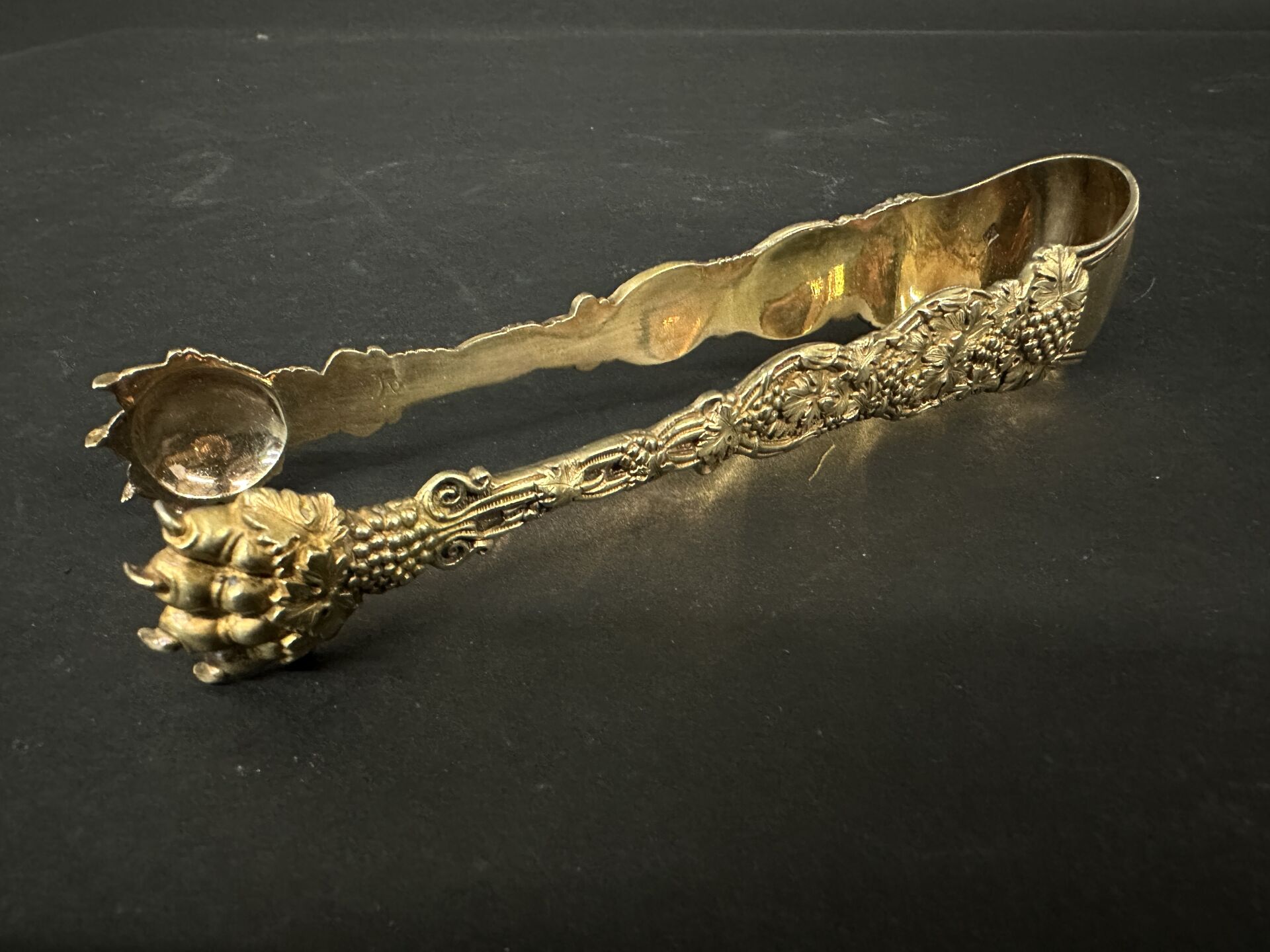 Pince à glaçons en argent doré à décor de pampres de vignes, monogrammée, terminée par des griffes de lion. Poinçon Cérès (garantie de Paris, 1819-1838). Poids : 100 g