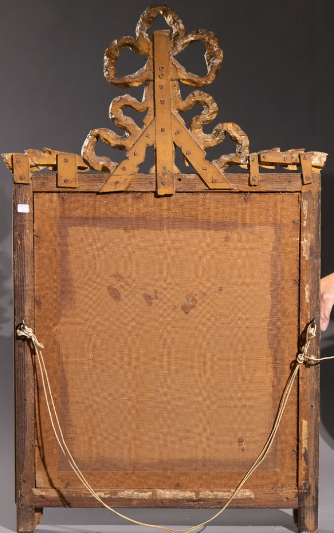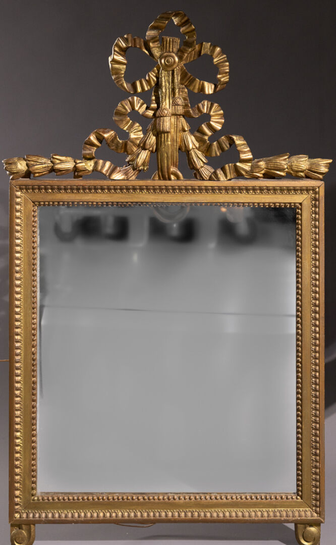 Miroir en bois stuqué redoré, le fronton à rubans noués, l'encadrement à frise de perles et feuilles d'ove, deux petits pieds à enroulement à l'amortissement (petits accidents et manques). Style Louis XVI. Haut. : 109 cm - Larg. : 67 cm