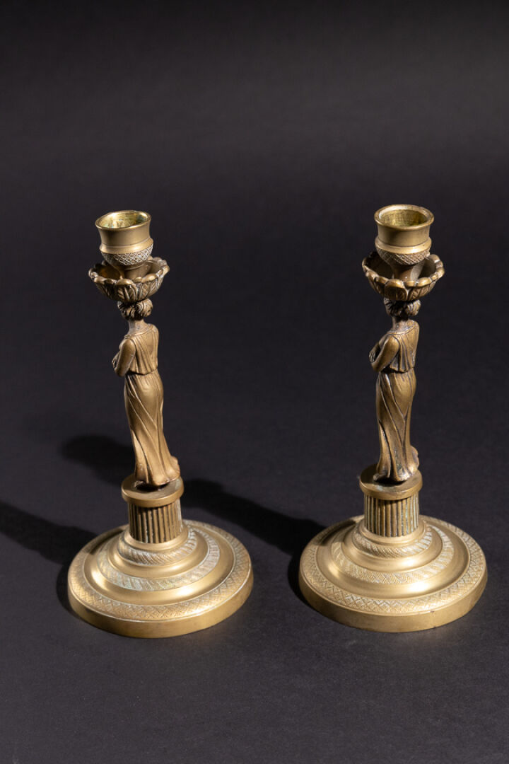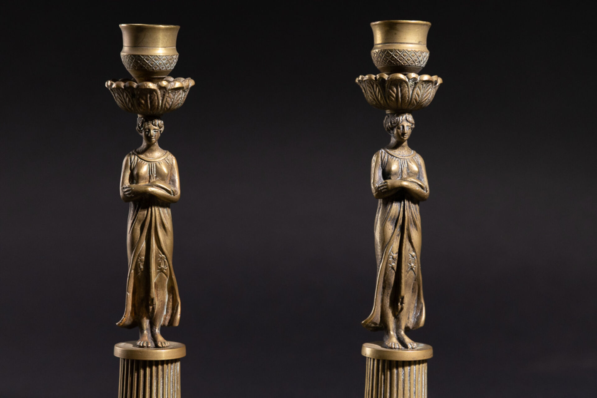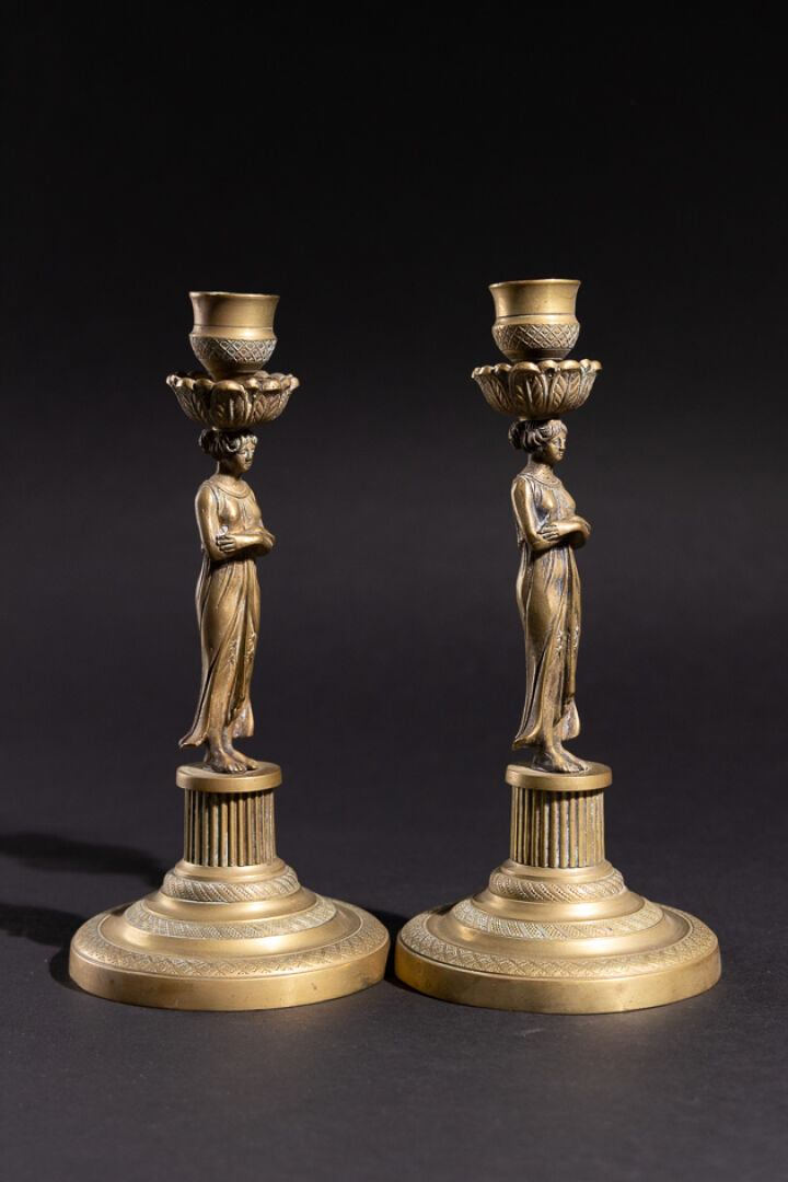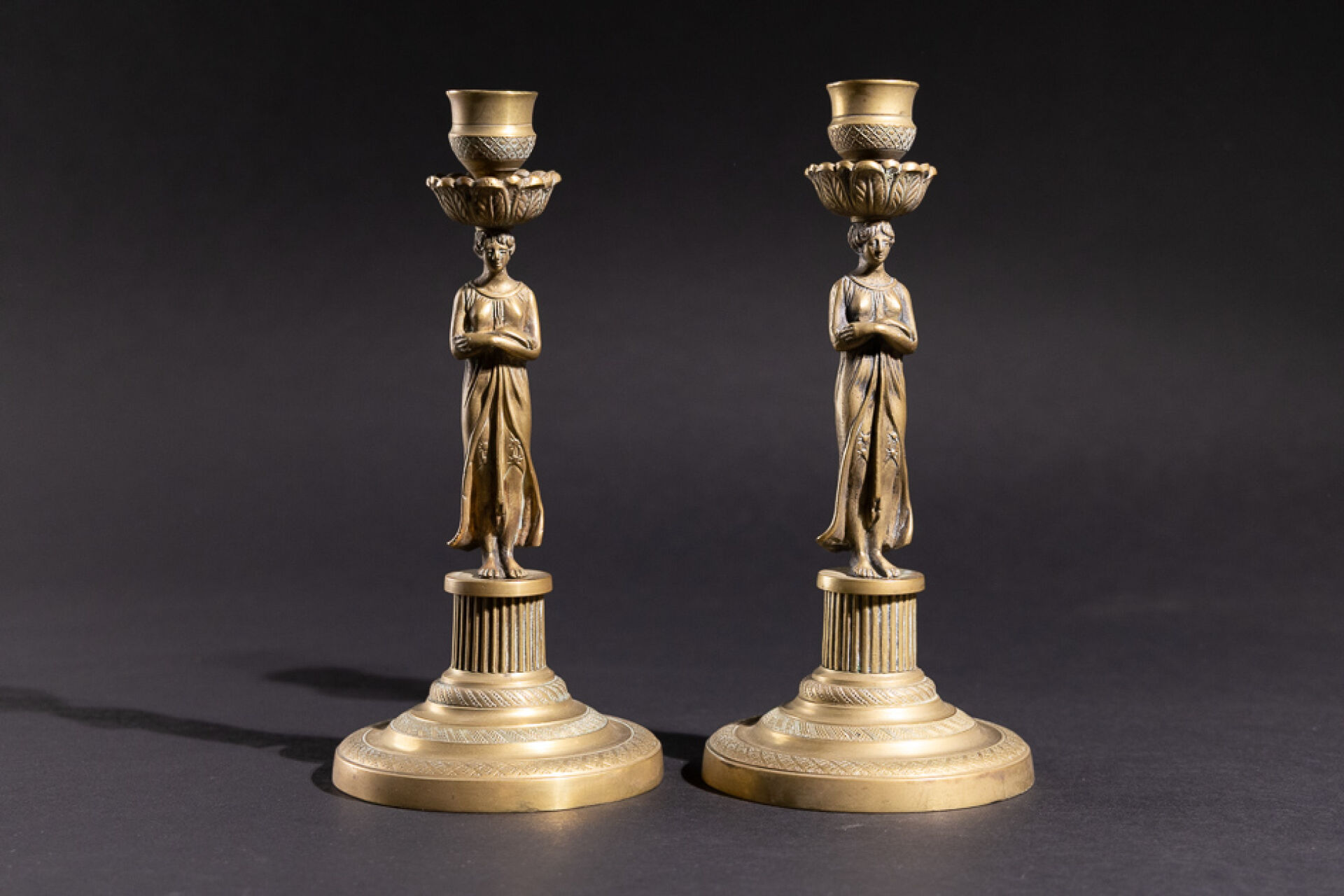 Paire de bougeoirs en laiton, le fût en forme de cariatide debout sur une demi-colonne (chocs). Style néo-antique. Haut. : 23.5 cm
