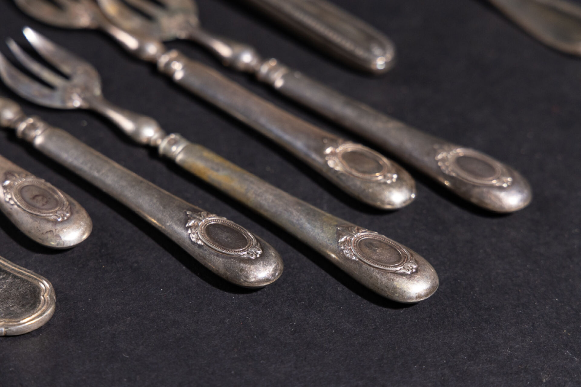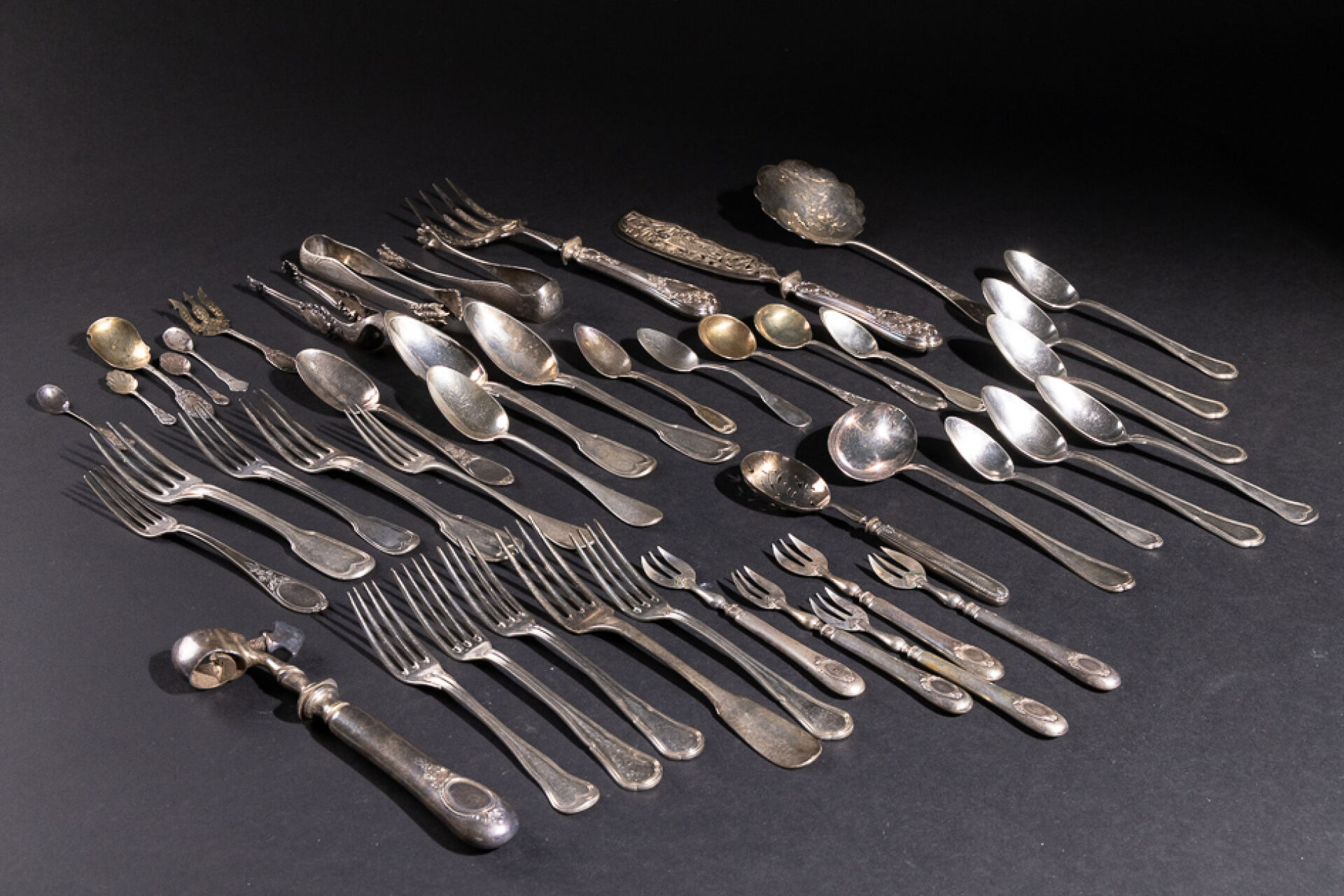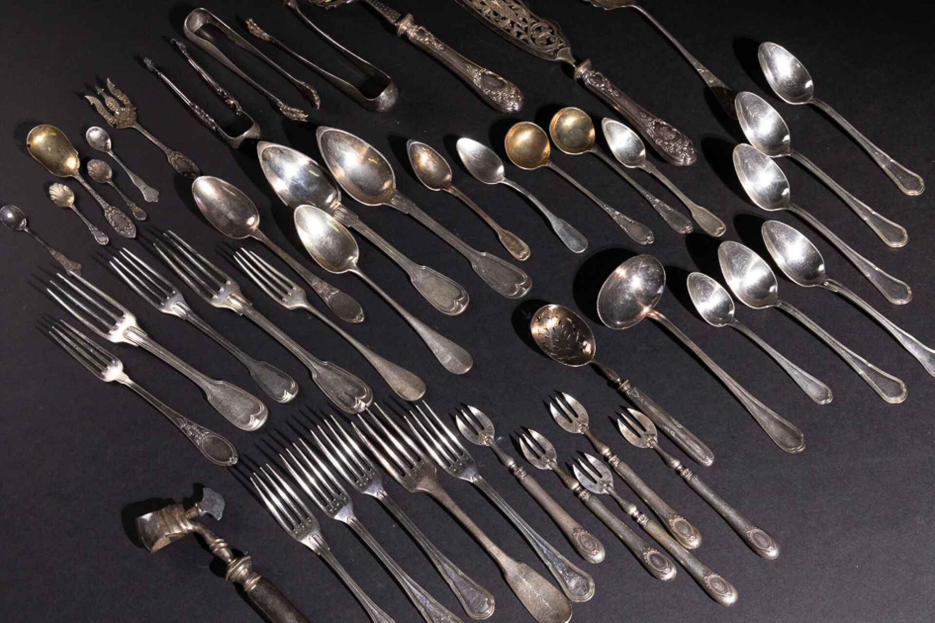 Ensemble en argent comprenant : - Trois pinces à sucre en argent à pattes griffues. Poids : 127 g ; - Paire de cuillères à sauces, la spatule à filet coquille rocaille, monogrammée MG, le cuilleron en vermeil. Poids : 55 g ; - Cuillère et trident à friandises, la spatule feuillagée et mascaron. Poids : 33 g ; - Cuillère à fraises ciselée de fleurs dans le style Art-Nouveau. Orfèvre Henri SOUFFLOT. Poids : 58 g ; - Deux cuillères à saleron à cuilleron coquille et manche ciselé de muguet. Style Art Nouveau. Poids : 10 g ; - Deux cuillères à saleron à spatule trilobée. Poids : 10 g ; - Couvert de baptême, la spatule fleurie marquée Marcel. Poids : 85 g ; - Couvert de baptême, la spatule à la ceinture marquée Amélie GOULAY, son oncle. Orfèvre : Emile PUIFORCAT. Poids : 98 g ; - Trois cuillères à dessert dépareillées, dont orfèvre Emile PUIFORCAT pour l'une. Poids : 60 g ; - Couvert modèle filet contour, la spatule monogramée GJ. Poids : 160 g ; - Fourchette à entremet modèle filet contour, la spatule monogrammée GJ/15. Poids : 47 g ; - Fourchette et cuillère modèle filet contour, la cuillère monogrammée LS. Poids : 157 g ; Poinçon Minerve. Poids total : 890 g On joint : Ensemble en argent fourré comprenant : - Cinq fourchettes à dessert ; - Spatule au médaillon perlé ; Poids brut total : 107 g Ensemble en métal argenté comprenant : - Quatre couverts à entremet (manque une cuillère), la spatule à filet trilobé ; - Couvert à filet contour ; - Fourchette monogramée LEV ; - Louche à crème et cuillère à dessert la spatule trilobée filet ; - Cuillère à saupoudrer ; - Manche à gigot ; - Couvert de service à poissons.