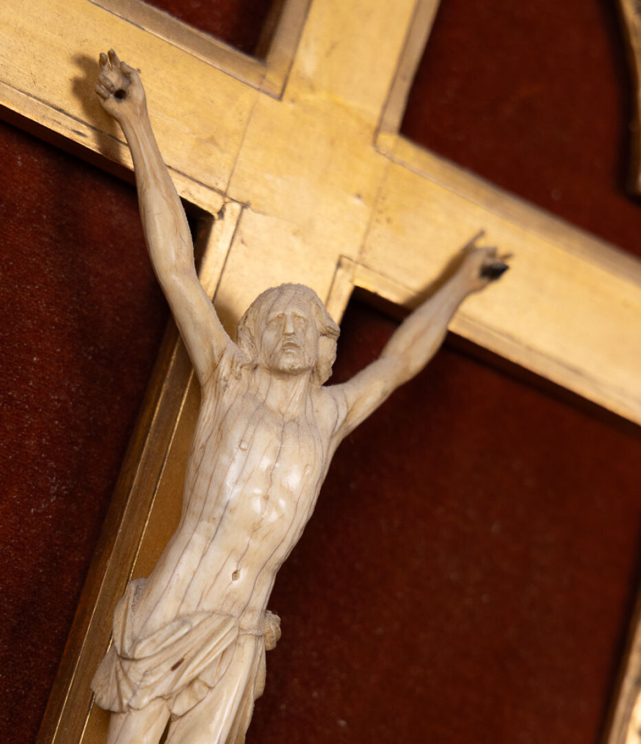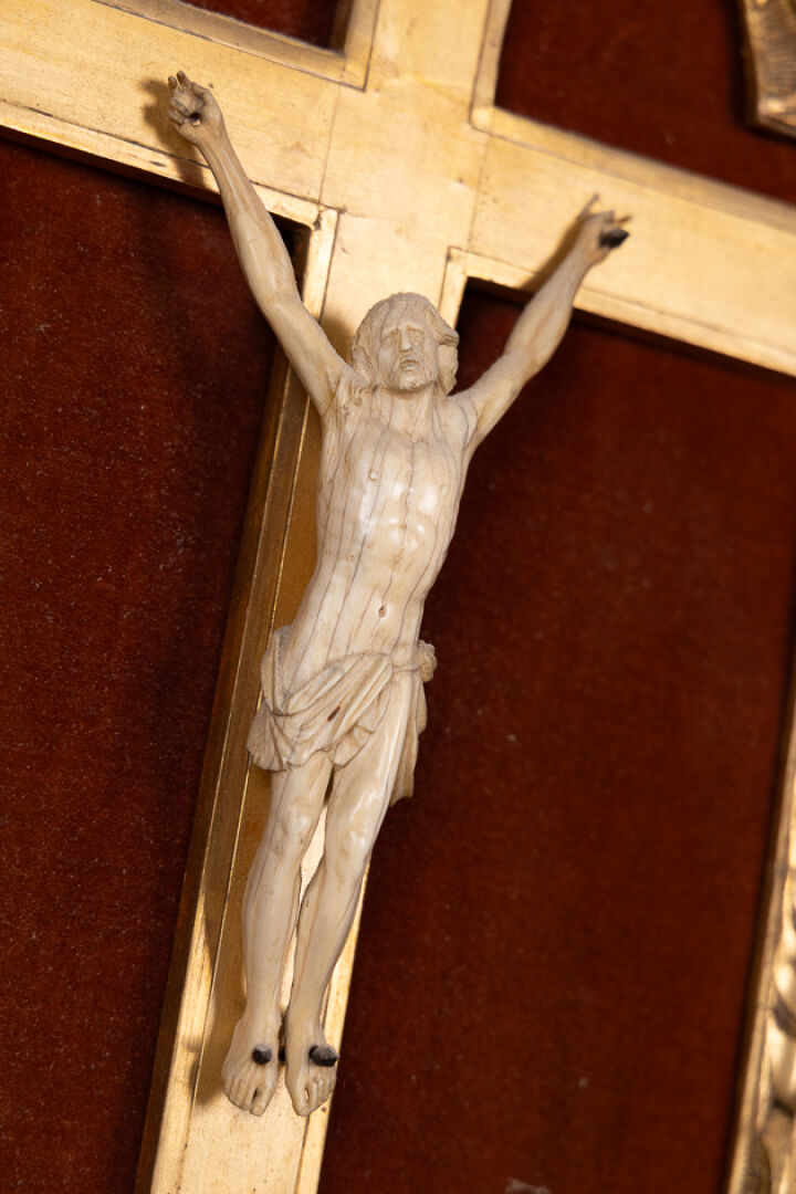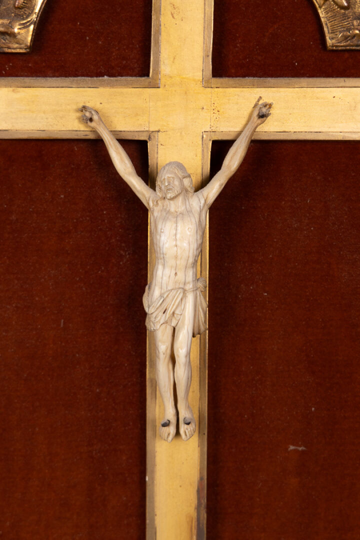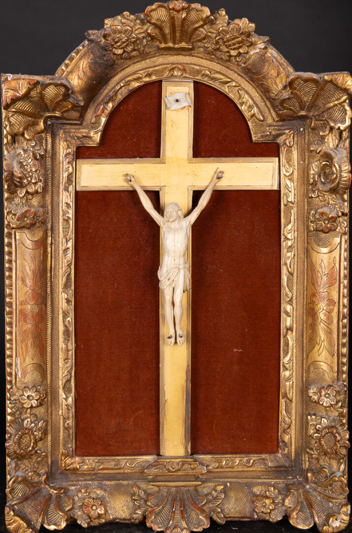 Crucifix janséniste en ivoire sculpté, le Christ aux bras tendus, les yeux implorants, présenté sur un cadre en bois doré d'époque Louis XIV. Marqué à l'encre au revers M. DESAUXNOU. Dim. du Christ : Haut. : 19 cm - Larg. : 11 cm - Dim. du cadre : Haut. : 54 cm - Larg. : 36 cm Un certifcat CITES sera remis à l'acquéreur.