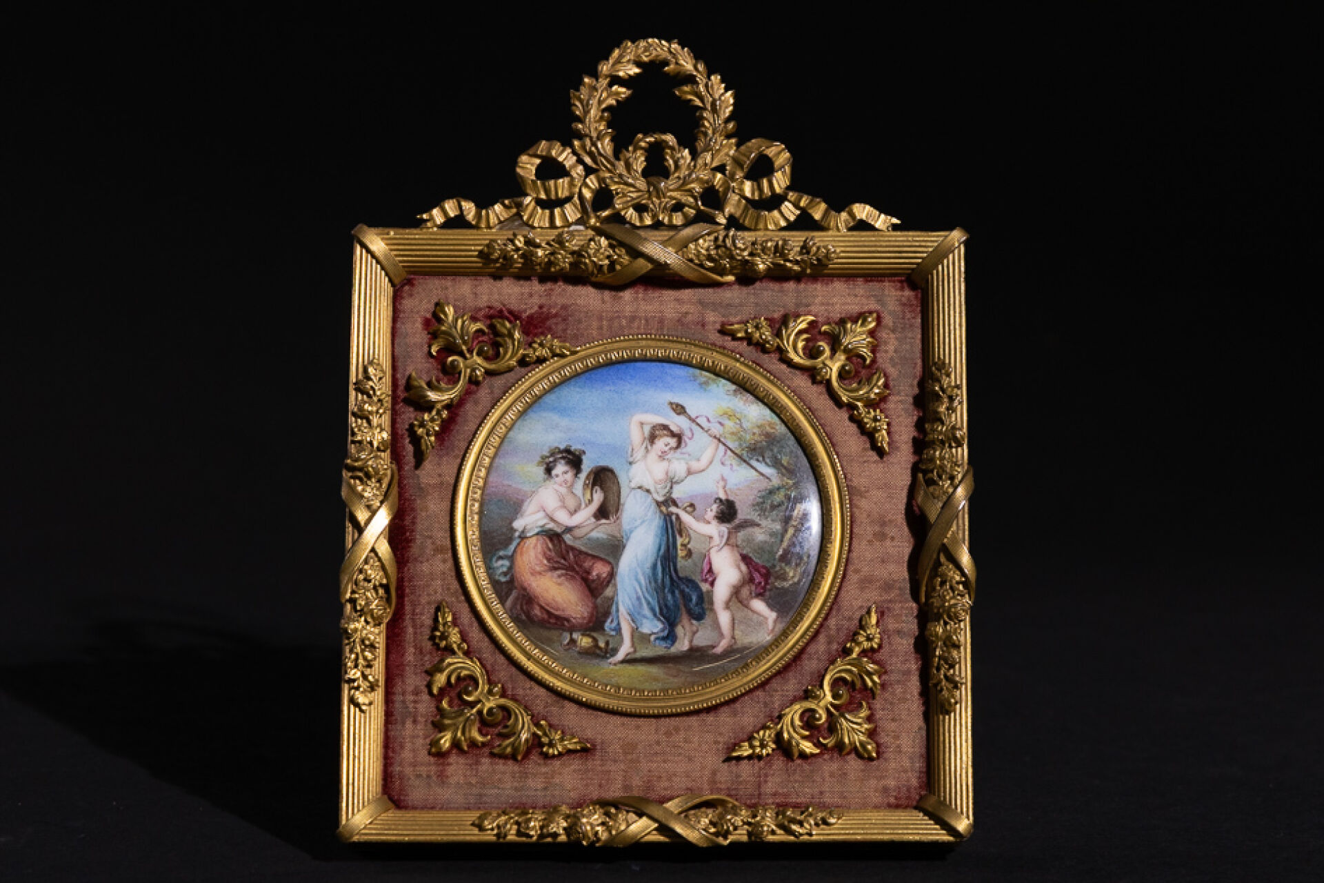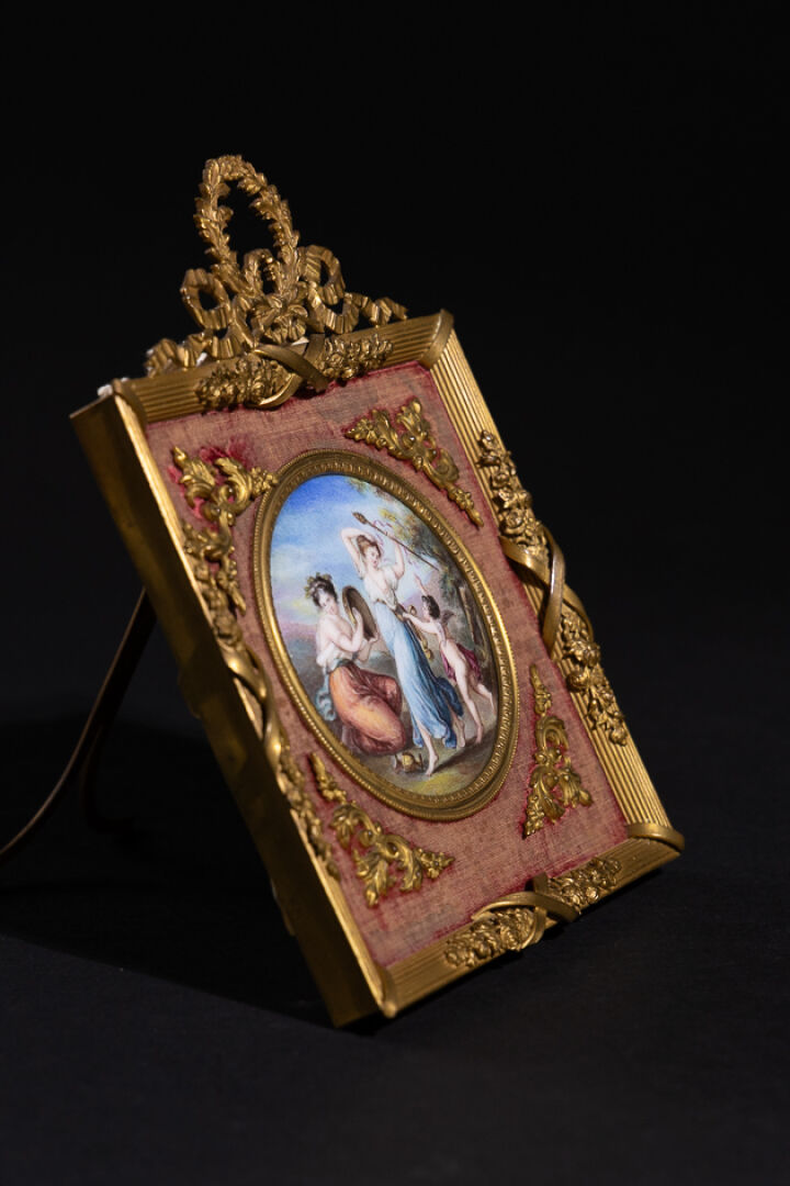 Dans le goût d'Angelica KAUFFMANN (1741-1807). Concert des ménades au cupidon. Miniature en cuivre émaillé polychrome. Diam. : 8 cm Présentée dans un cadre en bronze ciselé à fronton. Style Louis XVI. Haut. : 19.5 cm - Larg. : 14 cm