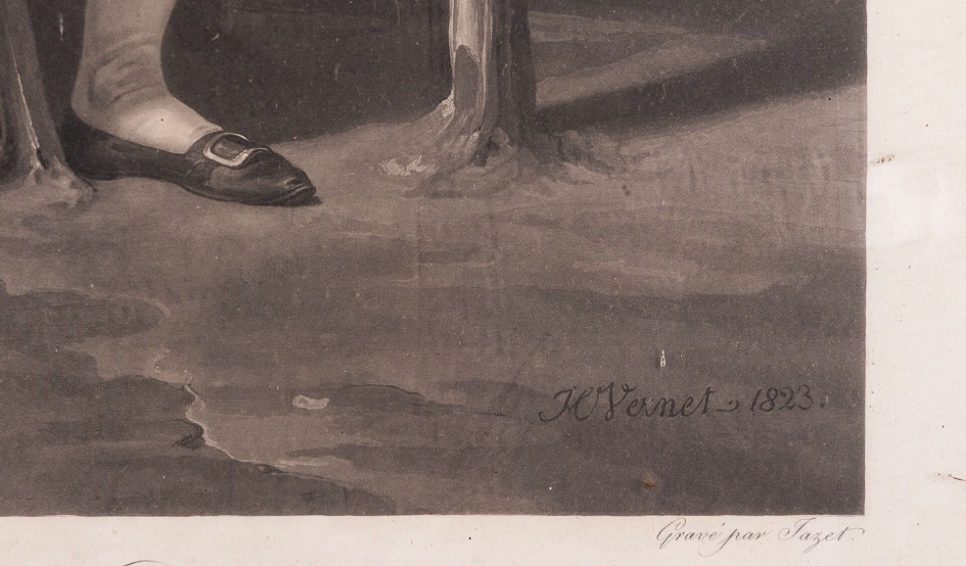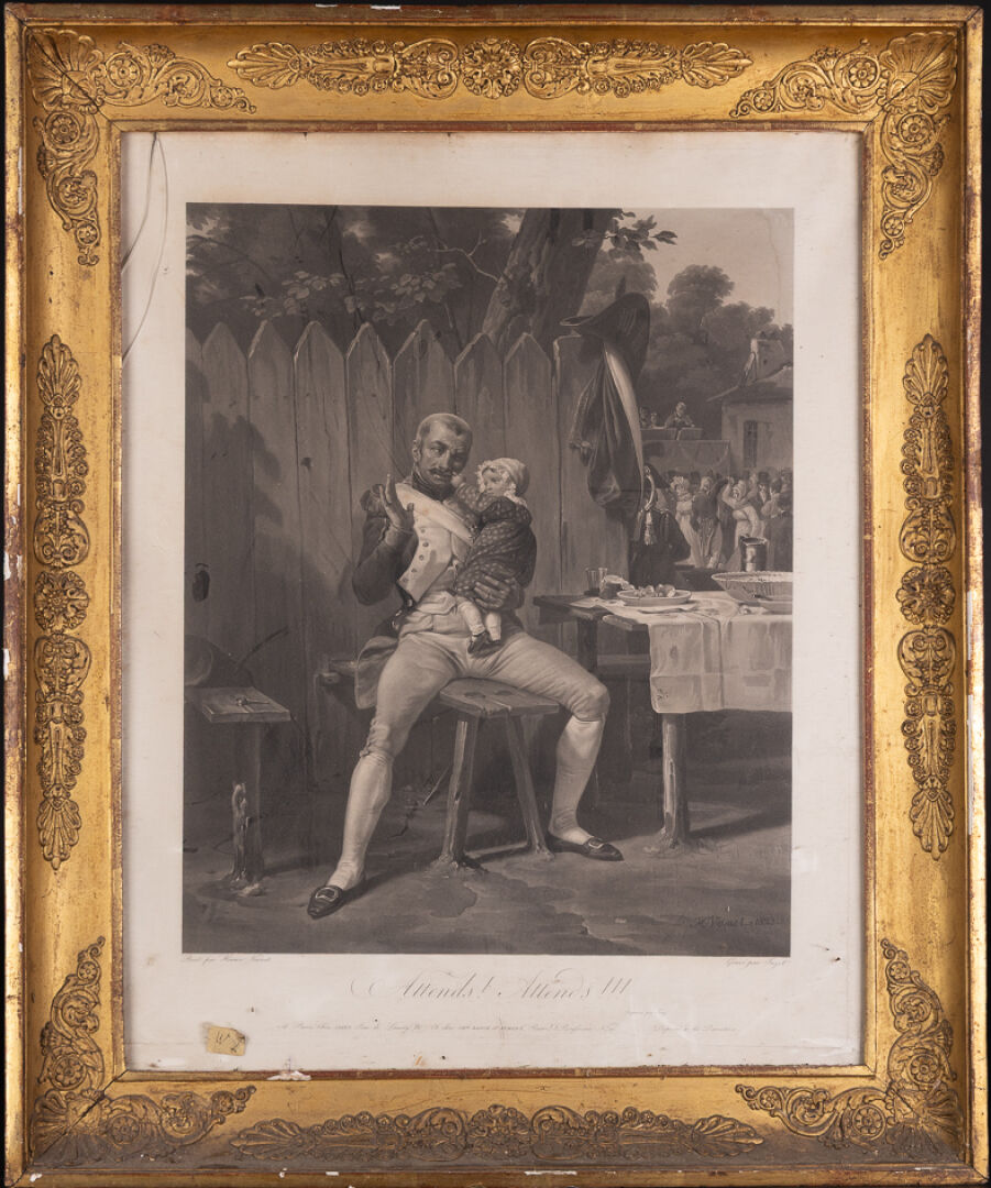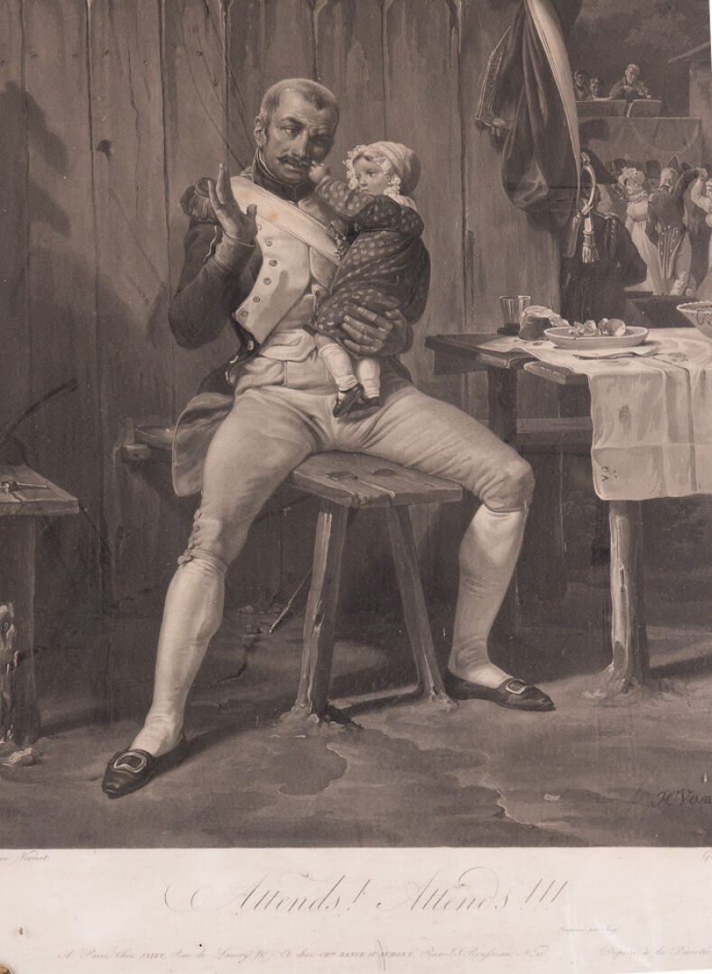 D'après Horace VERNET (1789-1863) gravé par JAZET. "Attends, Attends" - Grognard et sa fille Lithographie en noir titrée et annotée. Dim. du sujet : Haut. : 46.5 cm - Larg. : 37.5 cm