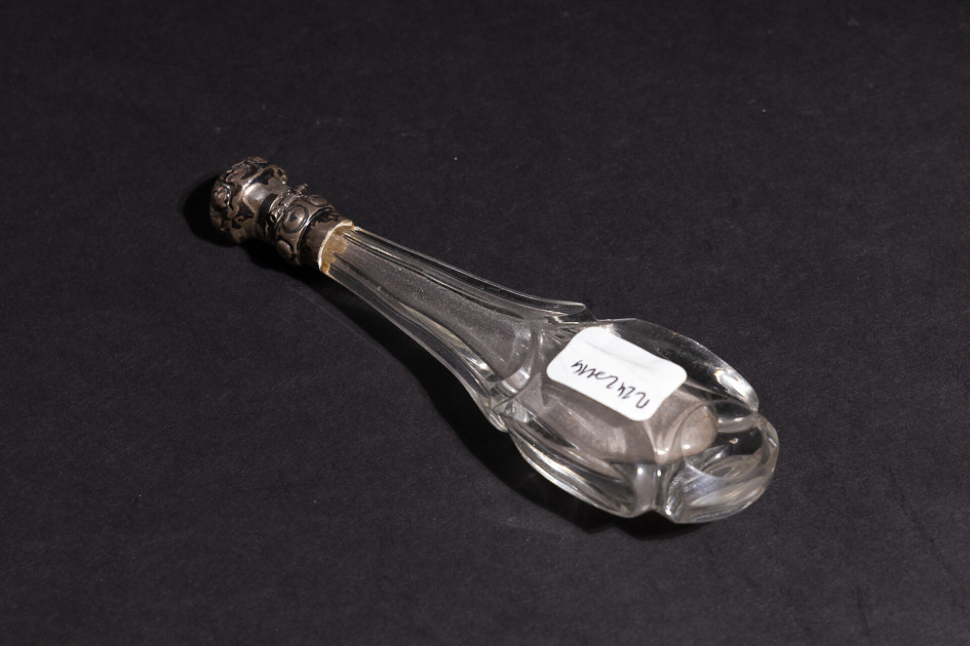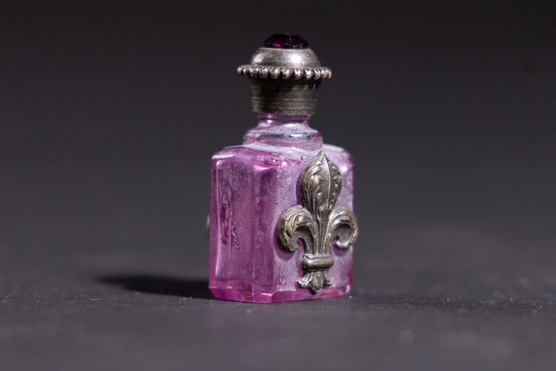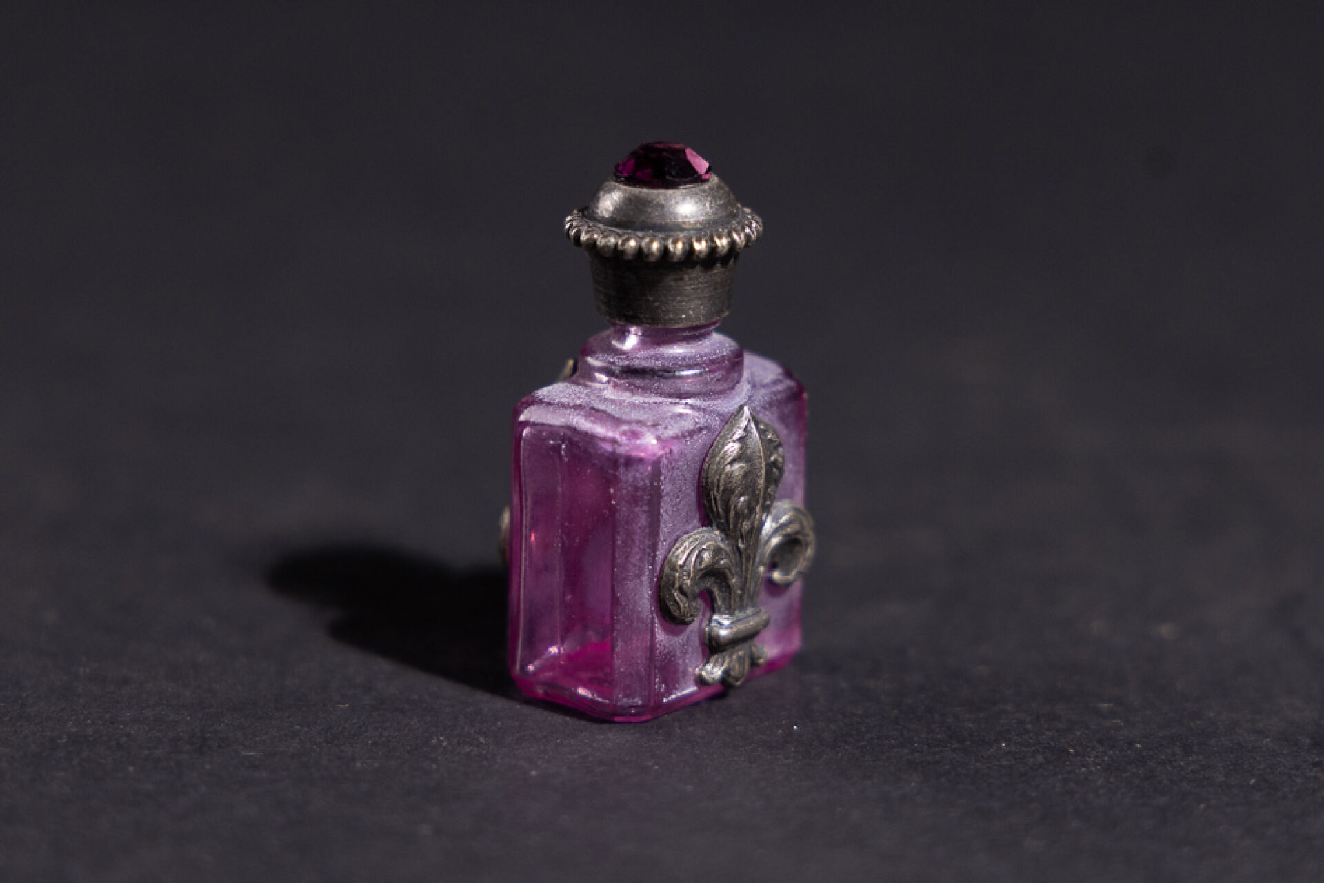 Petit flacon en verre violet appliqué de fleurs de lys en métal, le bouchon orné en cabochon en pierre violette. XXe siècle. Haut. : 3.5 cm On joint : Flacon à sel en cristal à pans surmonté d'un fermoir en métal argenté (chocs). XIXe siècle. Haut. : 13 cm