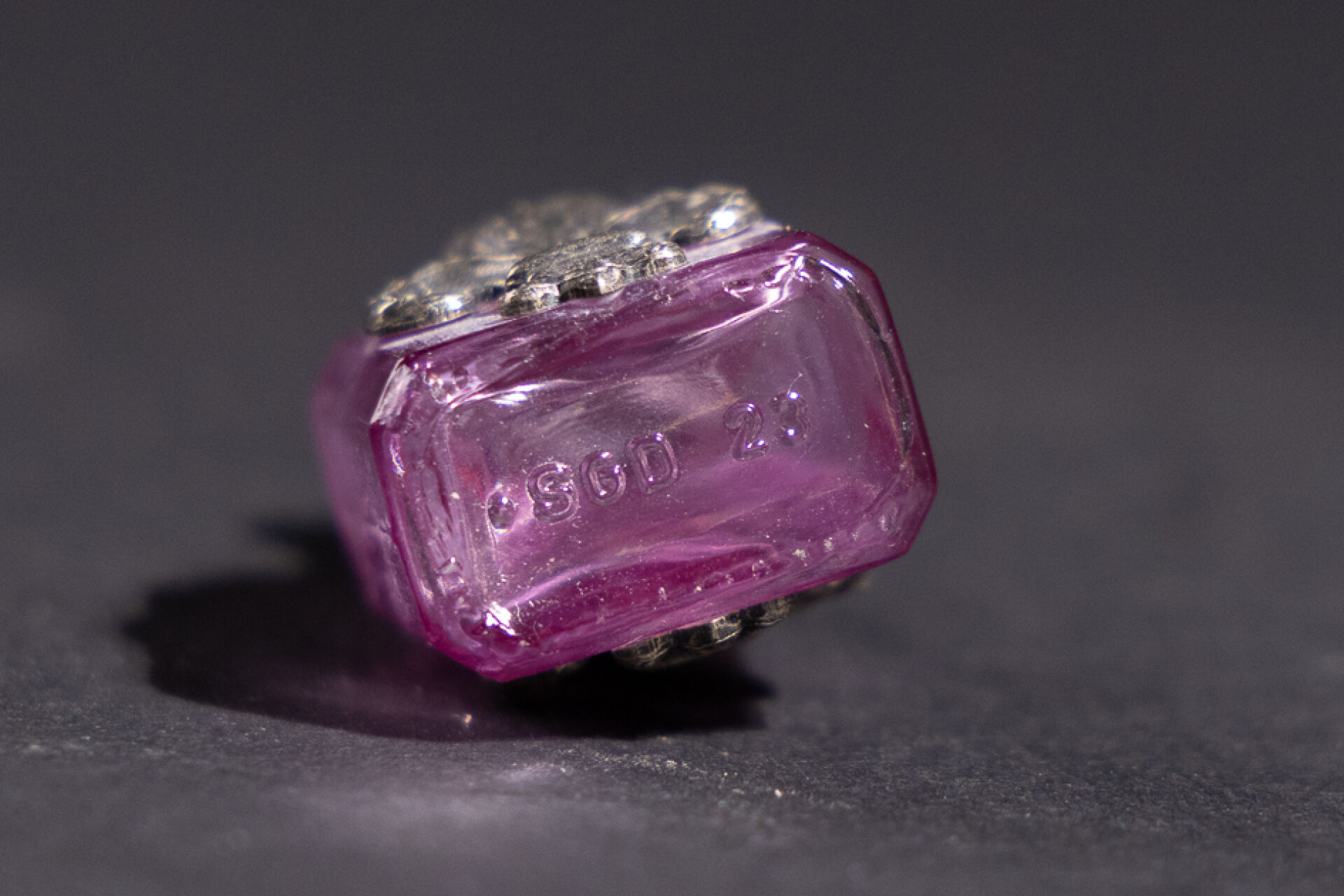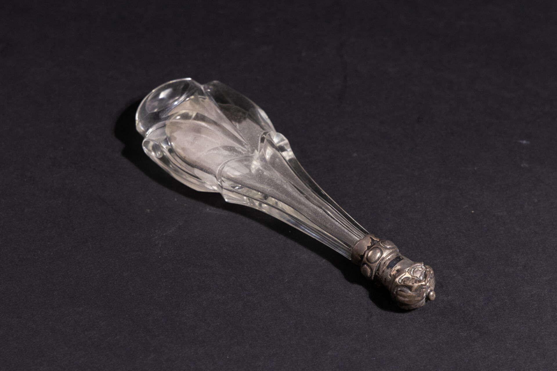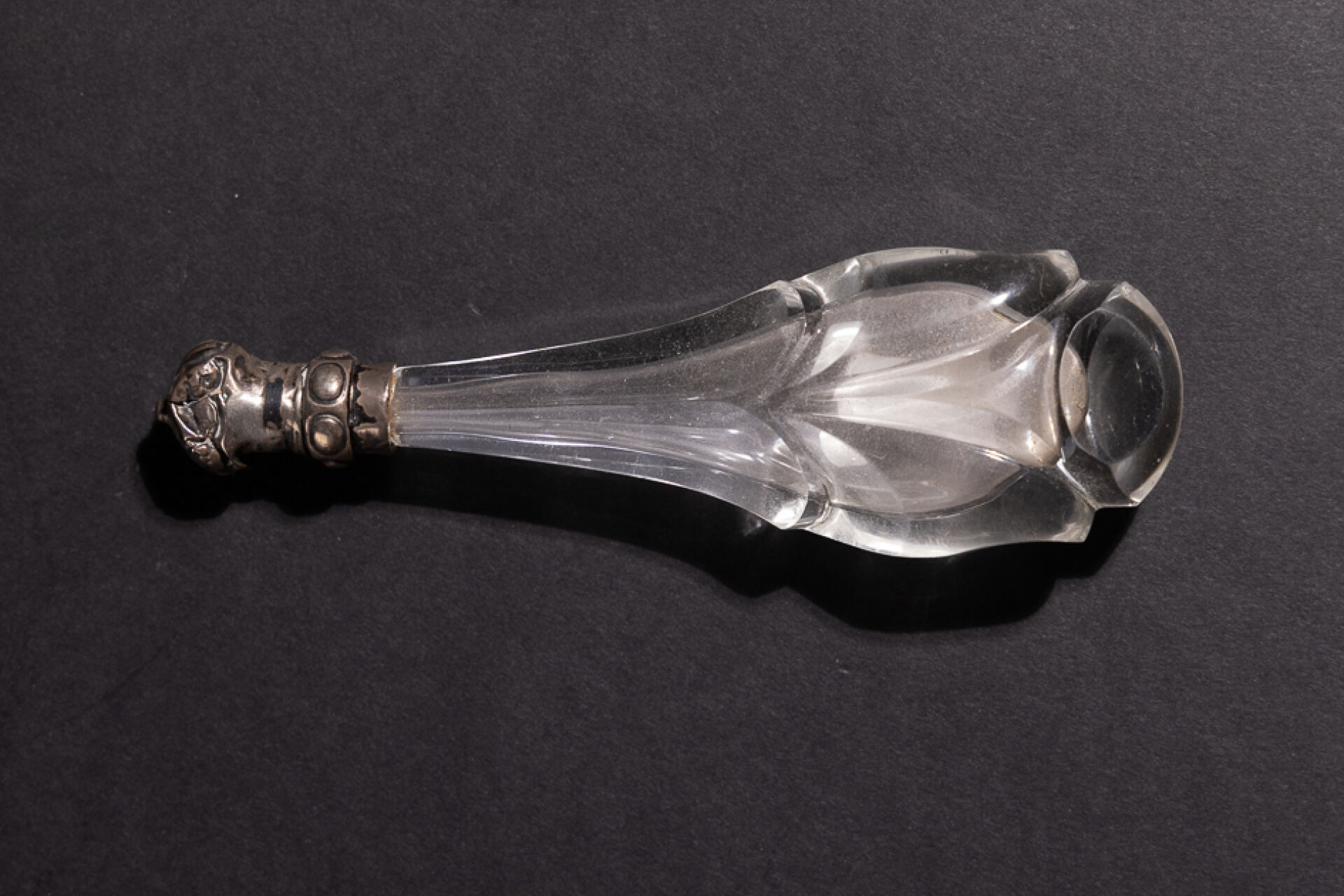 Petit flacon en verre violet appliqué de fleurs de lys en métal, le bouchon orné en cabochon en pierre violette. XXe siècle. Haut. : 3.5 cm On joint : Flacon à sel en cristal à pans surmonté d'un fermoir en métal argenté (chocs). XIXe siècle. Haut. : 13 cm