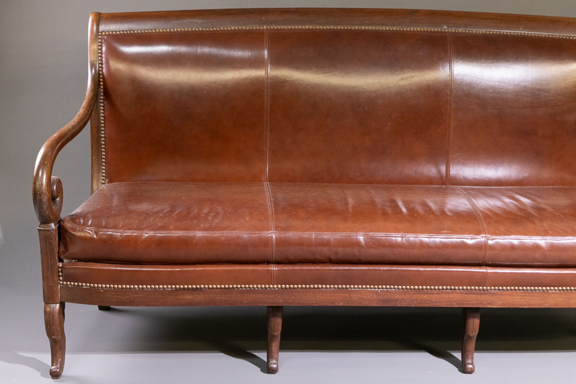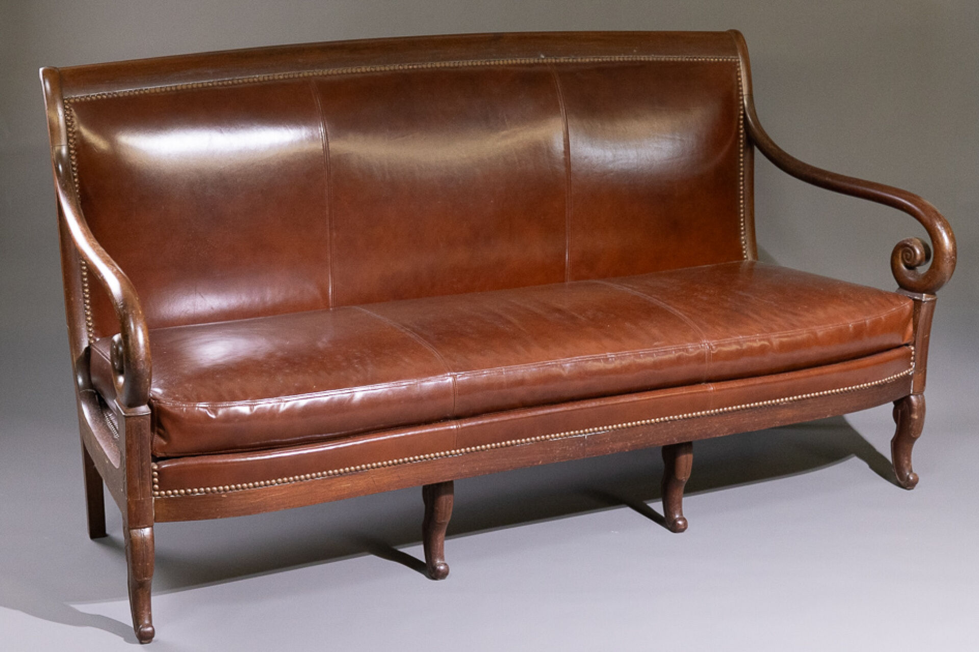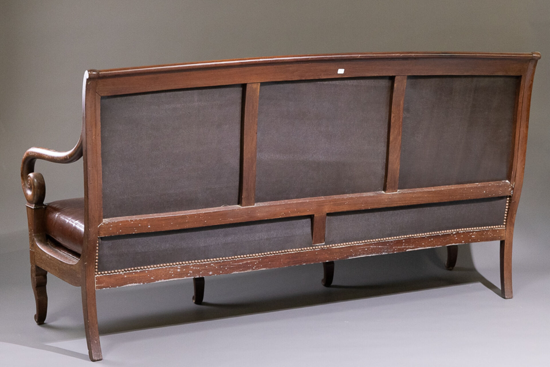Banquette en noyer à dossier légèrement renversé, les accotoirs à enroulement, les quatre pieds antérieurs en jarret stylisé, surmontés pour les extérieurs de palmettes stylisées, les deux pieds arrière en sabre (état d'usage, petits accidents). La garniture de similicuir rapportée. Epoque Restauration. Haut. : 96 cm - Long. : 179 cm - Prof: 60 cm