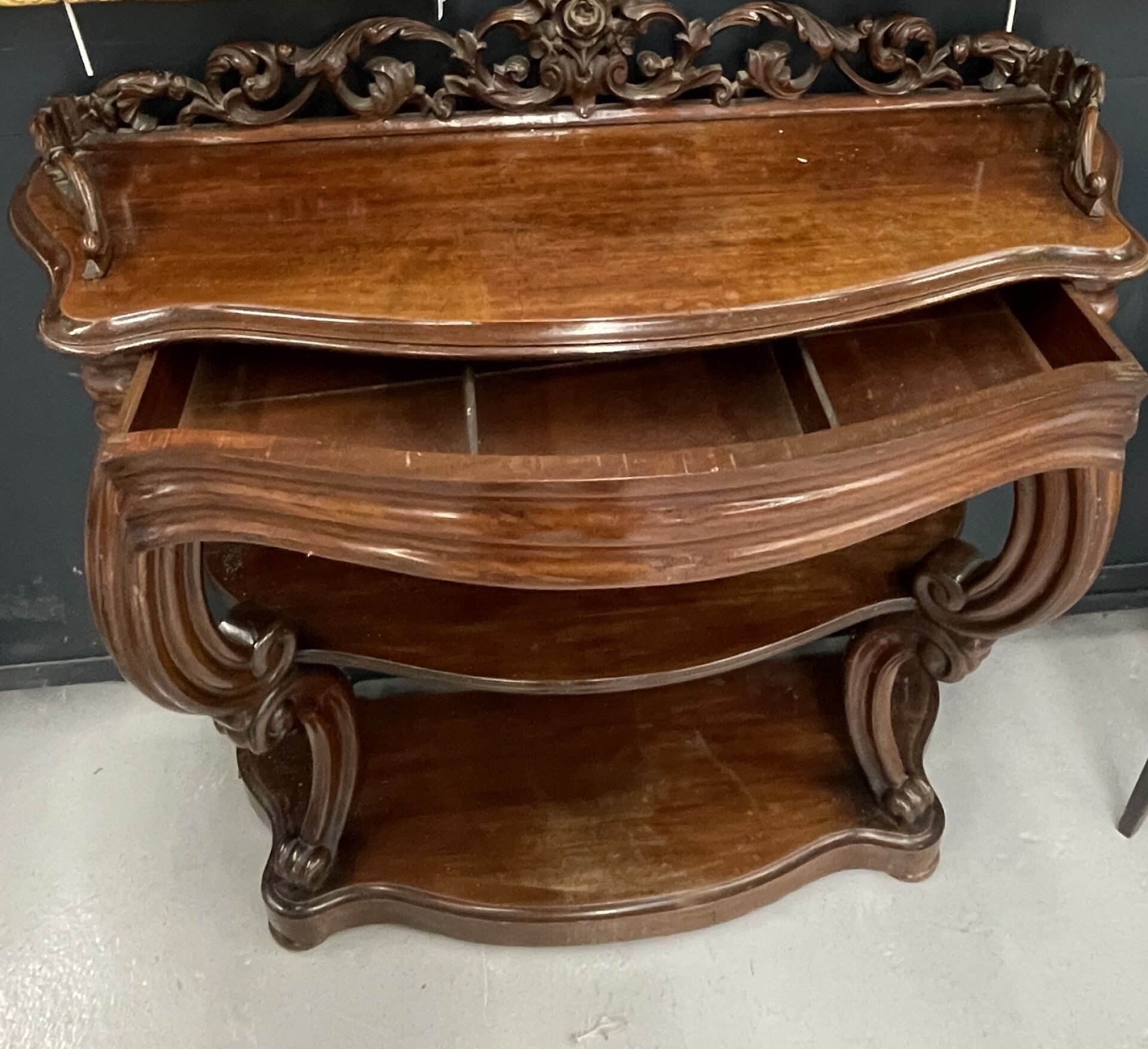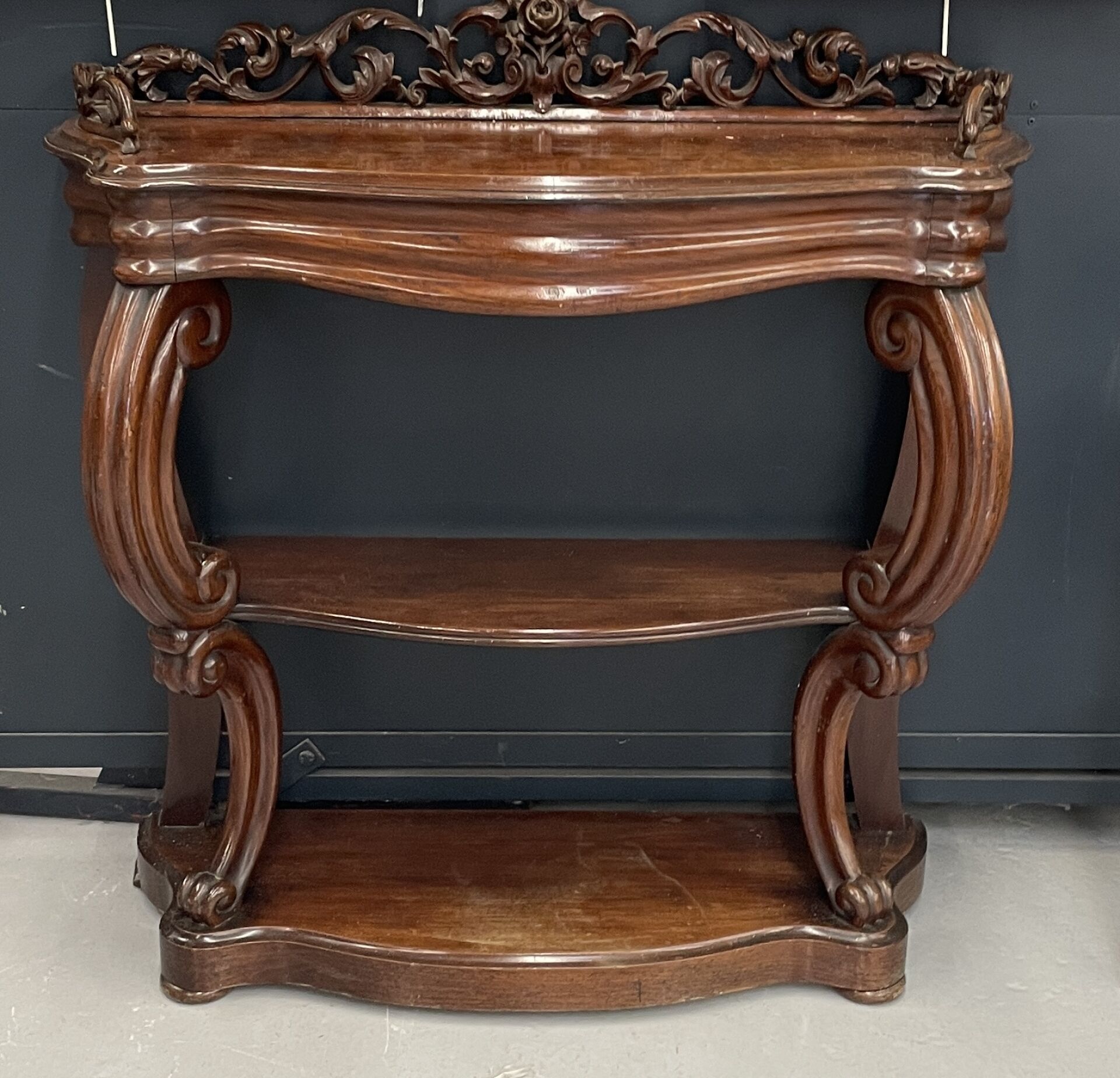Console en acajou ouvrant à un tiroir en ceinture, les montants sinueux en volutes affrontées à tablette d'entretoise. Piètement plinthe. Seconde moitié du XIXe siècle. Haut. : 106 cm - Larg. : 98 cm - Prof. : 37 cm