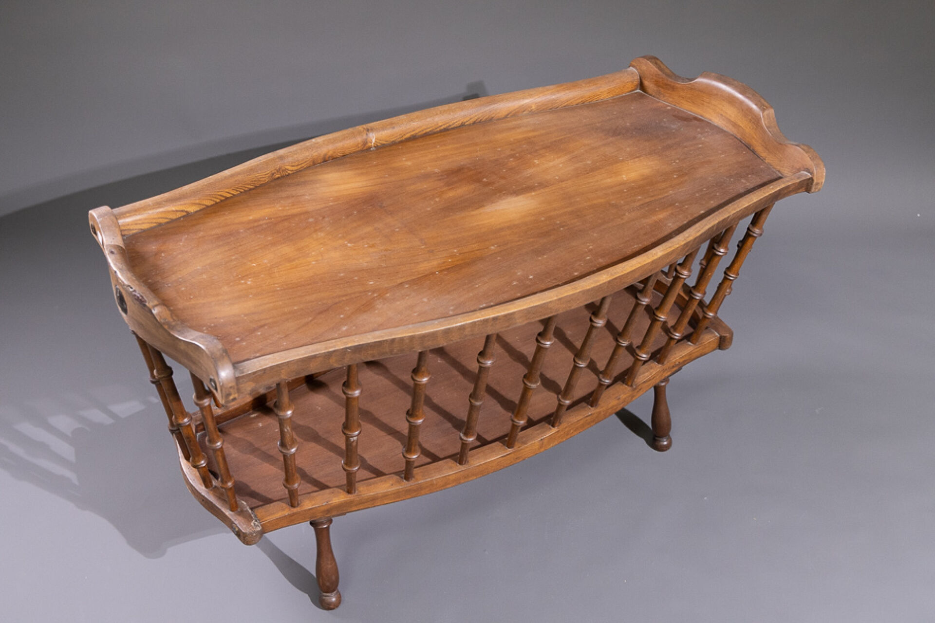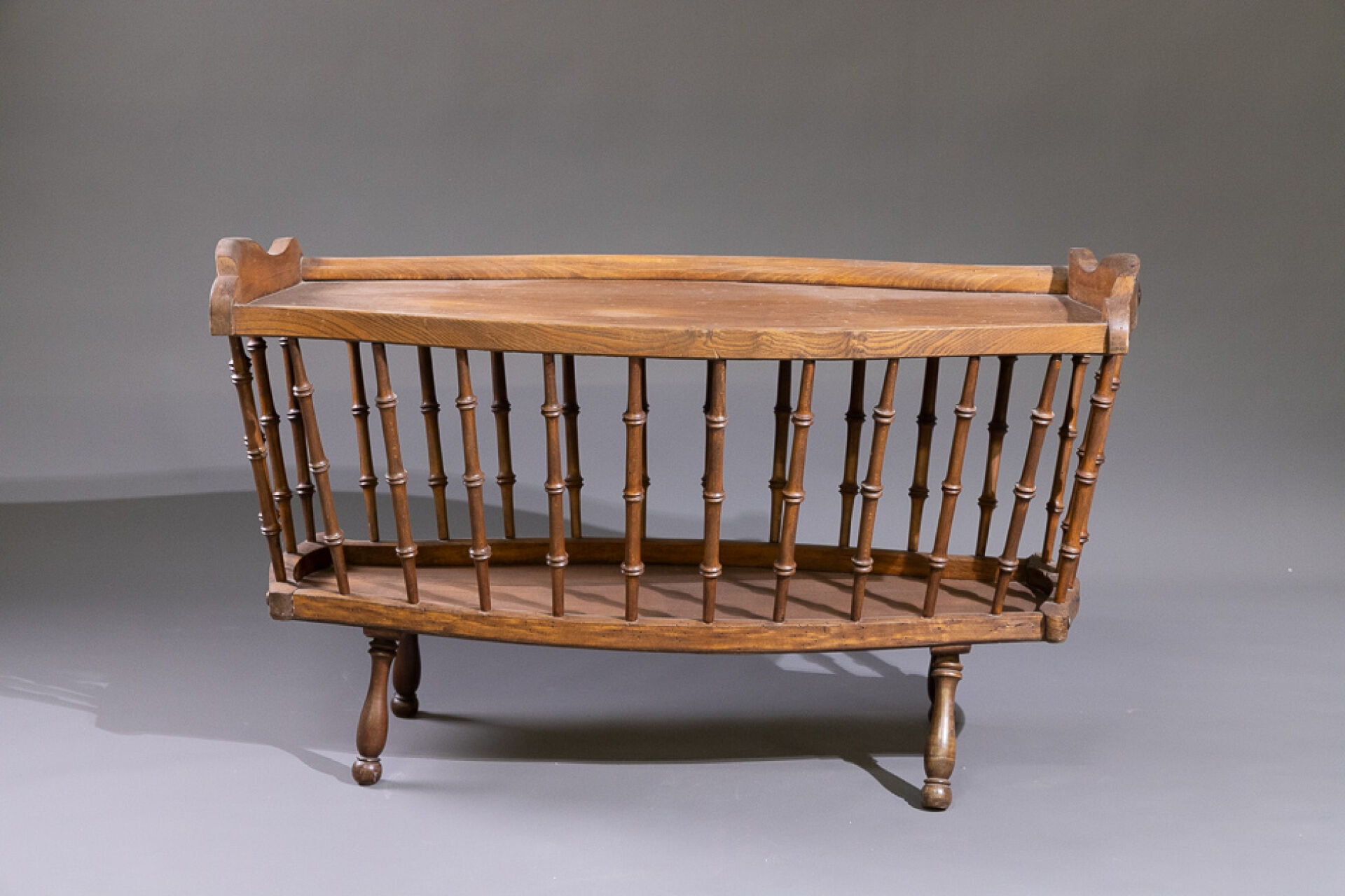 Berceau en bois formant table basse, les montants à barreaux, les pieds en bois tourné. XXe siècle. Haut. : 60 cm - Larg. : 103 cm - Prof. : 54 cm