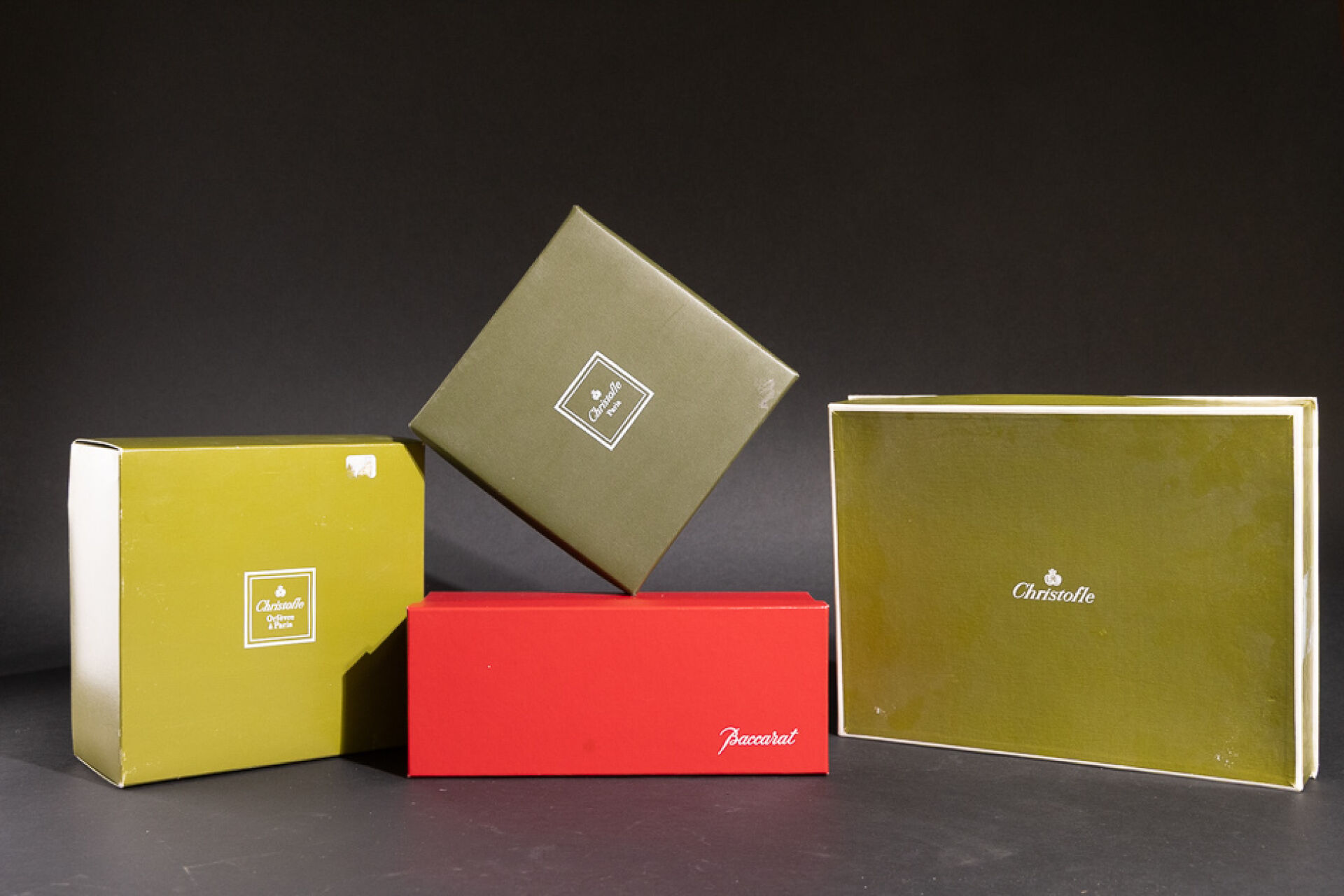 Ensemble de quatre boîtes en carton (en l'état) comprenant : - Boite Baccarat rectangulaire; - Trois boîtes Christofle. On joint : Deux verres à liqueur BACCARAT modèle Nancy
