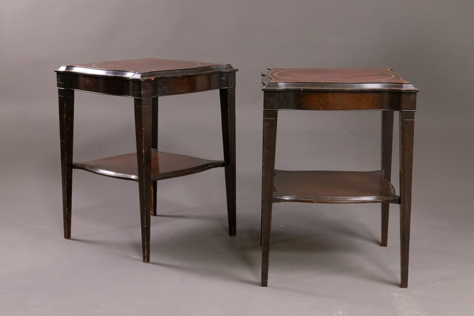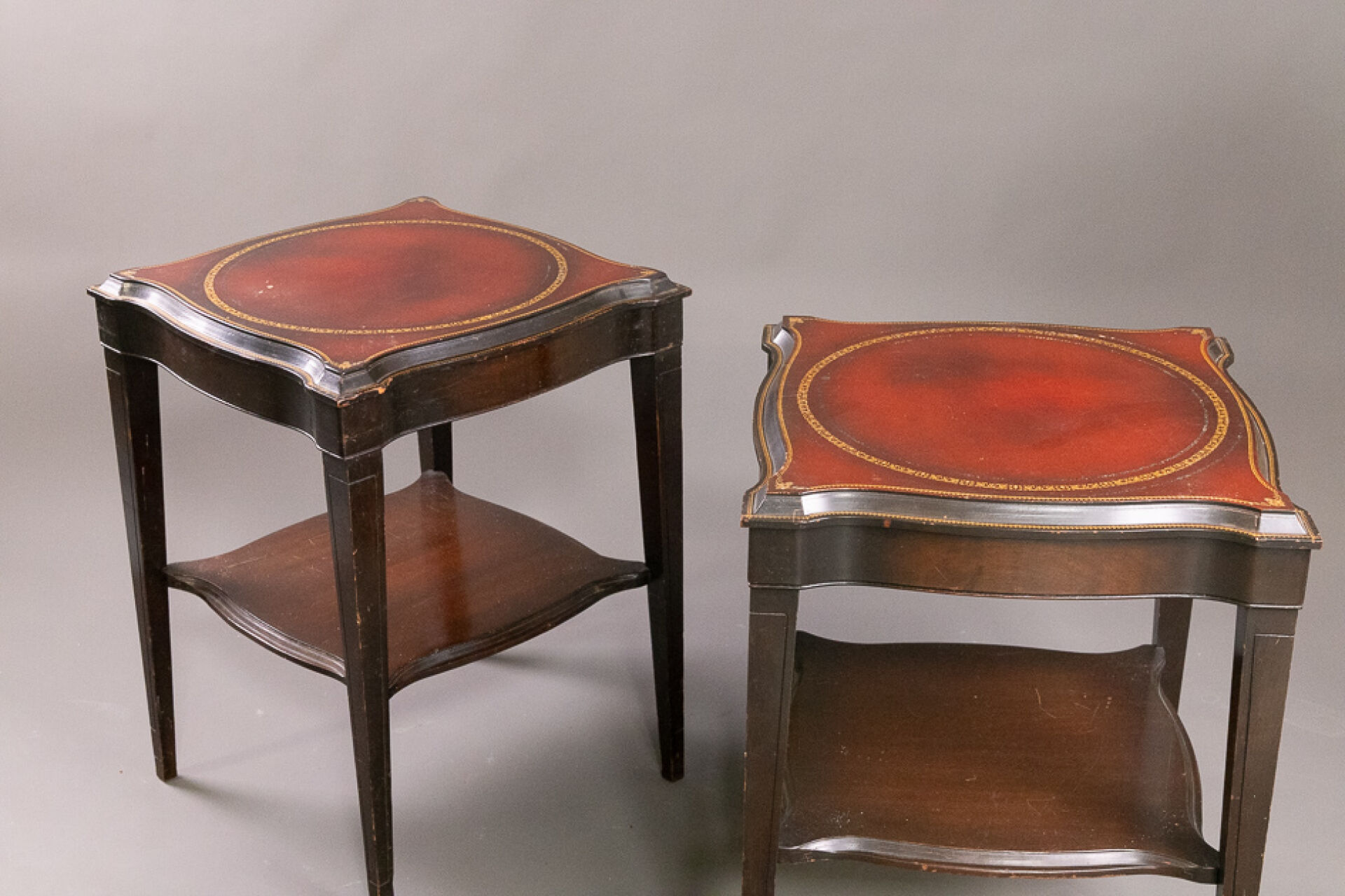 Paire de bouts de canapé en bois laqué noir, le plateau à ceinture chantournée peint à l'imitation du maroquin rouge à décor aux petits fers dorés, les pieds fuselés réunis par une tablette d'entretoise (accidents, manques, chocs). Dans le goût du XVIIIe siècle. Haut. : 69 cm - Côté : 51 cm