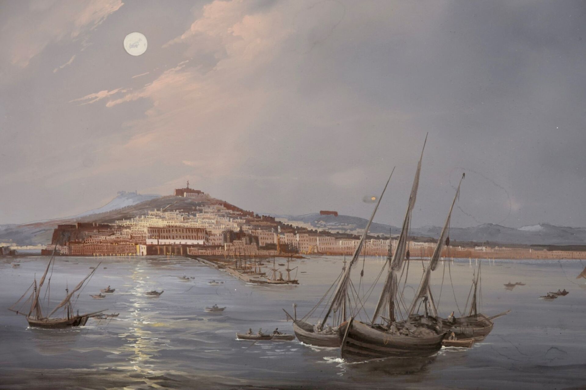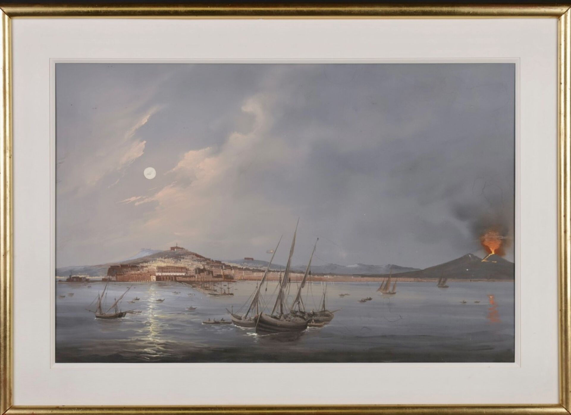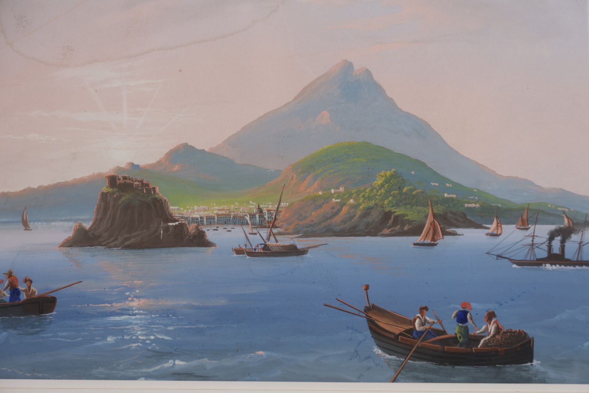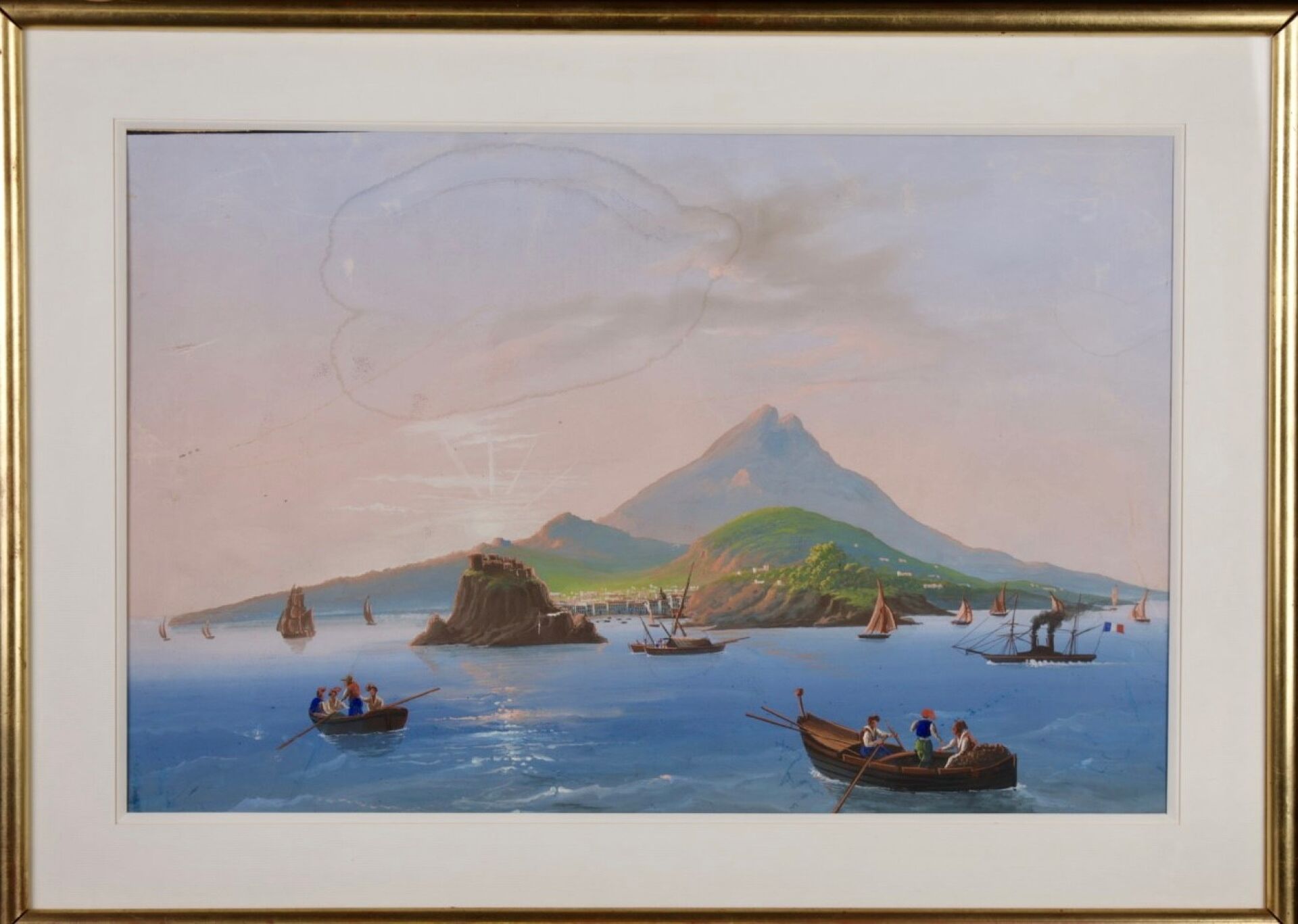 Ecole Napolitaine dit du Pausilippe de la seconde moitié du XIXe siècle. Deux vues de la baie de Naples, le Vésuve en arrière-plan. Pastels (auréoles). Dim. à vue :Haut. : 39.5 cm - Larg. : 62 cm