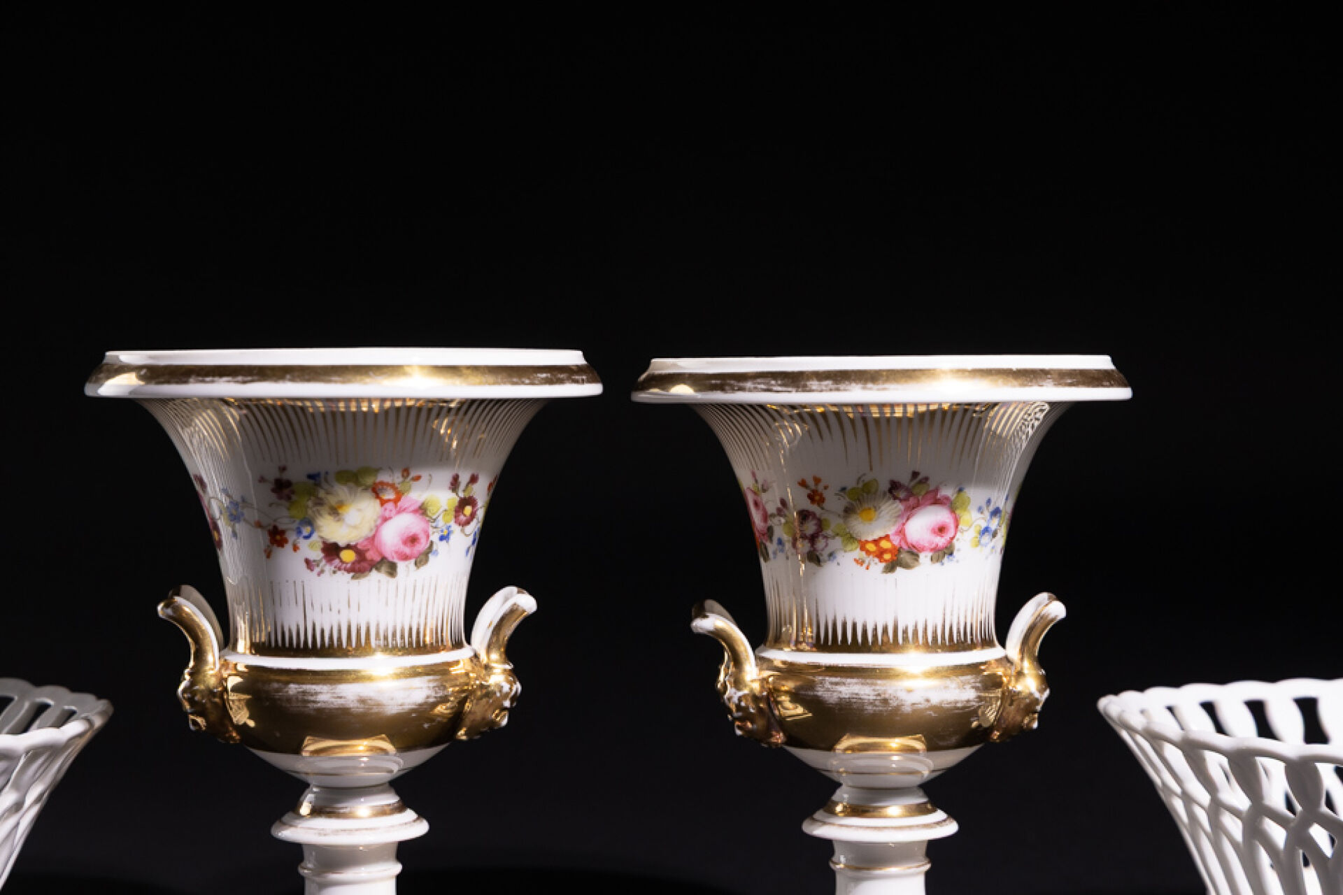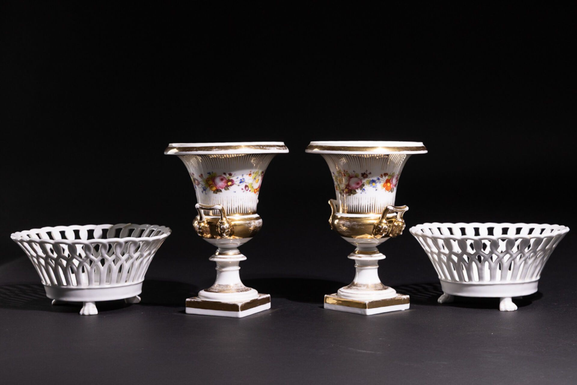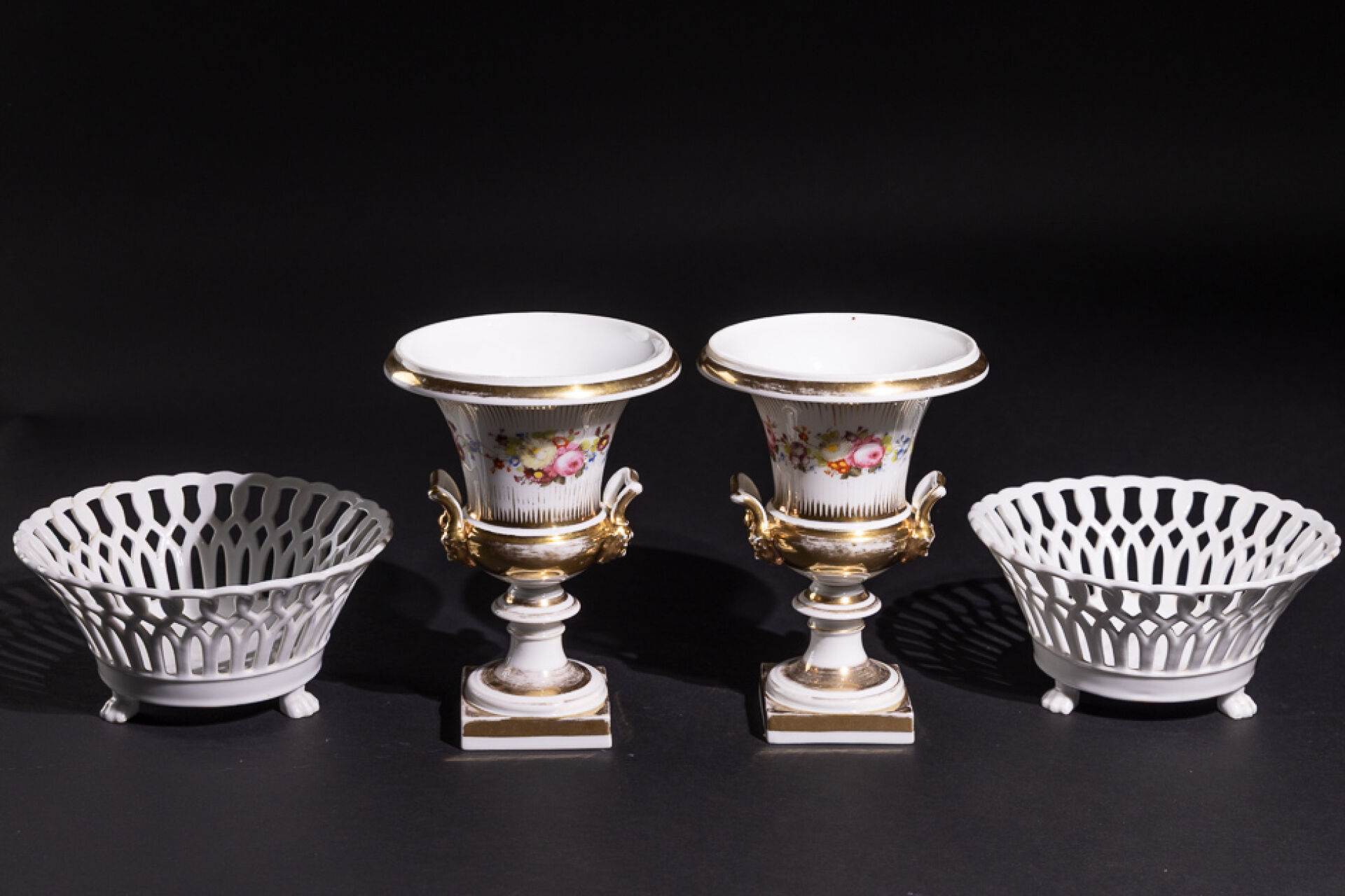 Paire de vases Médicis en porcelaine à filets dorés et frises de fleurs, les anses à mascarons (usures à la dorure). Paris, XXe siècle. Haut. : 23 cm On joint : Paire de corbeilles en porcelaine blanche, la panse ajourée à entrelacs, le piètement tripode griffu (accidents et restaurations). Haut. : 11 cm - Diam. : 22 cm
