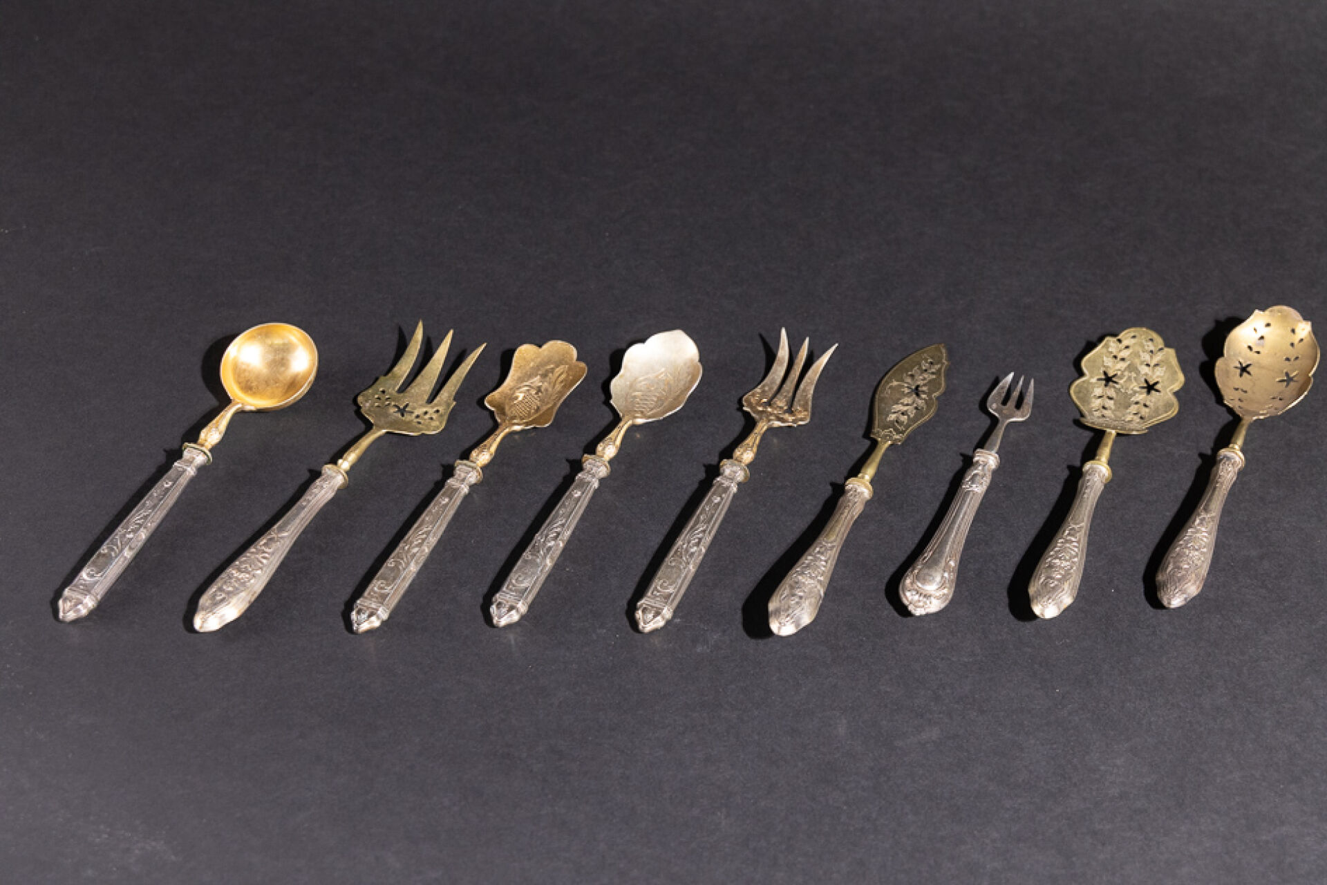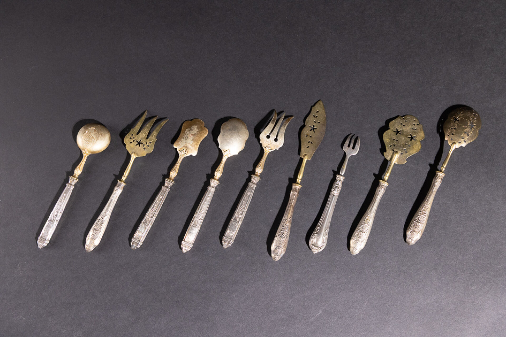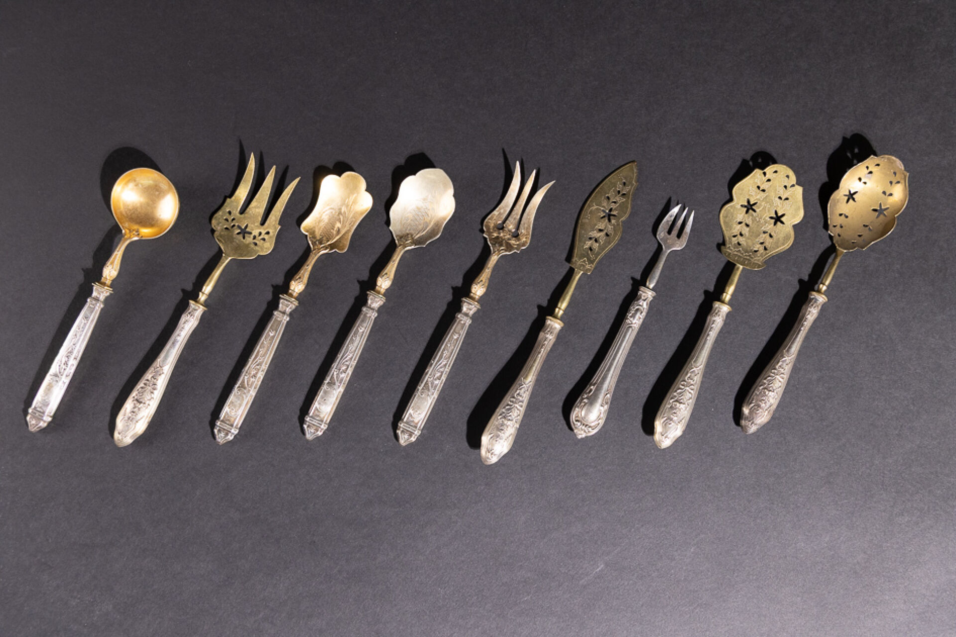 Deux services à friandises, les manches à décor de volutes à rubans noués ou volutes. Les manches en argent fourré. XIXe siècle. Poids brut : 229.84 g On joint : Fourchette à friandise en argent et argent fourré. Poinçon Minerve. Poids brut : 19.48 g