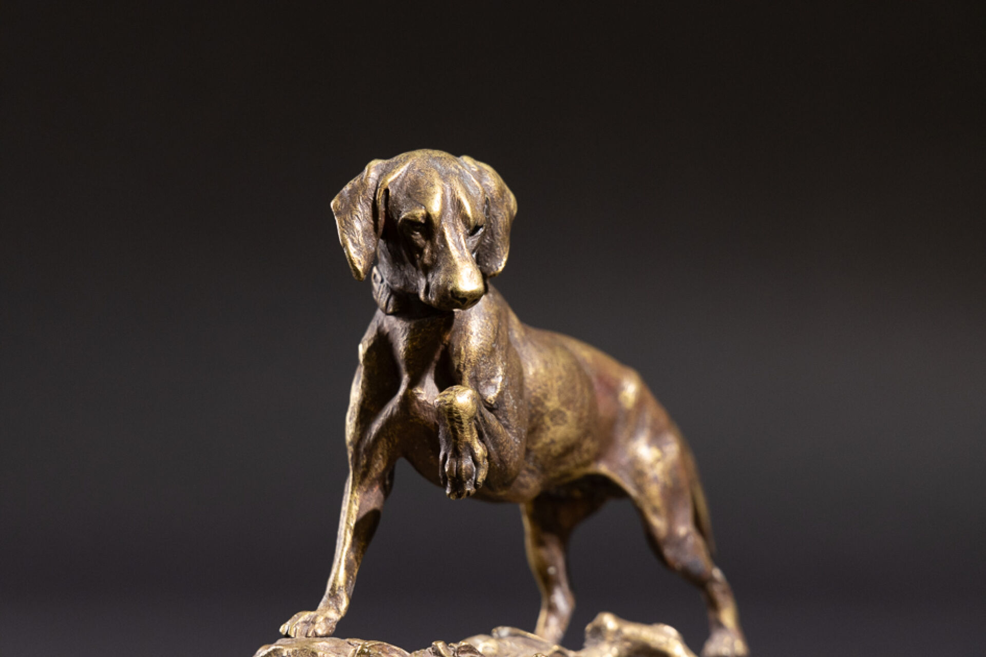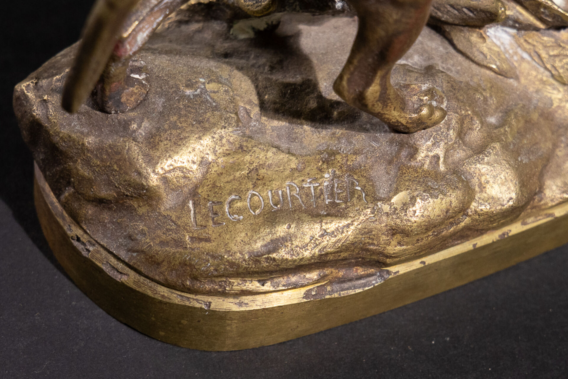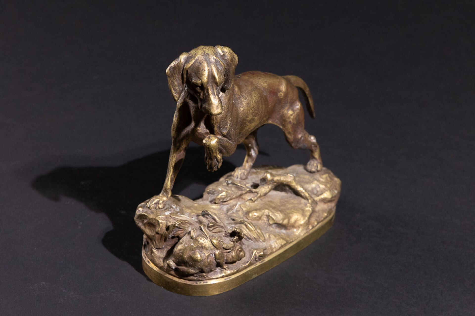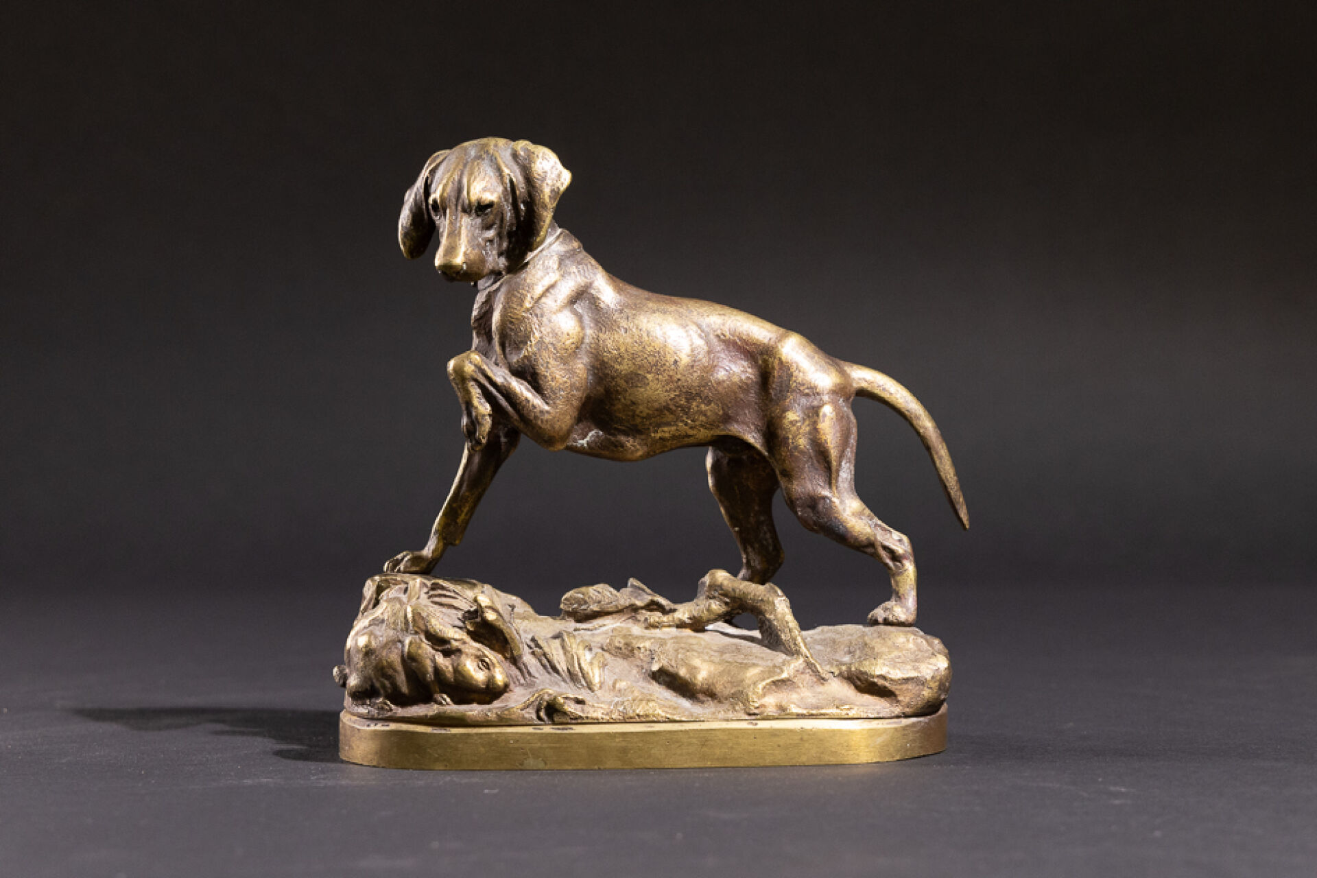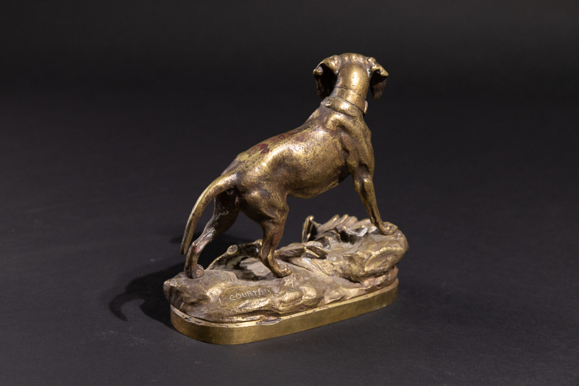 Prosper LECOURTIER (1851-1925). Chien à l'arrêt, un lapin à ses pieds. Epreuve en bronze ciselé anciennement patiné, signée sur la terrasse. Haut. : 17 cm - Larg. : 16.5 cm - Prof. : 8 cm Prosper LECOURTIER est un sculpteur animaliste français de la fin du XIXe siècle, il fut l'élève d'Emmanuel FREMIET dont il garde l'influence. LECOURTIER excelle à représenter le mouvement et les expressions des animaux qu'il sculpte notamment dans des scènes de chasse.
