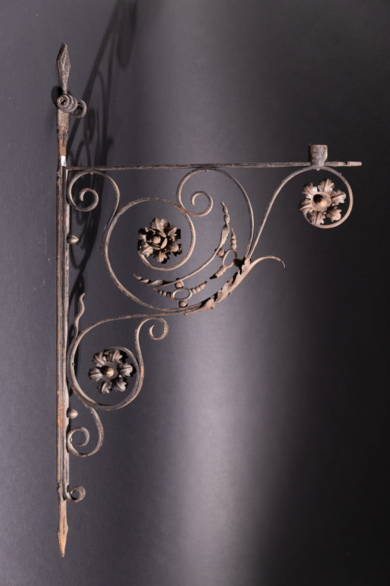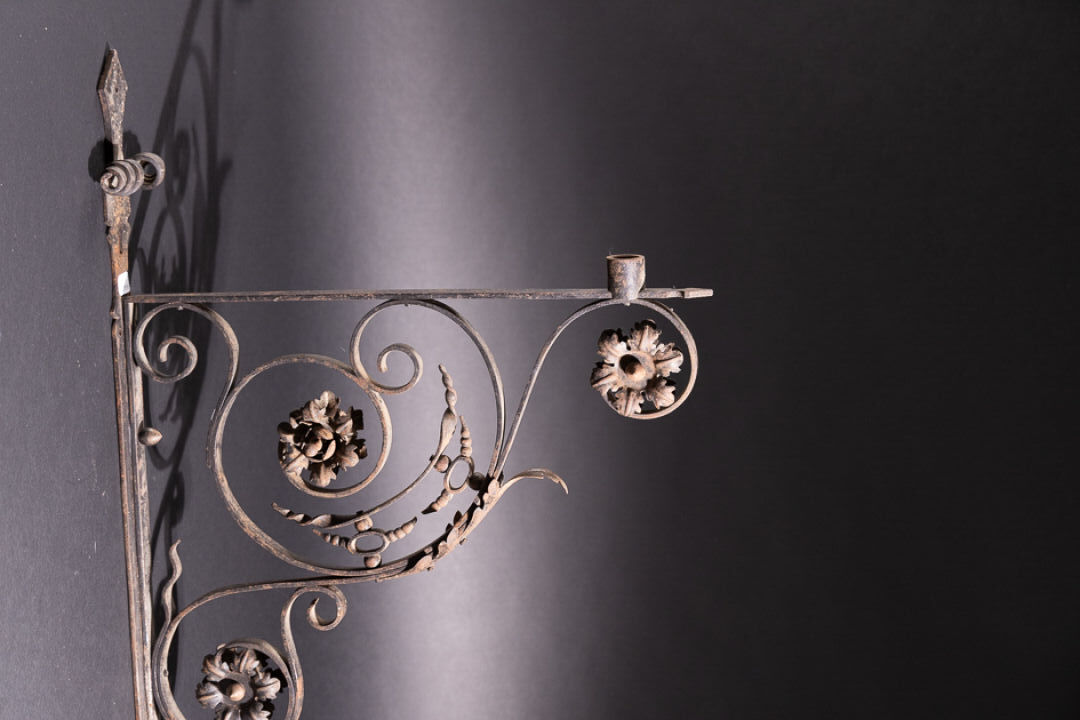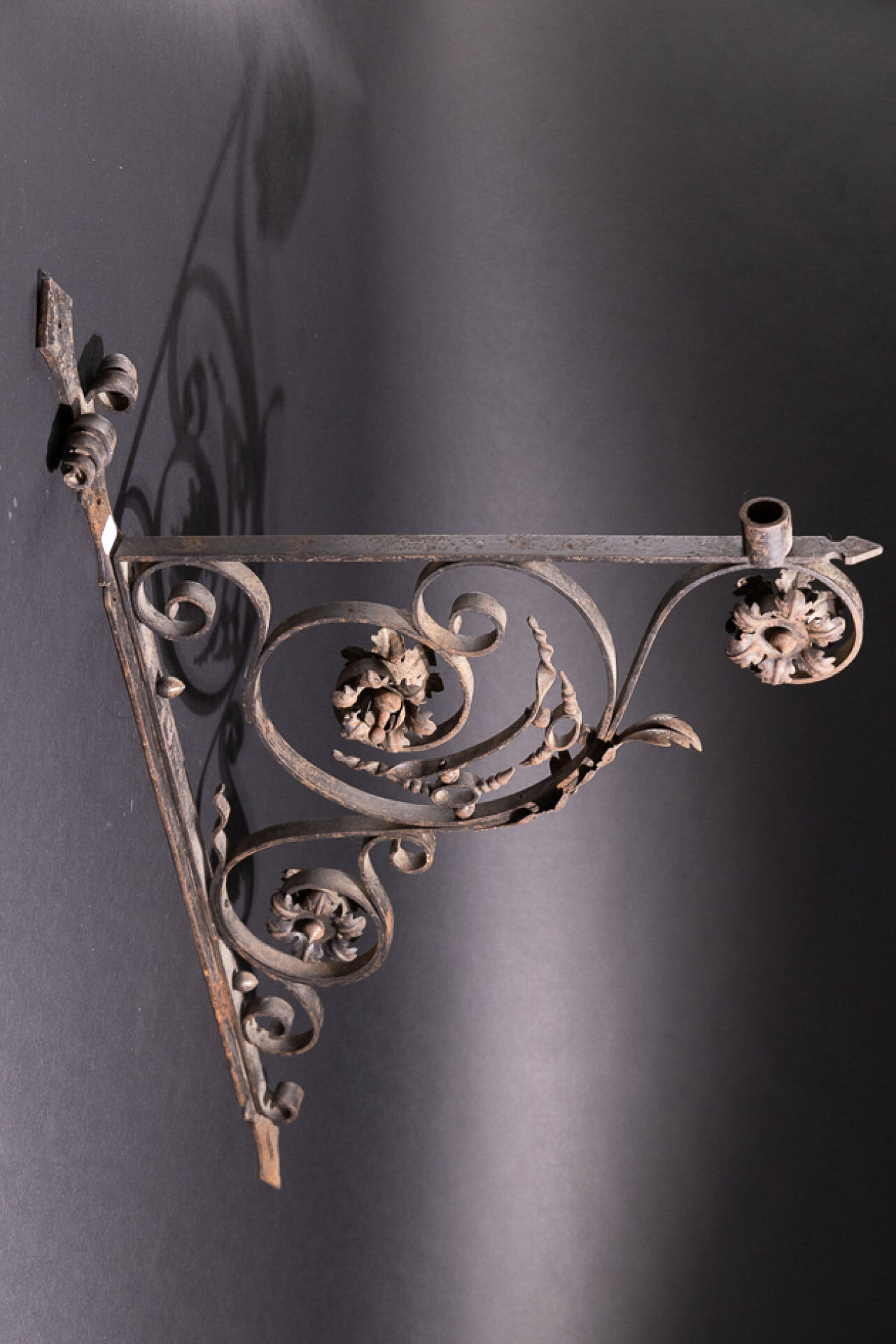 Bras de lumière en applique en fer forgé, la platine retient une équerre à décor de larges volutes feuillagées et fleuries. Travail ancien de style Louis XV. Haut. : 80 cm - Prof. : 47 cm