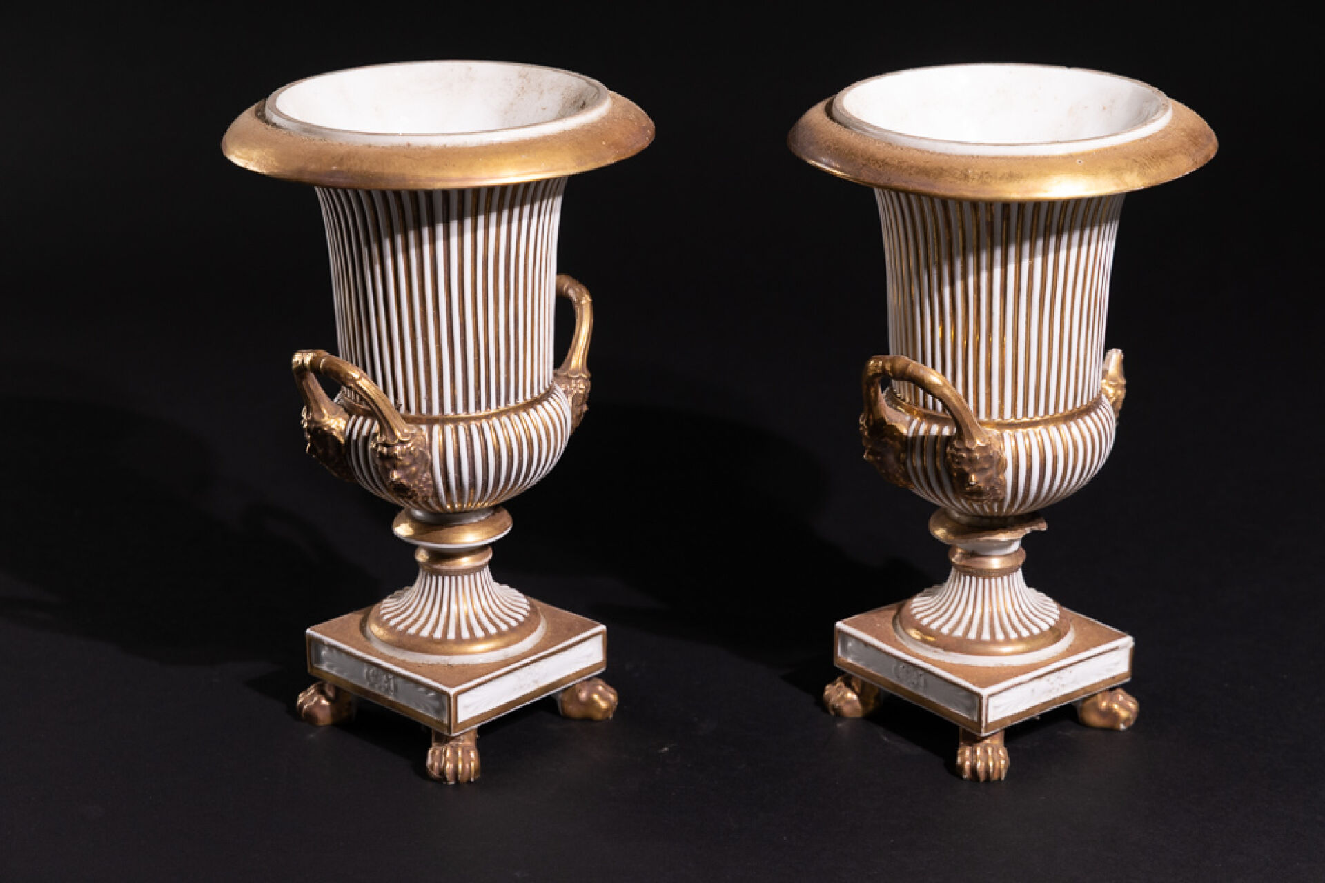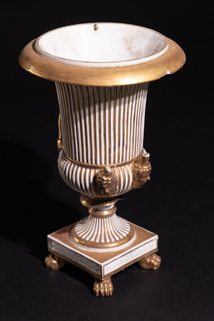 Paire de vase Médicis en porcelaine blanc et or à cannelures et anses aux mascarons barbus, le piètement quadrangulaire à pieds griffus (accidents, manques et restaurations). Porcelaine de Paris, vers 1850. Haut. : 27 cm - Diam. : 17 cm