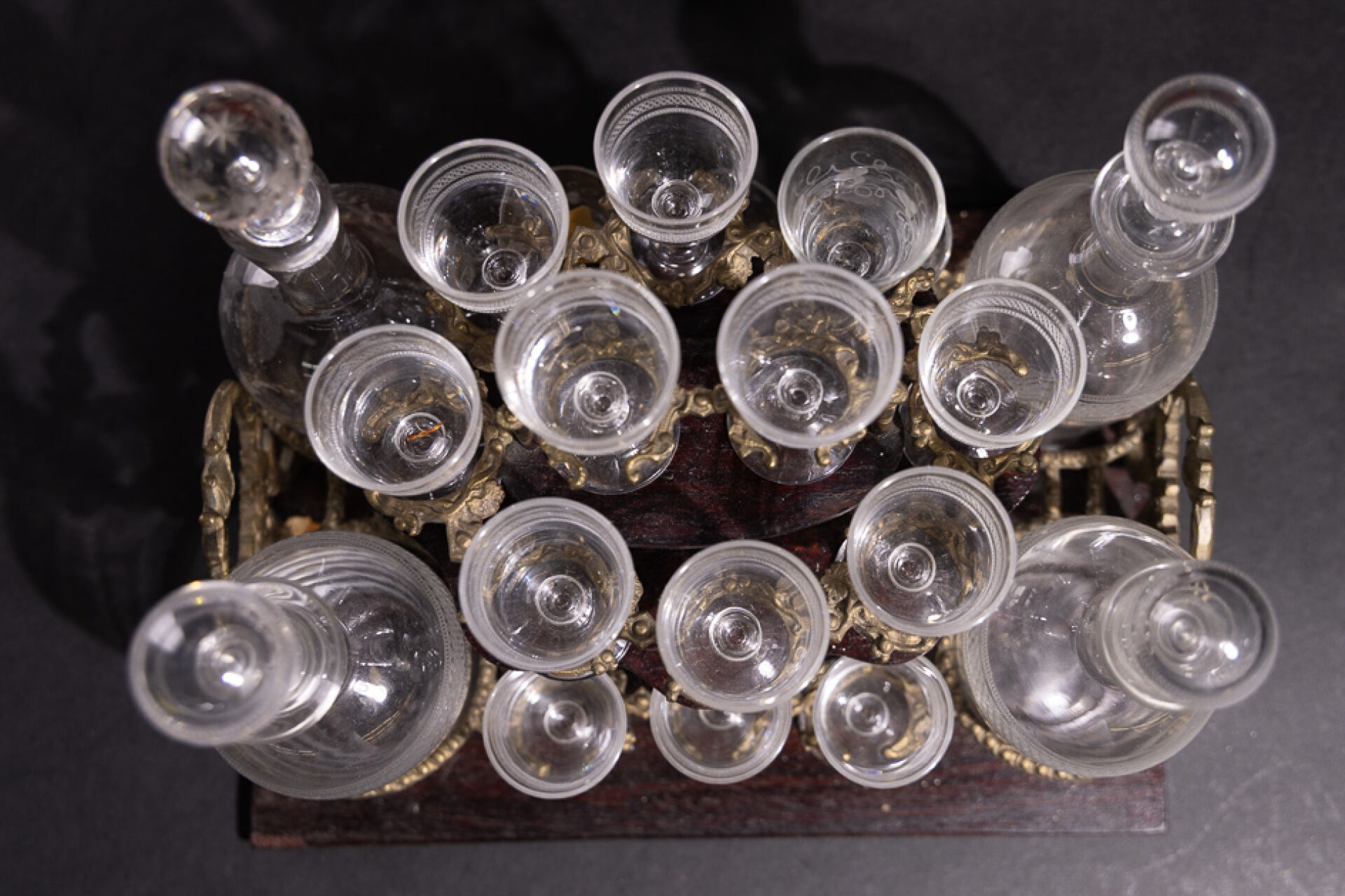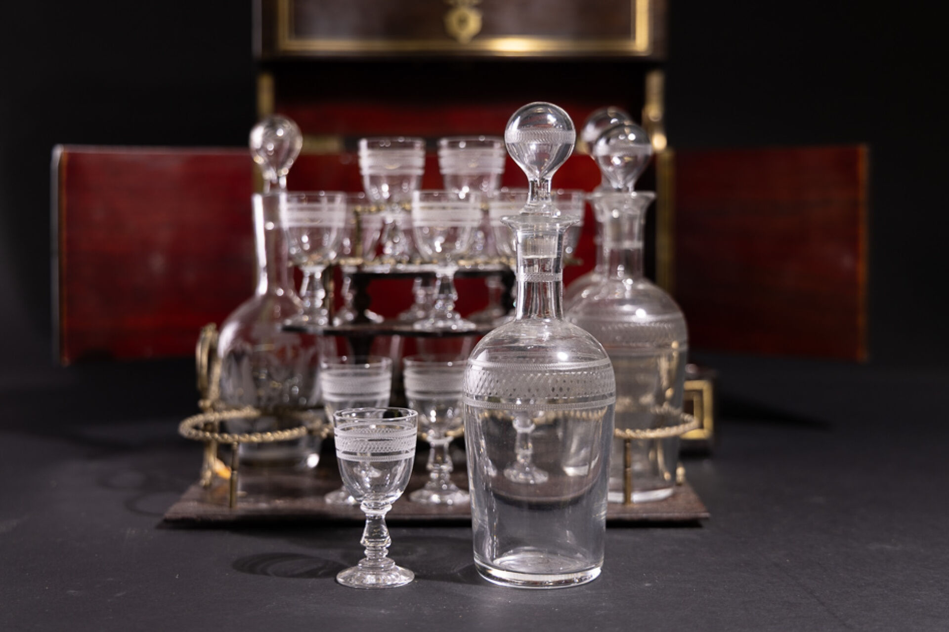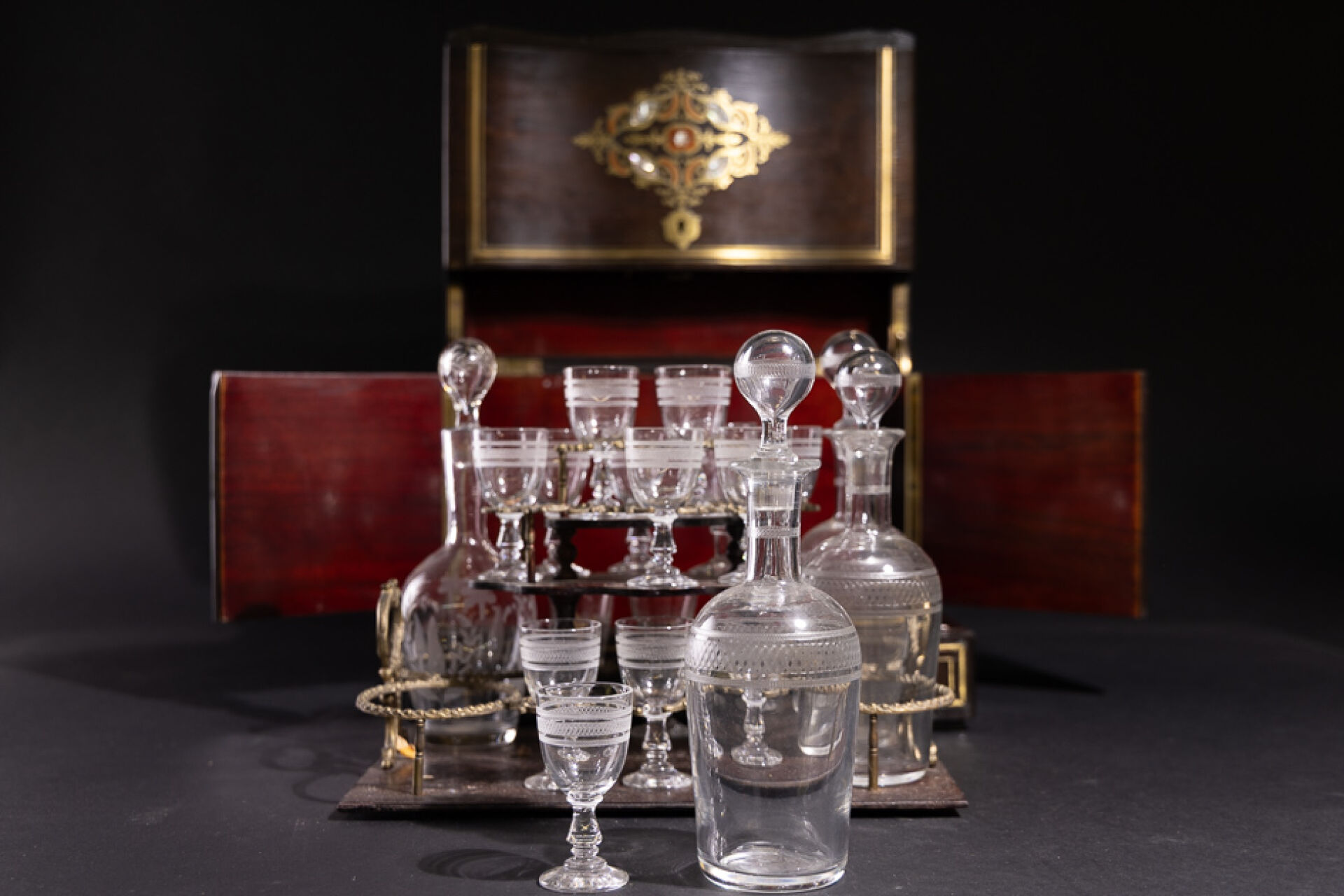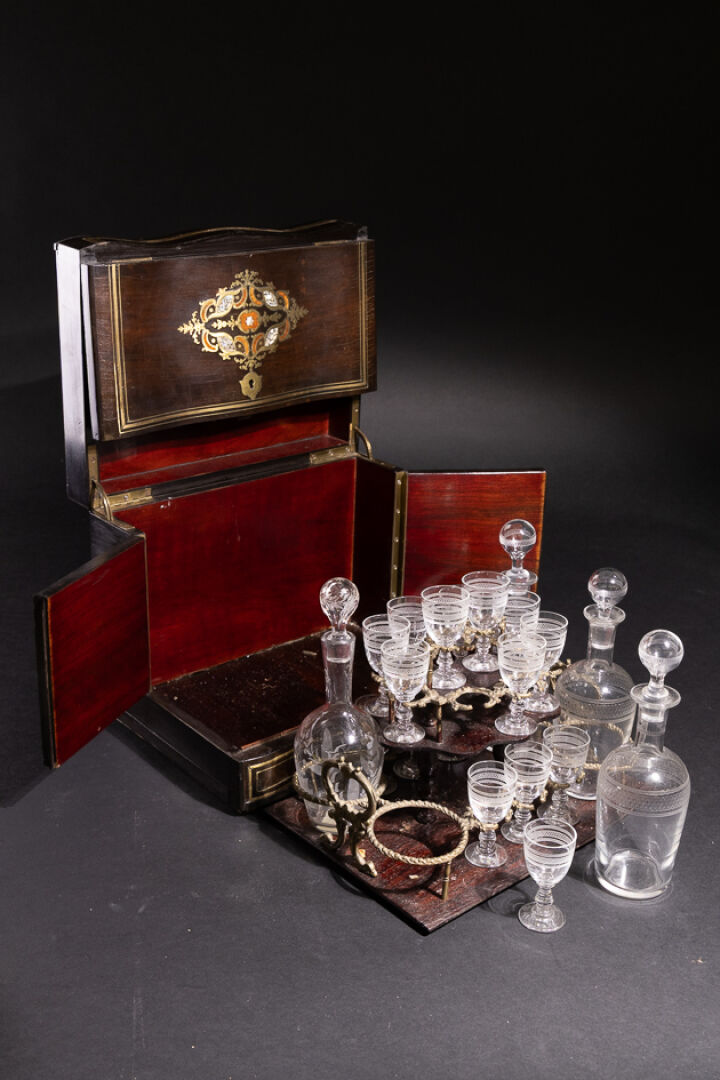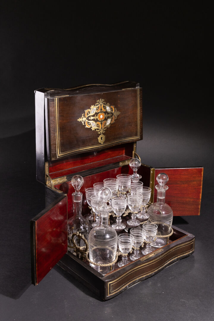 Cave à liqueur en bois noirci à décor marqueté de filets de laiton, ornements décoratifs nacrés, la façade violonée découvre un plateau amovible à formes enchâssant quatre carafons et onze verres et quatre rapportés (petits accidents). Époque Napoléon III. Haut. : 26 cm - Larg. : 32.5 cm - Prof. : 25 cm