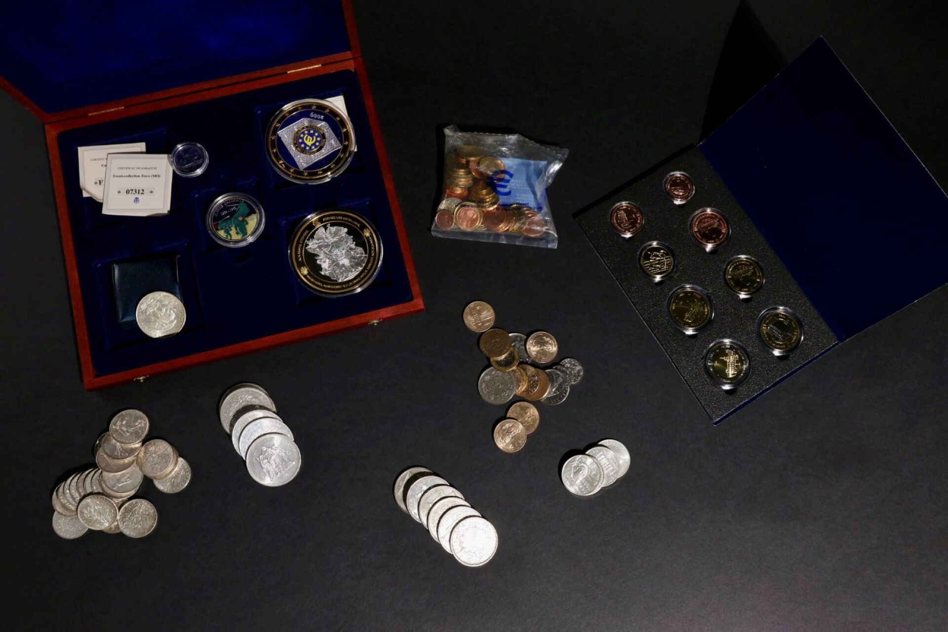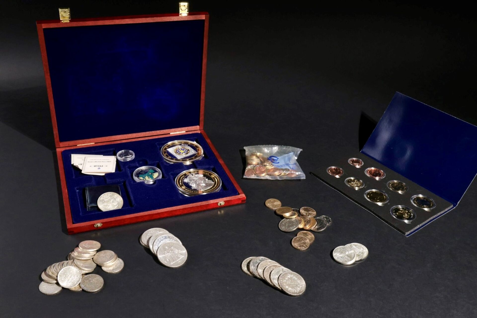 Ensemble de pièces dont : - Vingt trois pièces de 5 francs dont une de 1933 (dont trois pas en argent) - Pièces de dix francs : six grandes, huit petites cuivrées, trois petites métal argenté et deux métal argenté et couronne dorée. - Six pièces de cinquante francs - Quatre pièces de cent francs On joint : Dans une boite bleue huit pièces de collection euros. Principauté de Monaco et dans une boite en bois plate comprenant cinq médailles commémoratives ; Premier sachet de pièces d'euros offert par l'état français (sachet fermé).