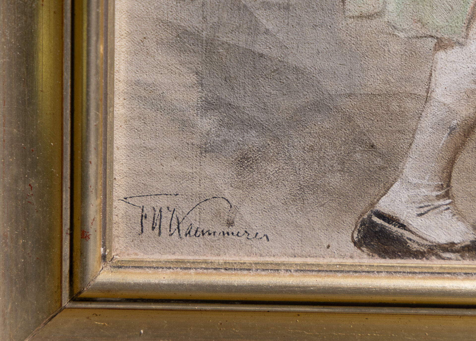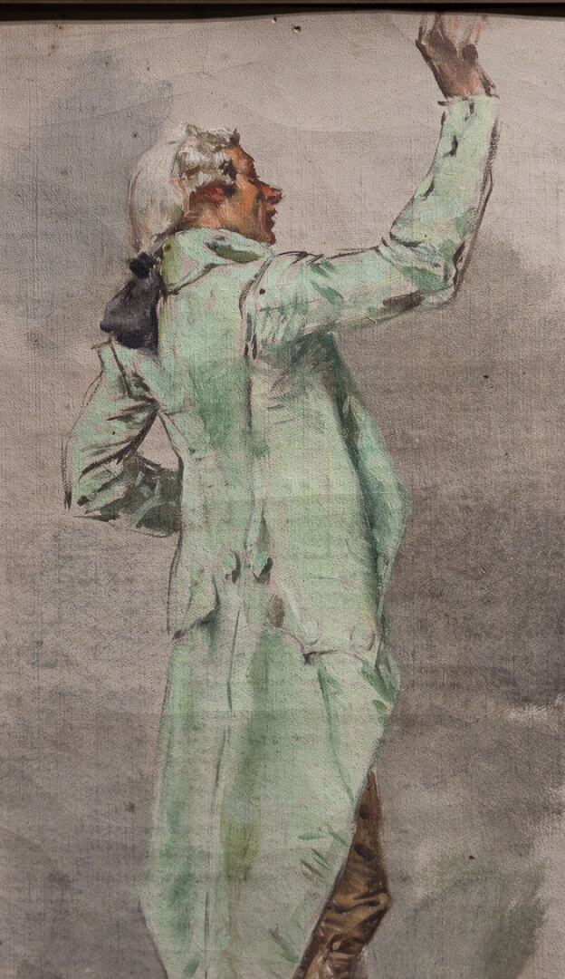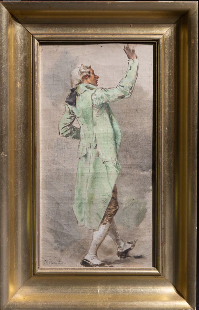 Frederick Hendrik KAEMMERER (1839-1902). Etude d'homme en livré verte, une main levée. Huile sur toile signée en bas à gauche (petits accidents). Haut. : 34 cm - Larg. : 18 cm