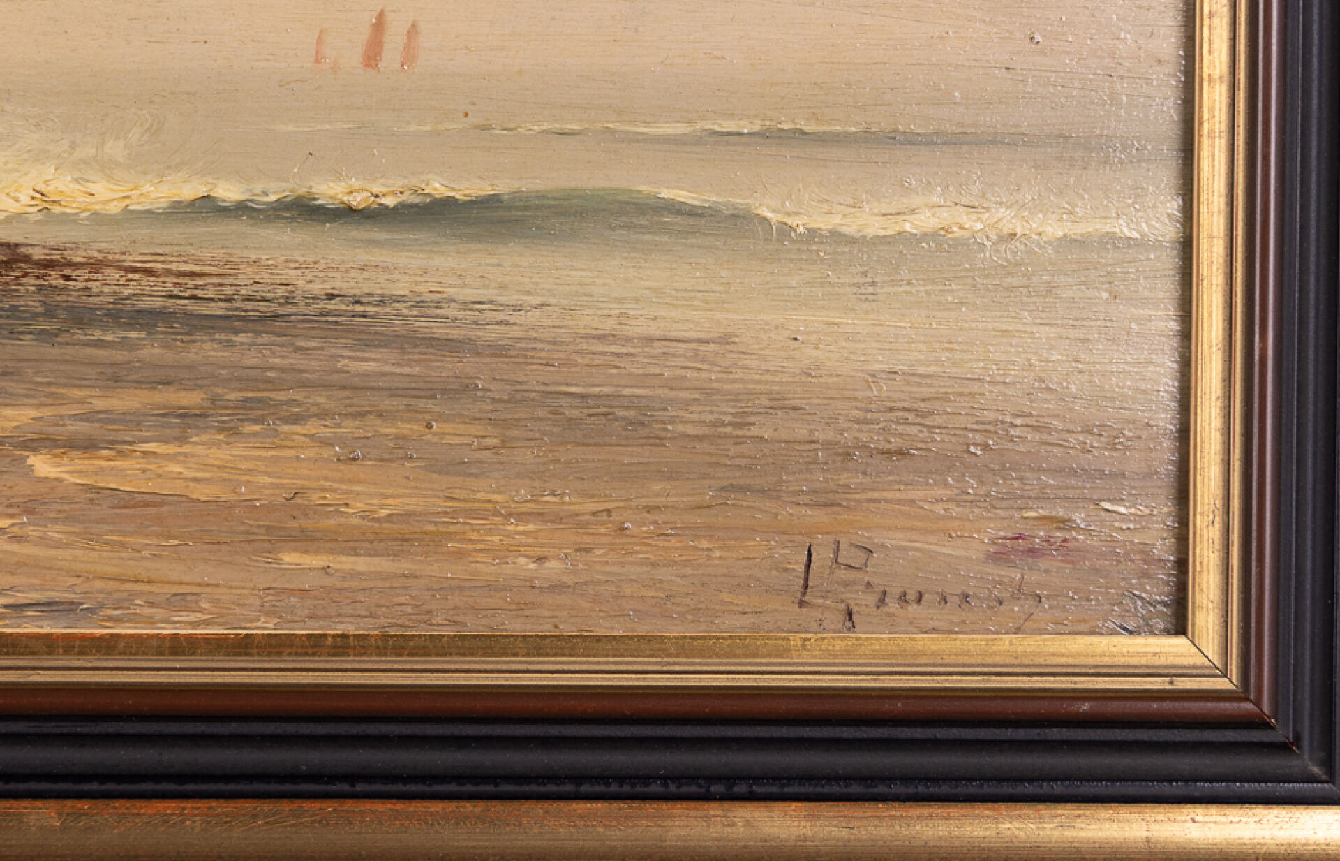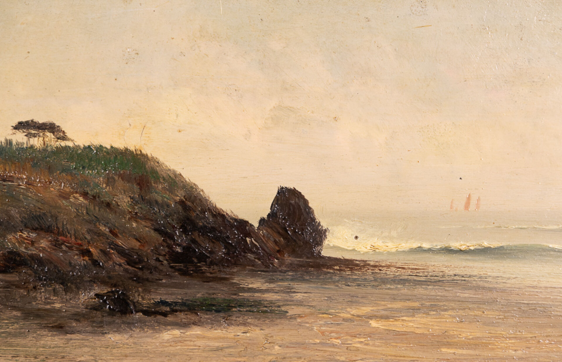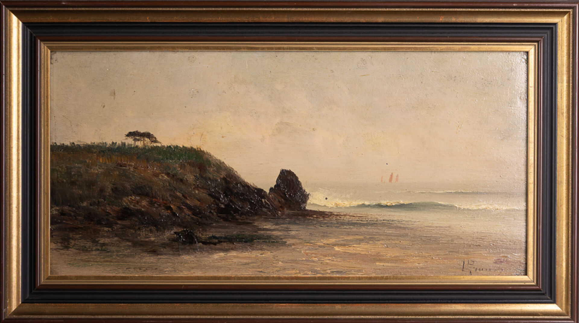 Ecole du XXe siècle. Paysage de bord de mer, voilier au loin. Huile sur panneau trace de signature en bas à droite. Dim. à vue : Haut. : 20 cm - Larg. : 40 cm