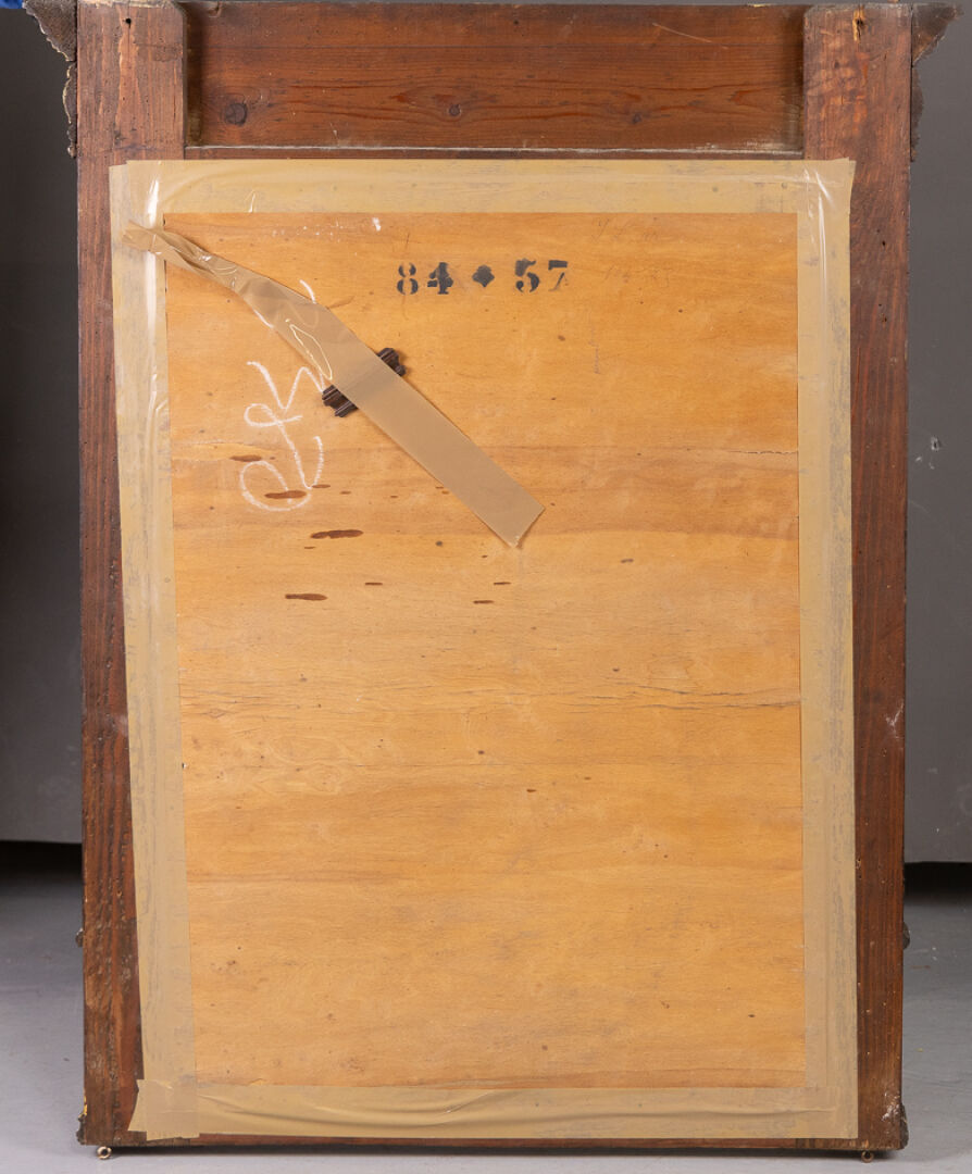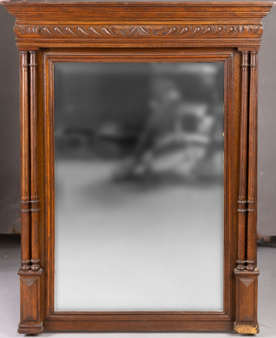 Miroir de cheminée en bois teinté, les montants à double colonnettes, la partie haute à fronton à godrons, le miroir biseauté (un éléments en partie basse à refixer). Vers 1900. Haut. : 110 cm - Larg. : 88 cm