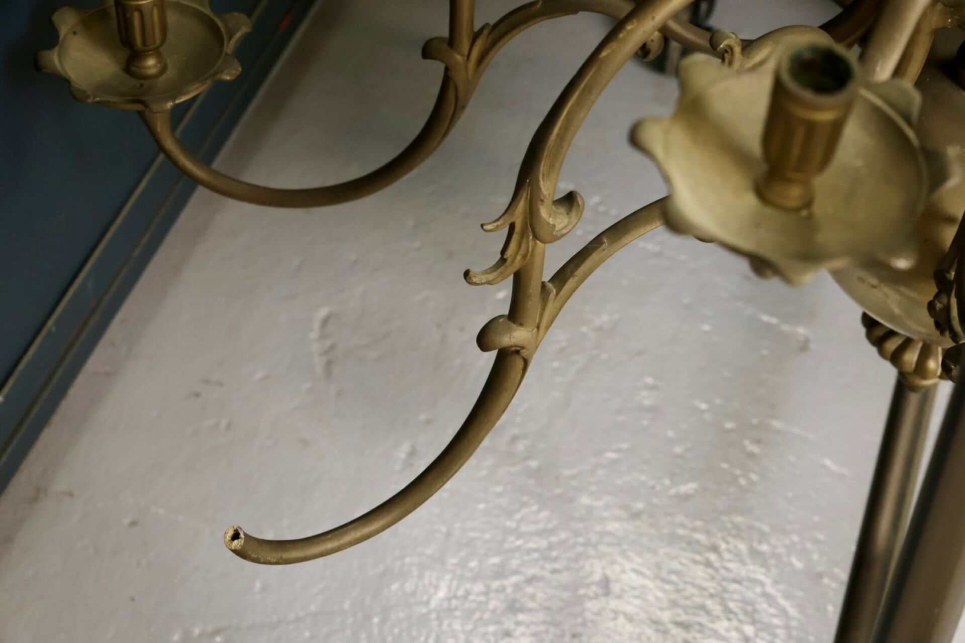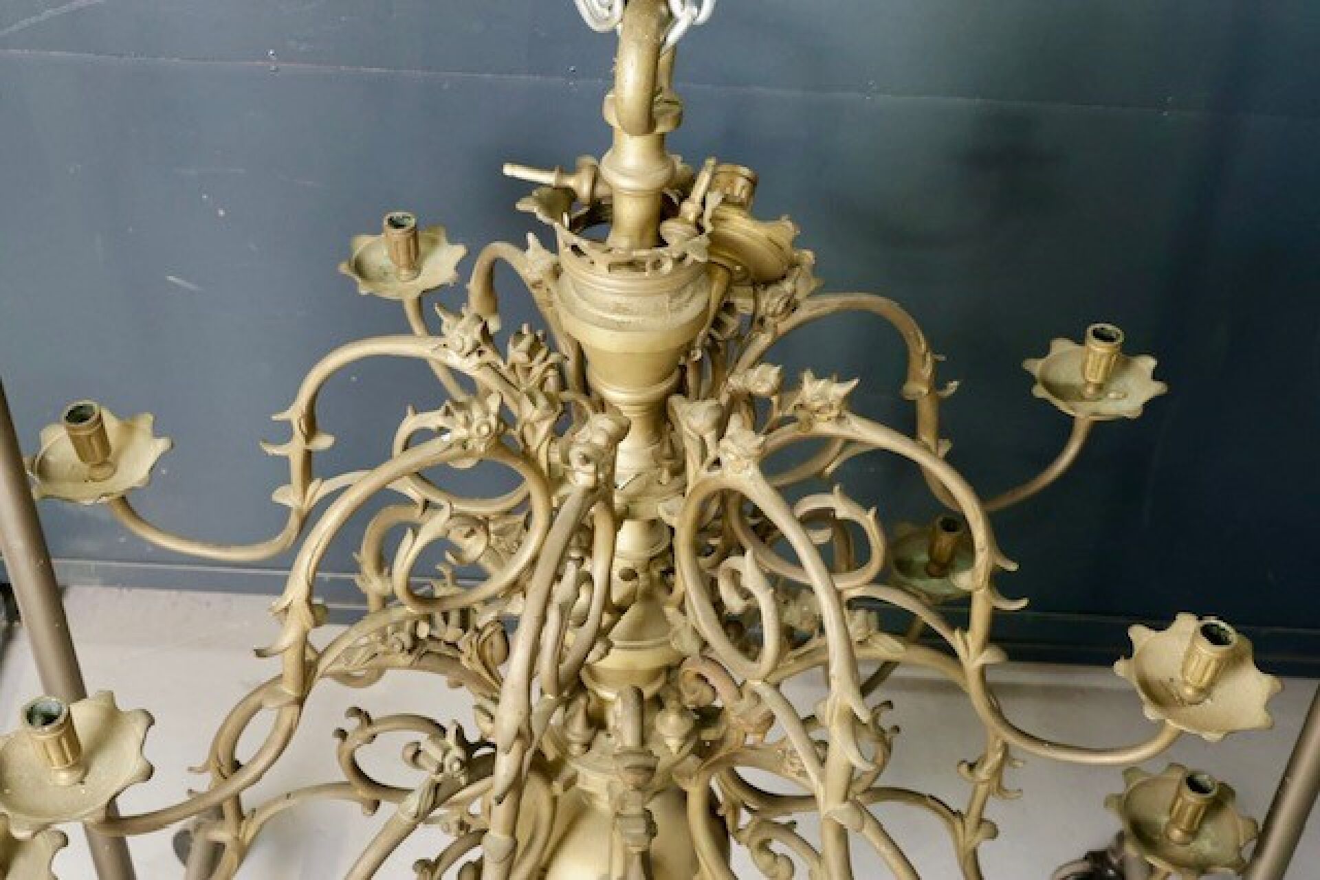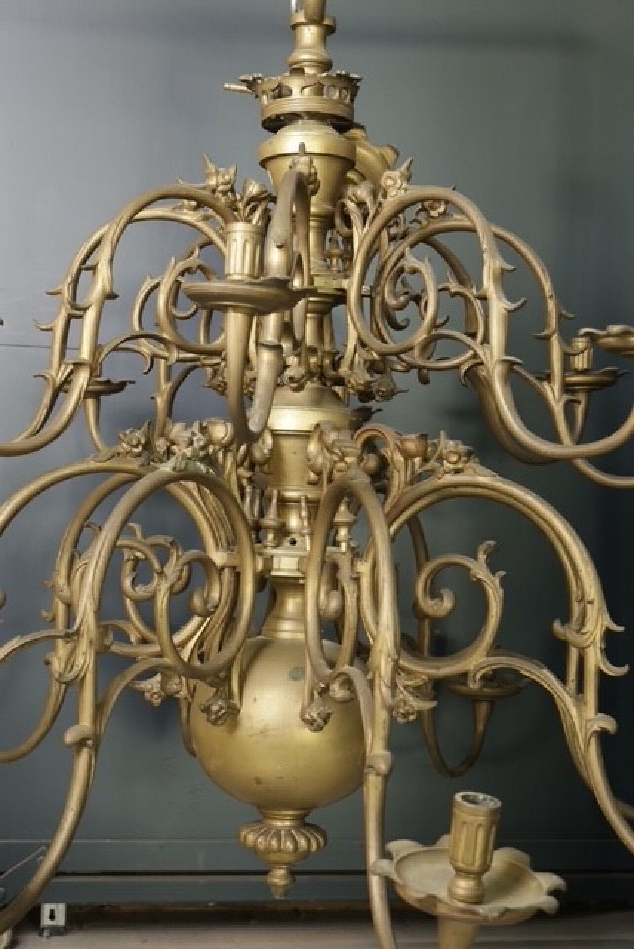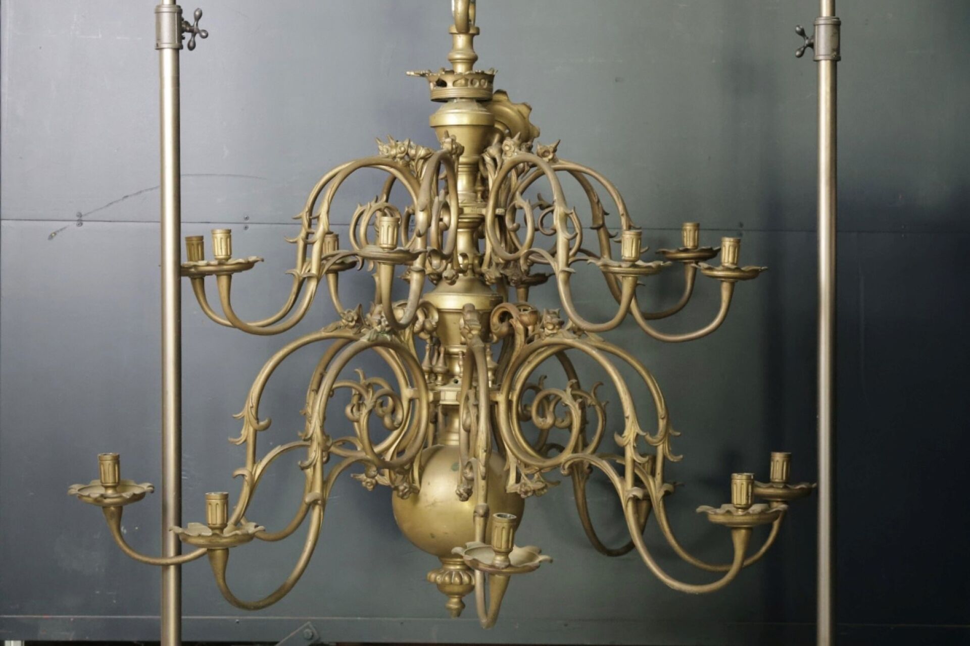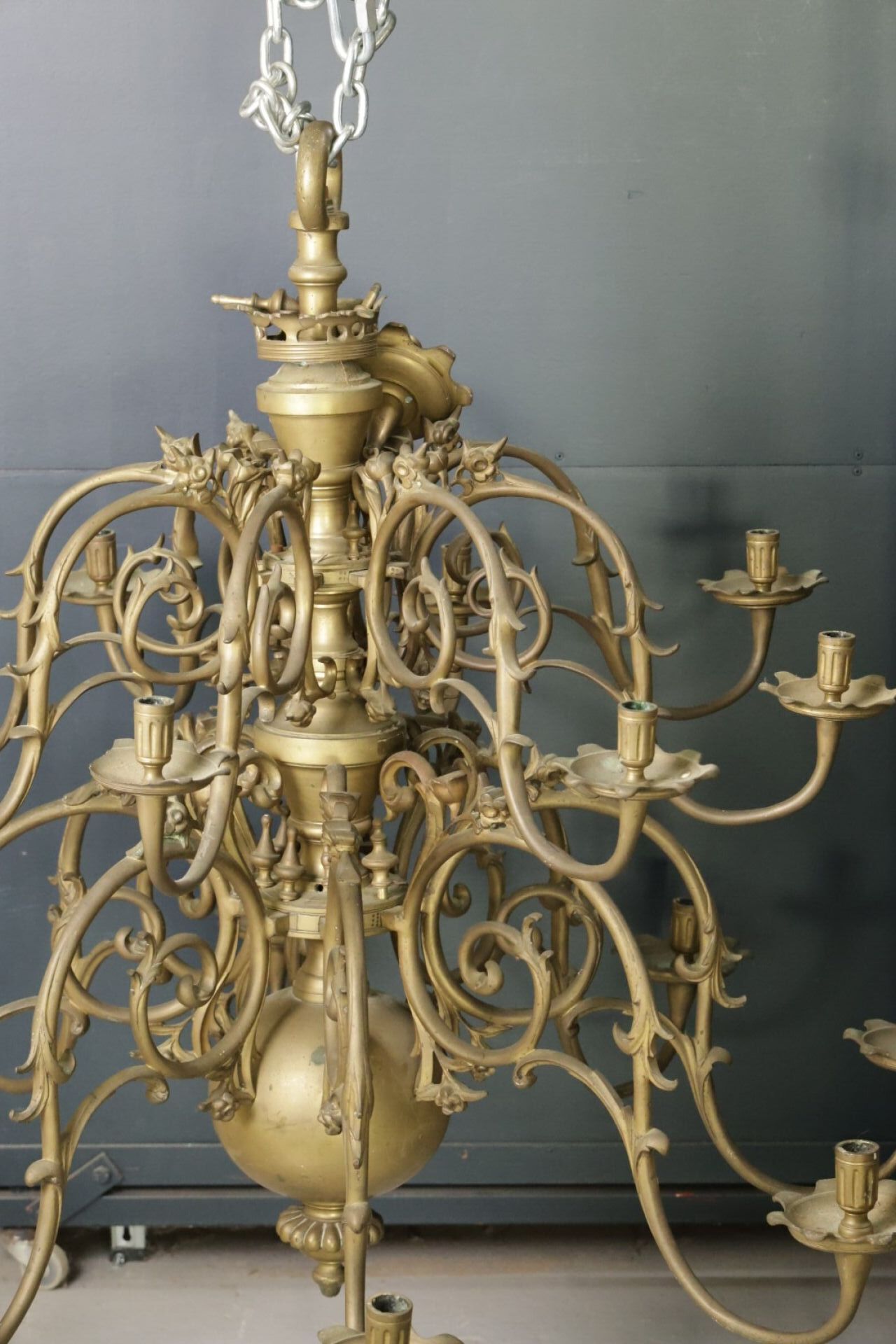 Grand lustre en laiton, le fût central balustre retient seize bras de lumière en volutes (accidents, manques). Style hollandais. Dim. à vue : Haut. : 105 cm - Diam. : 122 cm environ