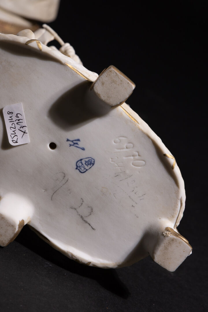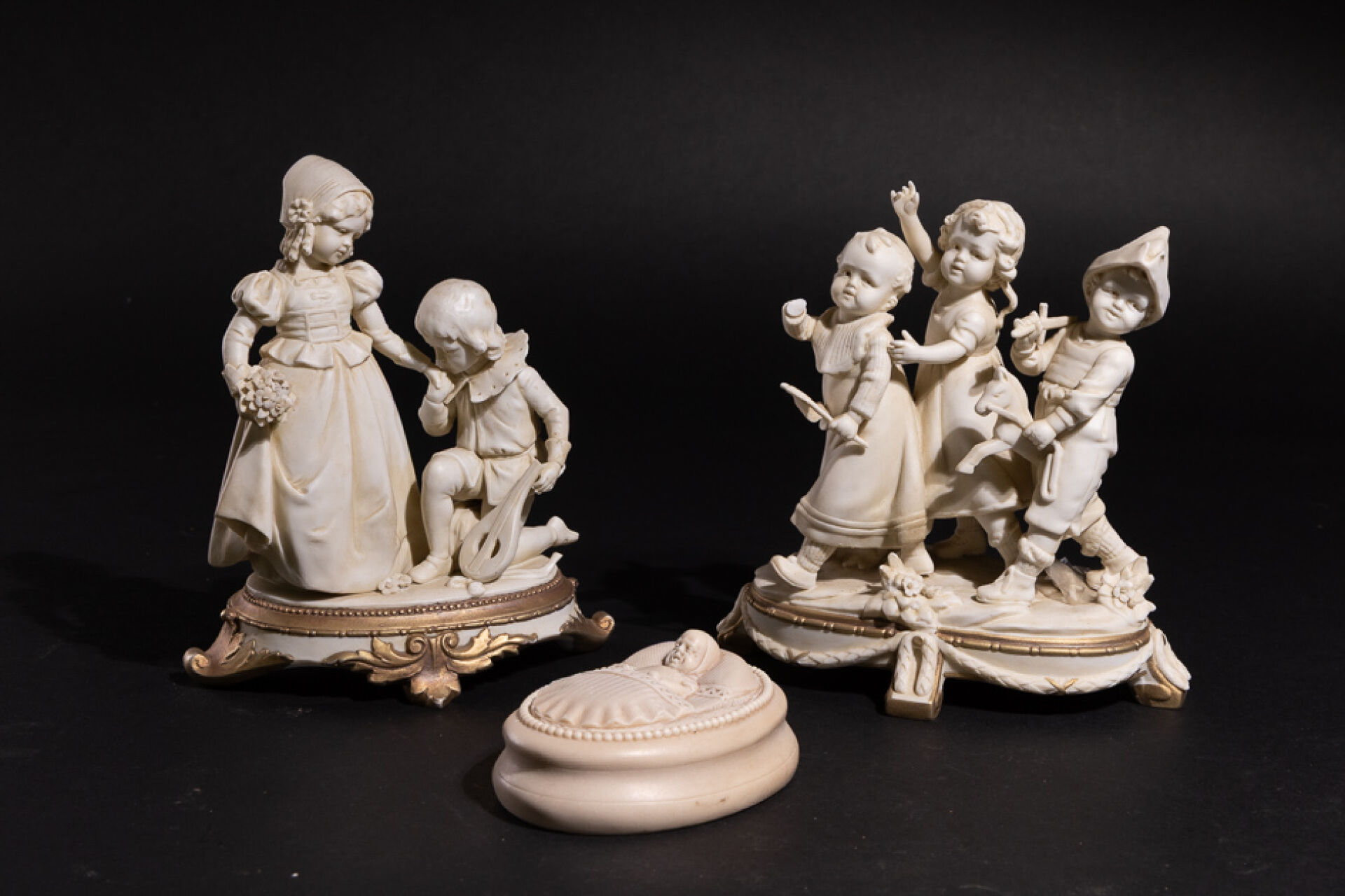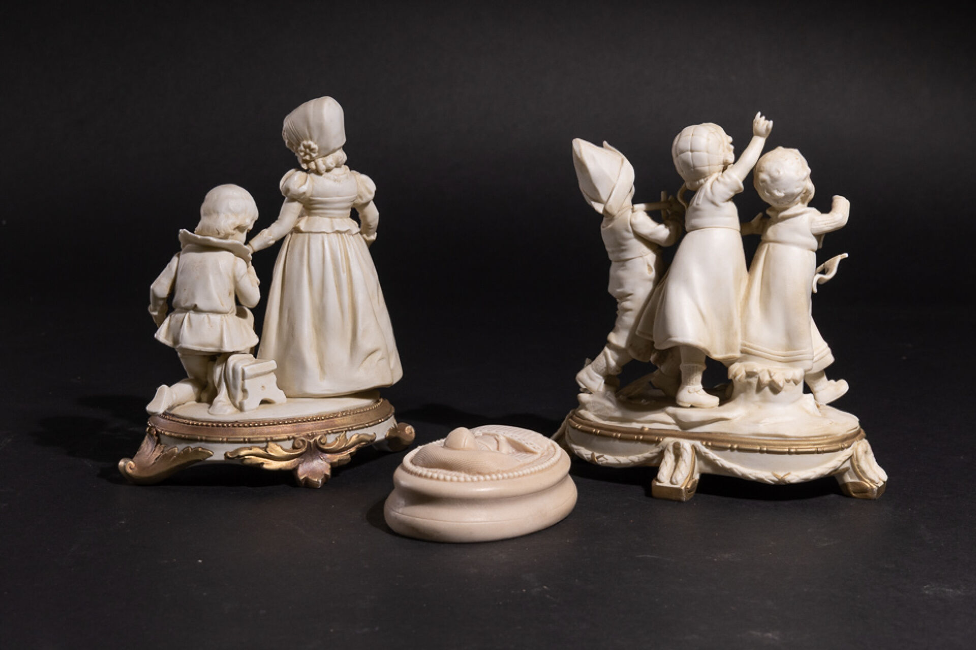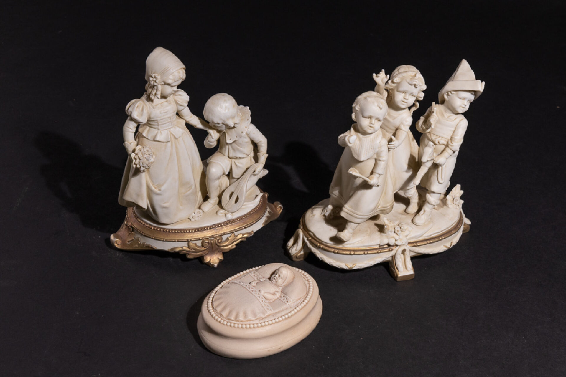Manufacture SCHWARZA. Deux statuettes en biscuit à réhauts dorés, la base oblongue à quatre patins figure des enfants jouant pour l'un et une scène galante enfantine pour l'autre (accidents et manques). Marquées au revers. Haut. : 18 et 20 cm On joint : Presse-papier en biscuit figurant un bébé pleurant dans un couffin. Haut. : 5 cm