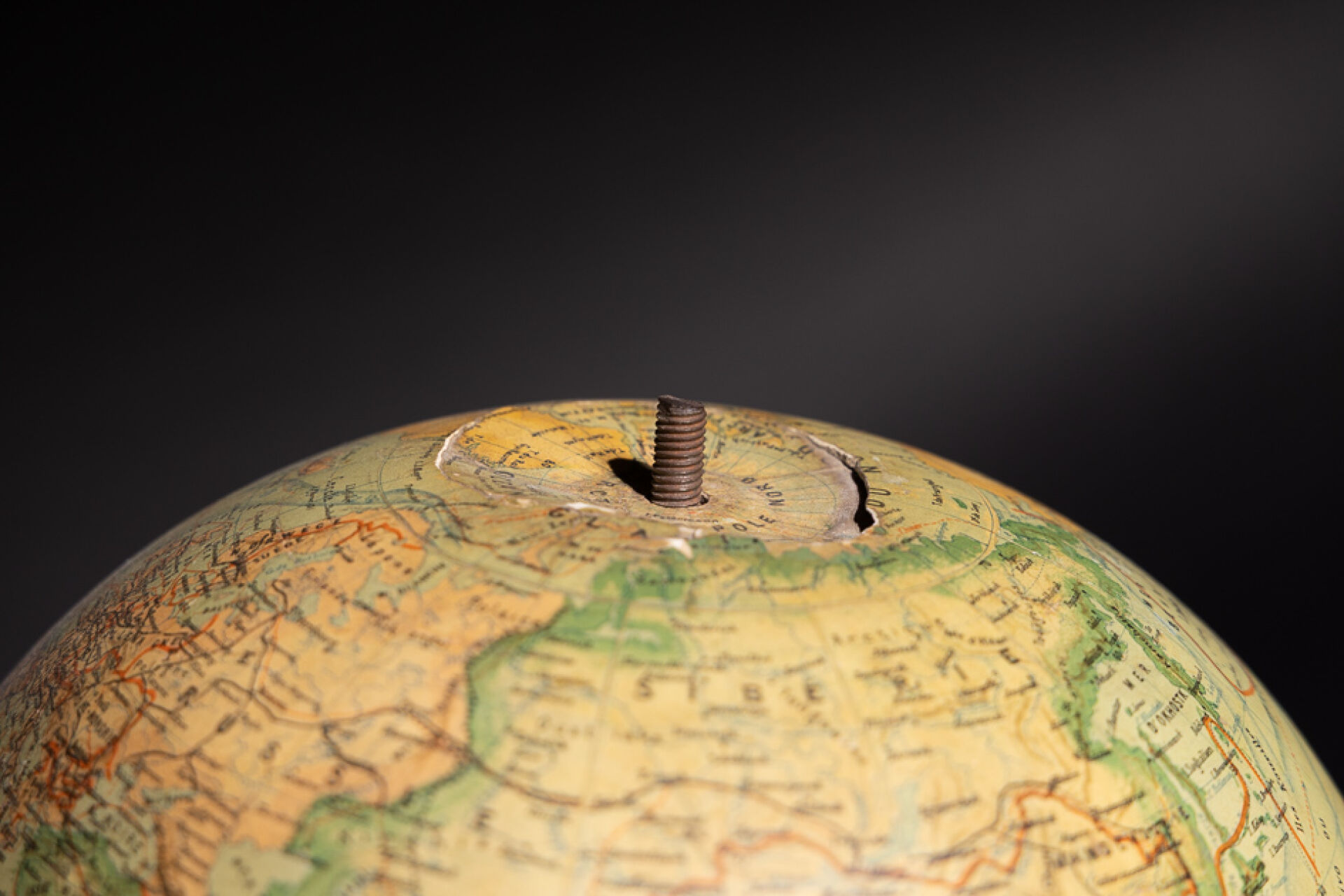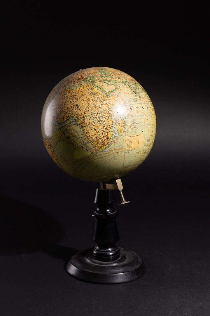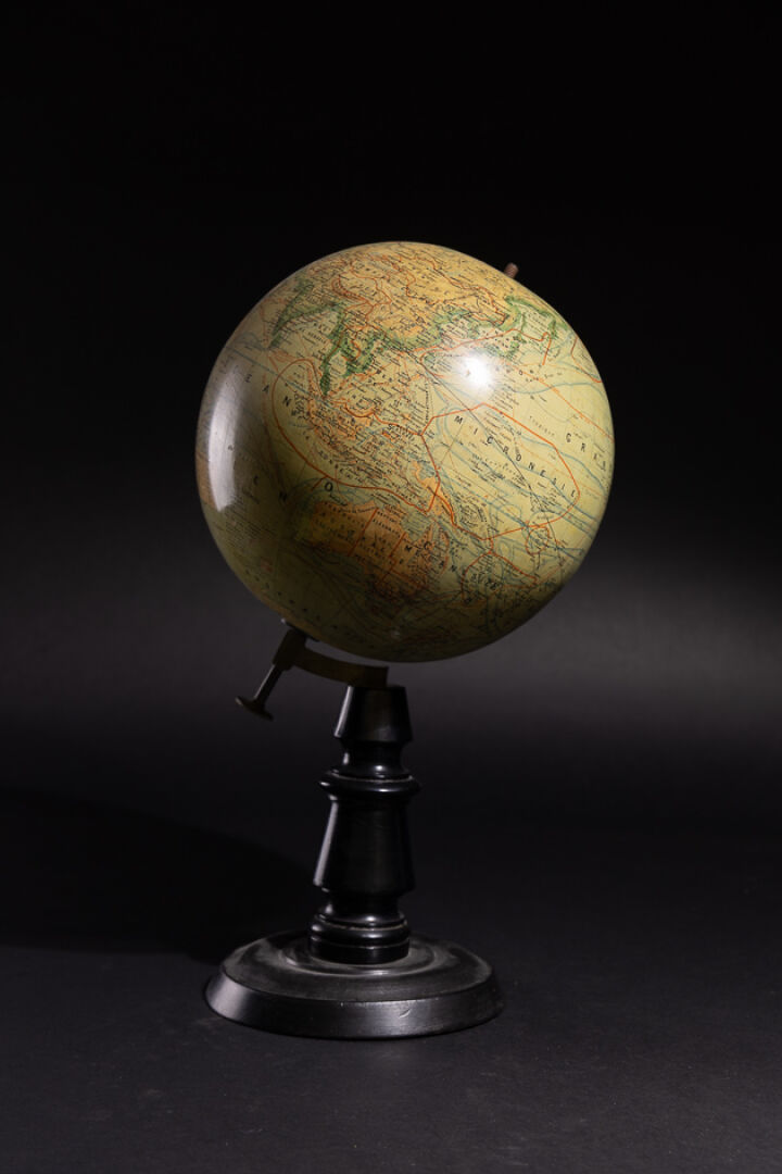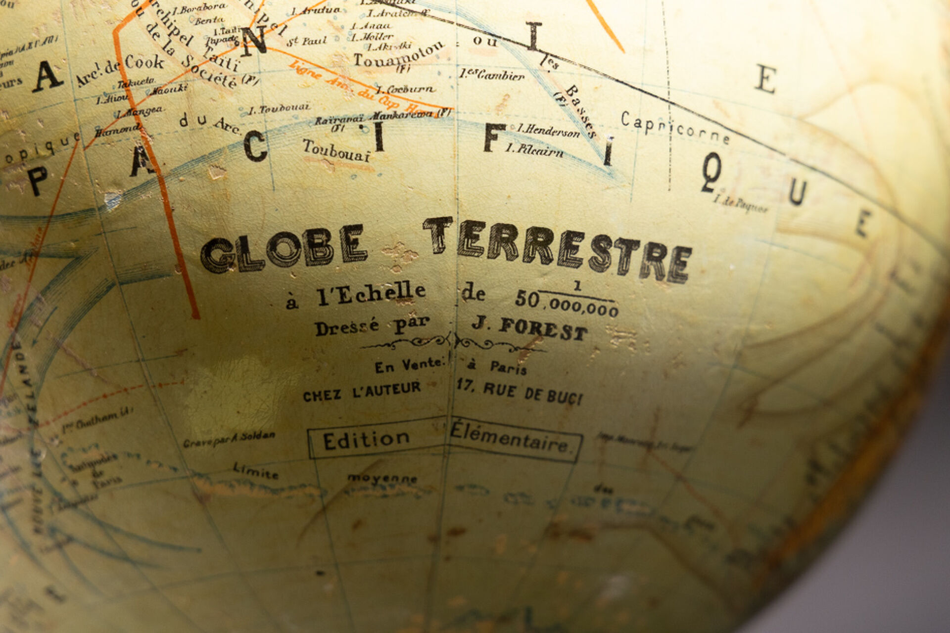 Globe terrestre d'étude dressé par J. FOREST présenté sur un pied balustre noir tournant (accidents, manques en partie haute). Début du XXe siècle. Haut. : 46 cm