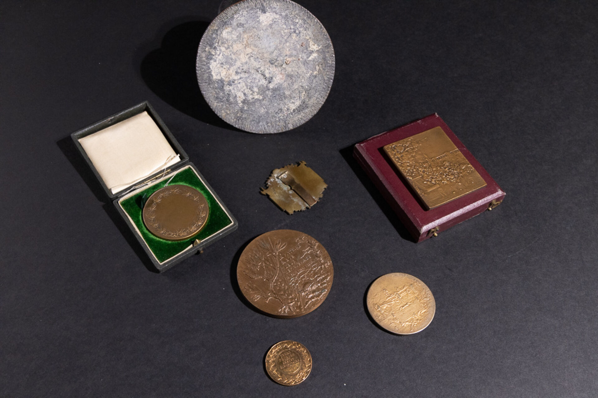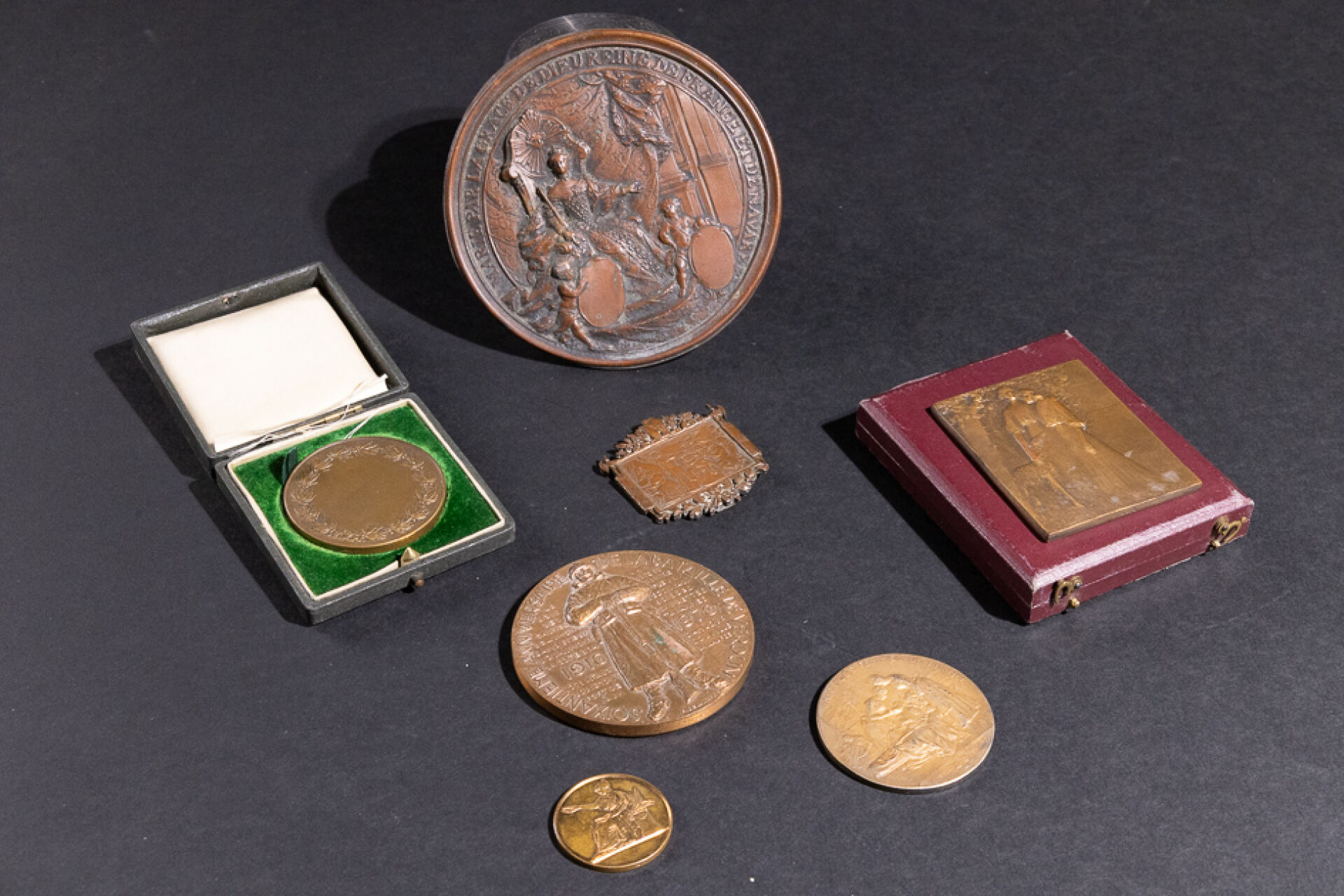 Six médailles et plaquette en bronze. XIXe-XXe siècle. On joint : Partie de médaille figurant Marie de Medicis. Broche en métal figurant une partie du tableau de David le Serment du jeu de Paume.