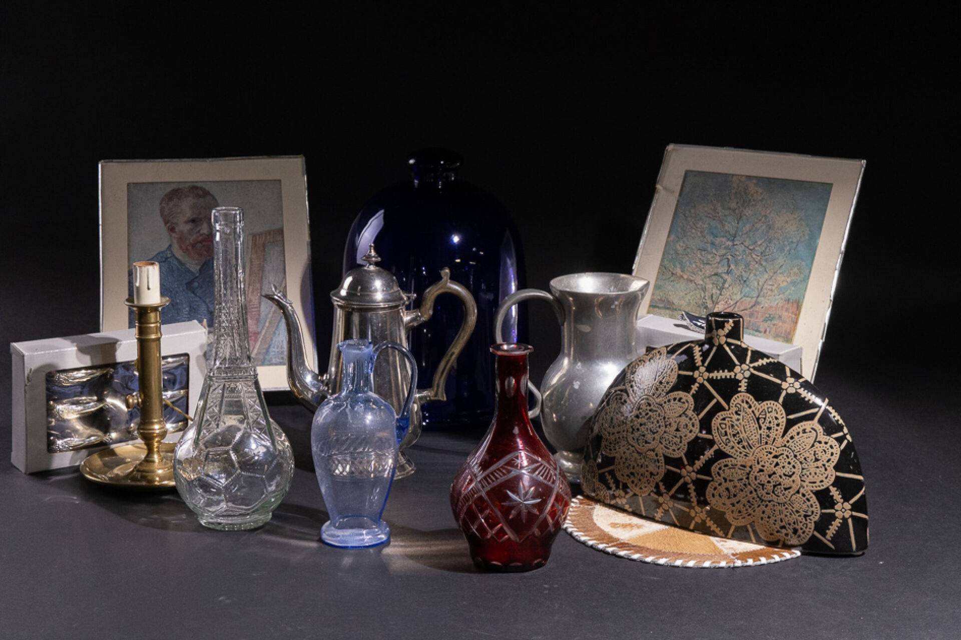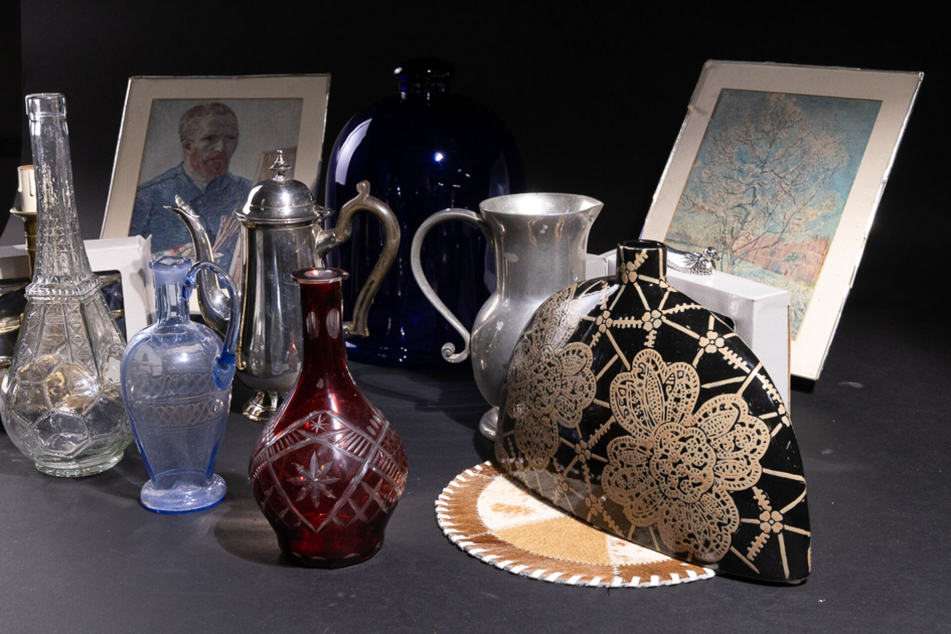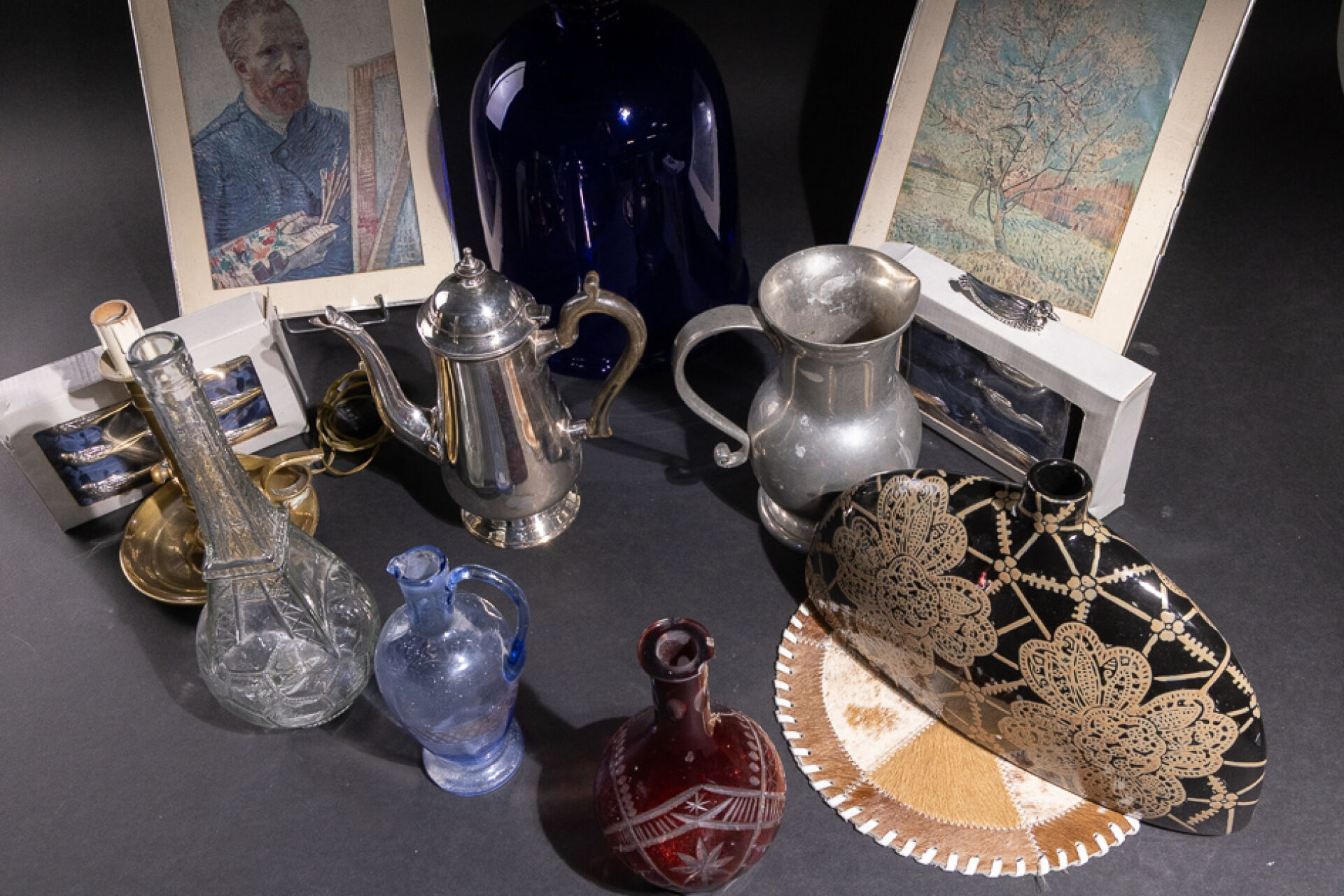 Ensemble (en l'état) comprenant : - Cloche en verre bleuté ; - Verseuse en métal argenté, la poignée en bois ; - Pichet en étain ; - Vase oblong en faïence à décor de flerus sur fond noir ; - Douze porte-couteaux canard ; - Deux reproductions d'après VAN GOGH ; - Bougeoir à main en laiton monté à l'électricité ; - Vase en verre et cristal overlay dans les tons rouges ; - Pichet en verre bleuté ; - Carafe footballistique, la partie basse en forme de ballon surmontée d'une Tour Eiffel ; - Plateau en métal à décor de volutes. XXe siècle.