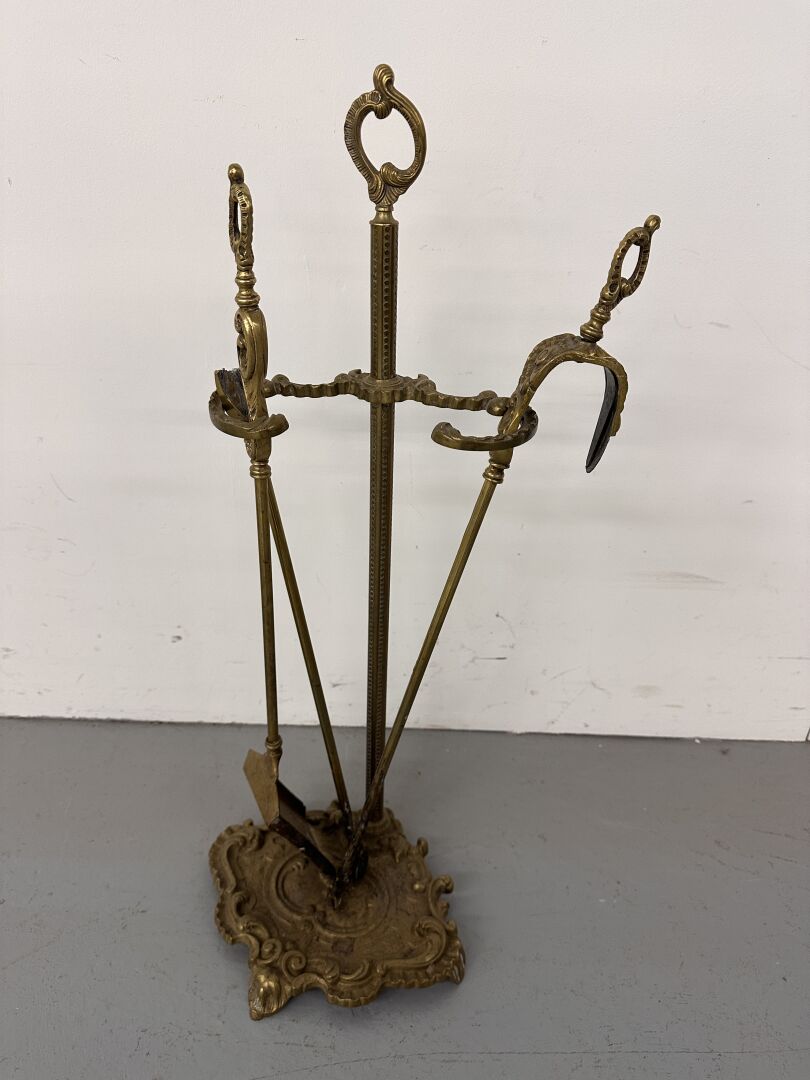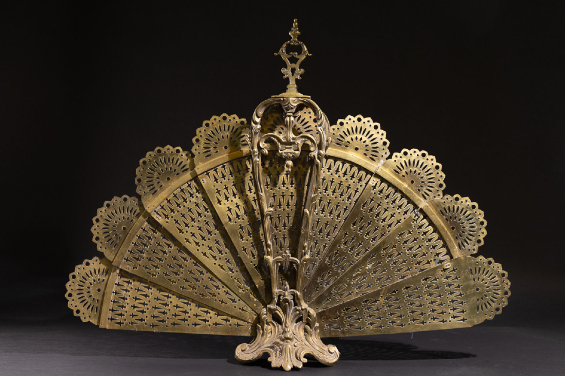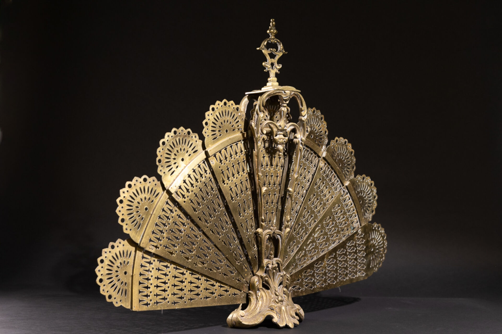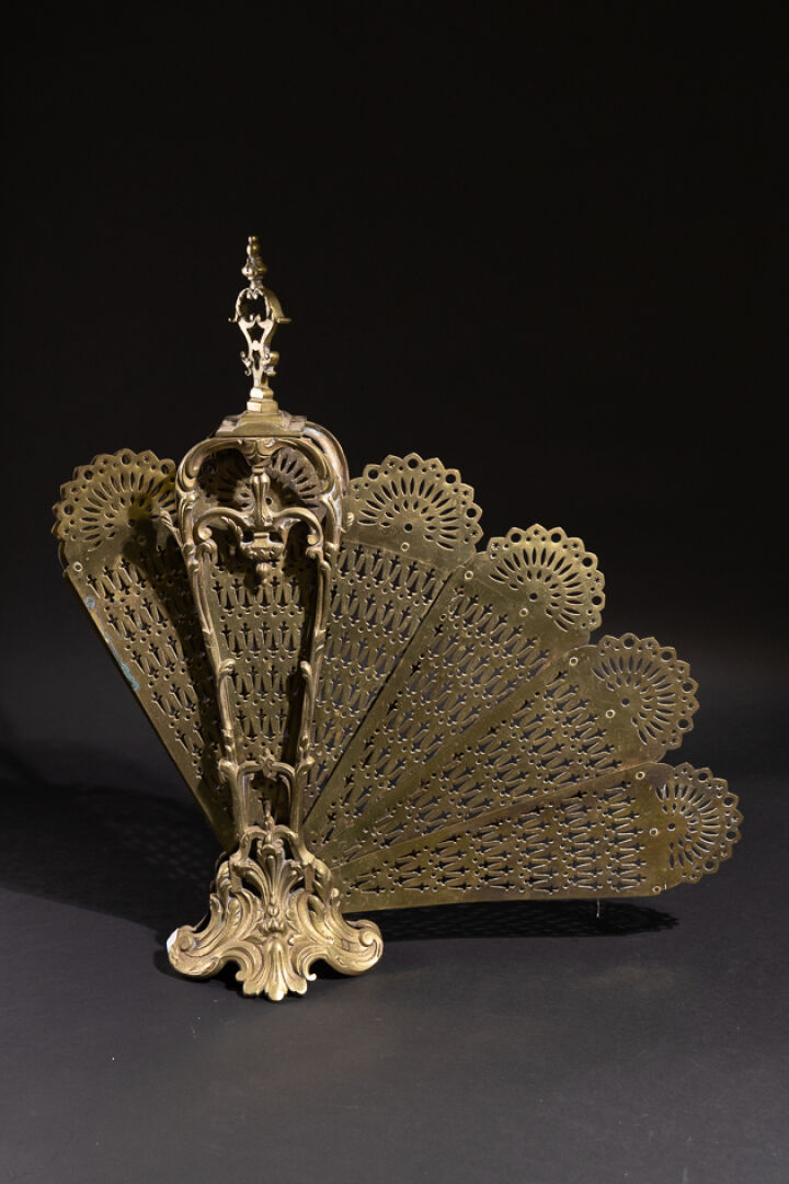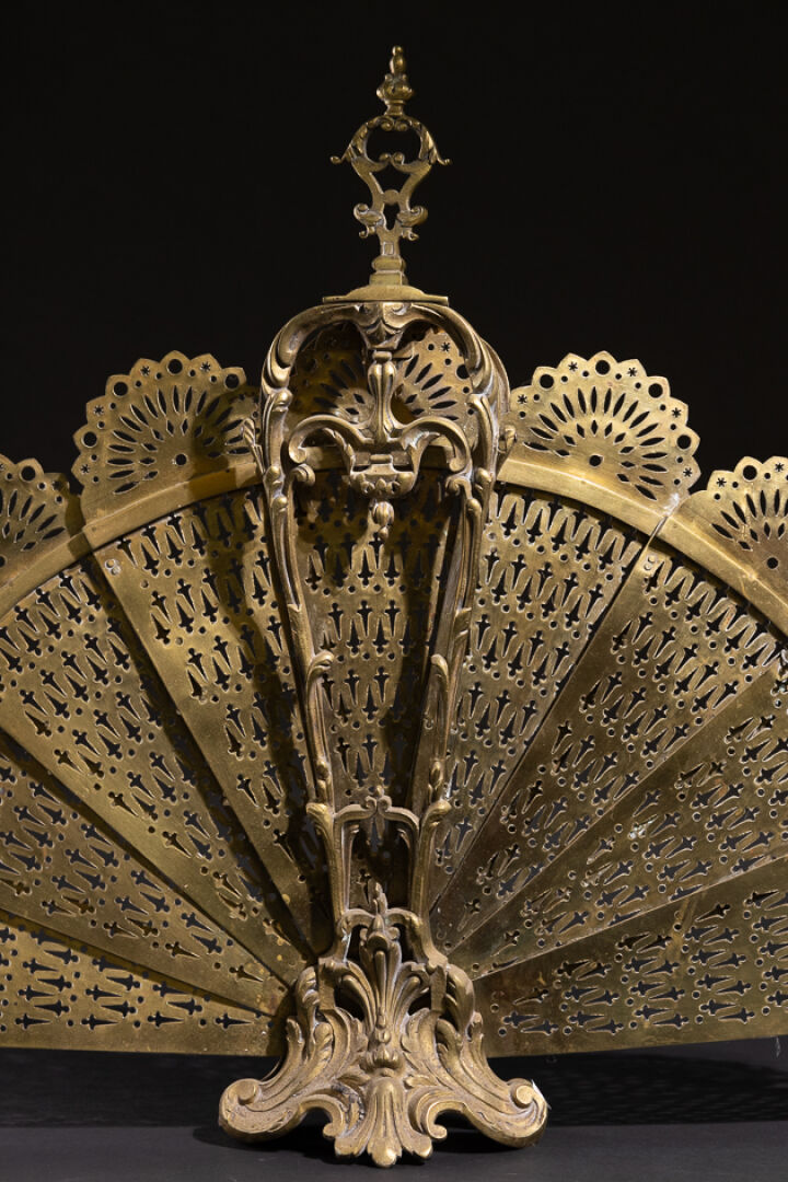 Ecran de cheminée en évantail à neuf brins en laiton et bronze ciselés. Style Louis XV. Haut. : 60 cm - Larg. : 80 cm On joint : Deux nécessaires de cheminée en bronze (accidents, manques) comprenant : - Deux portes outils ; - Deux pelles ; - Pince (accident). L'un de style Louis XV.
