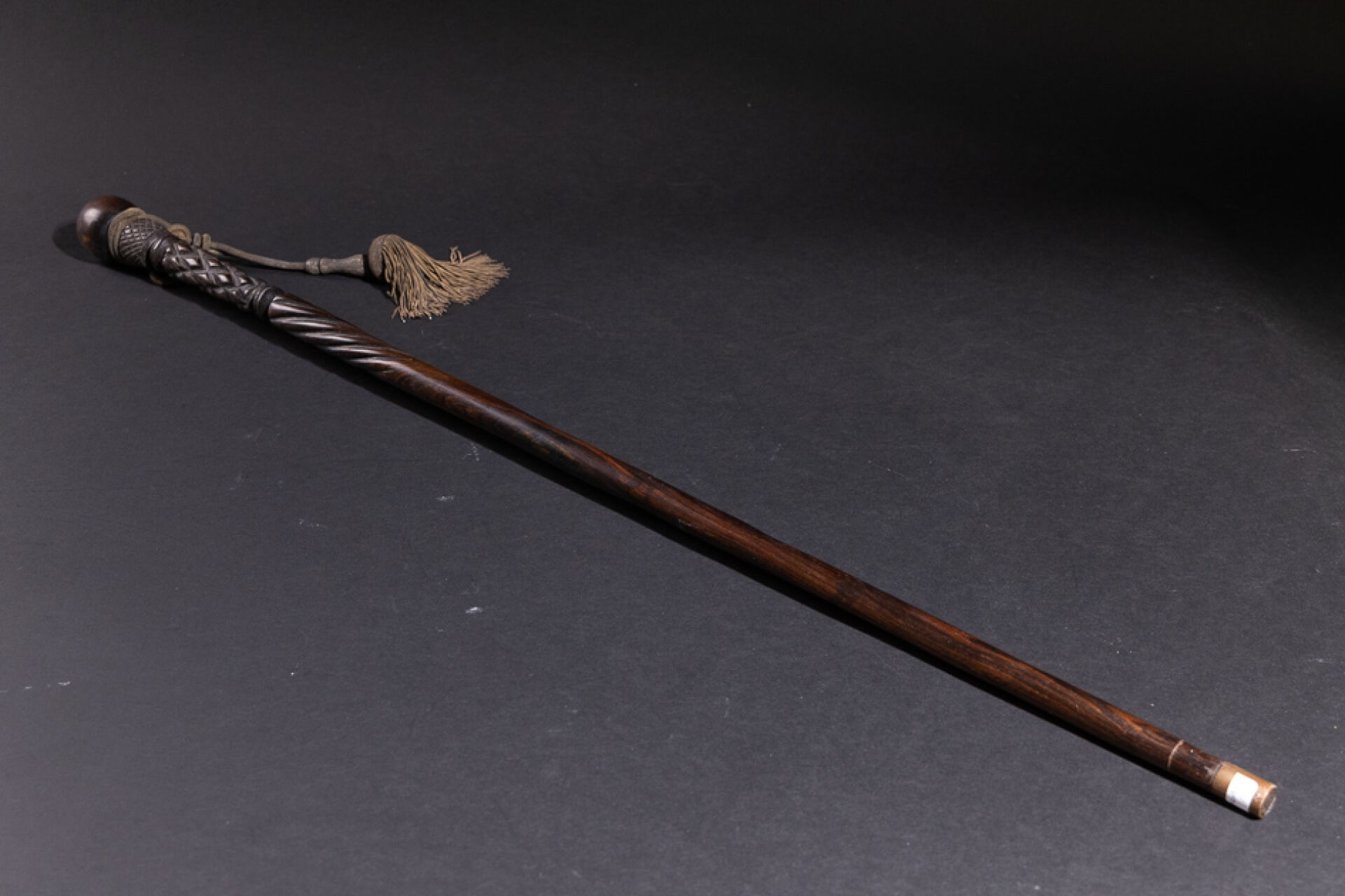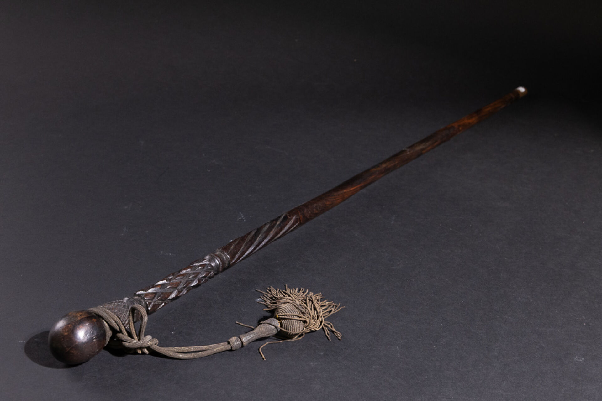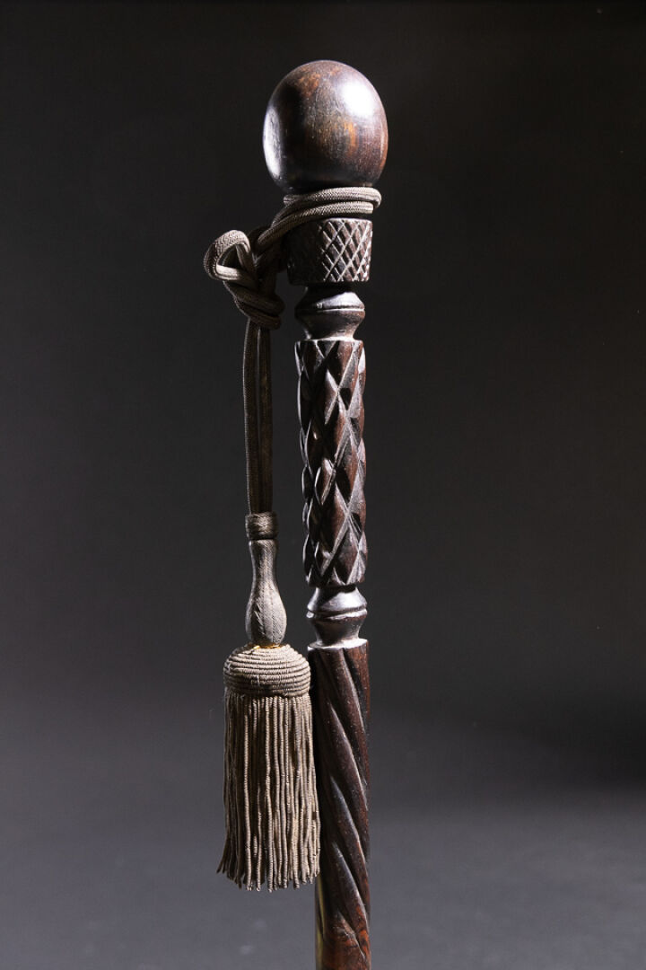 Canne en palissandre massif sculpté, la partie haute à décor de motifs géométriques sculptés sommée d'un pommeau. La pointe cerclée de métal. Vers 1900. Long. : 92 cm