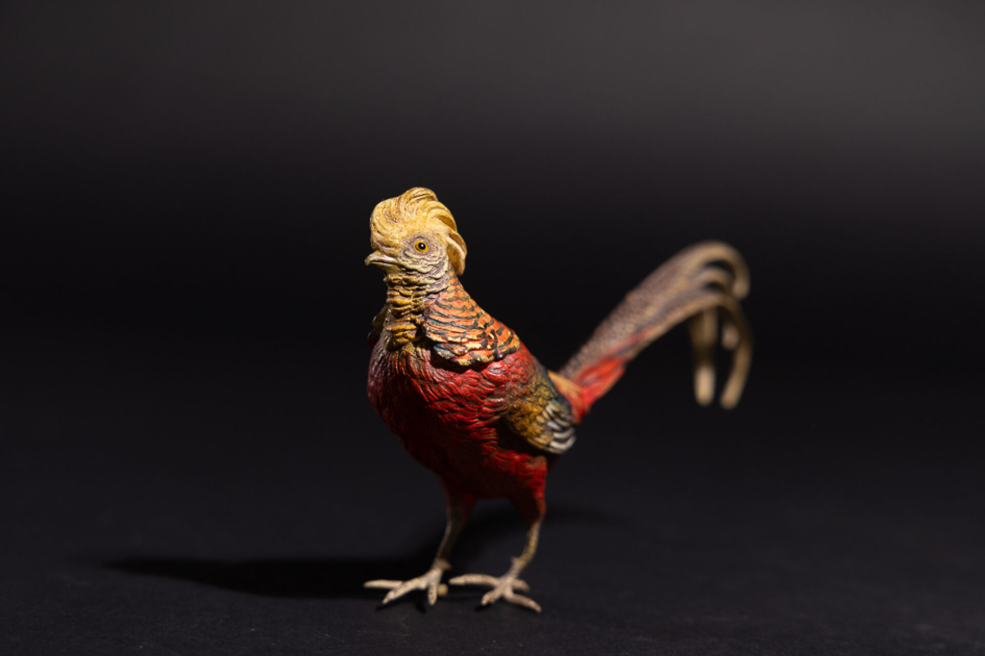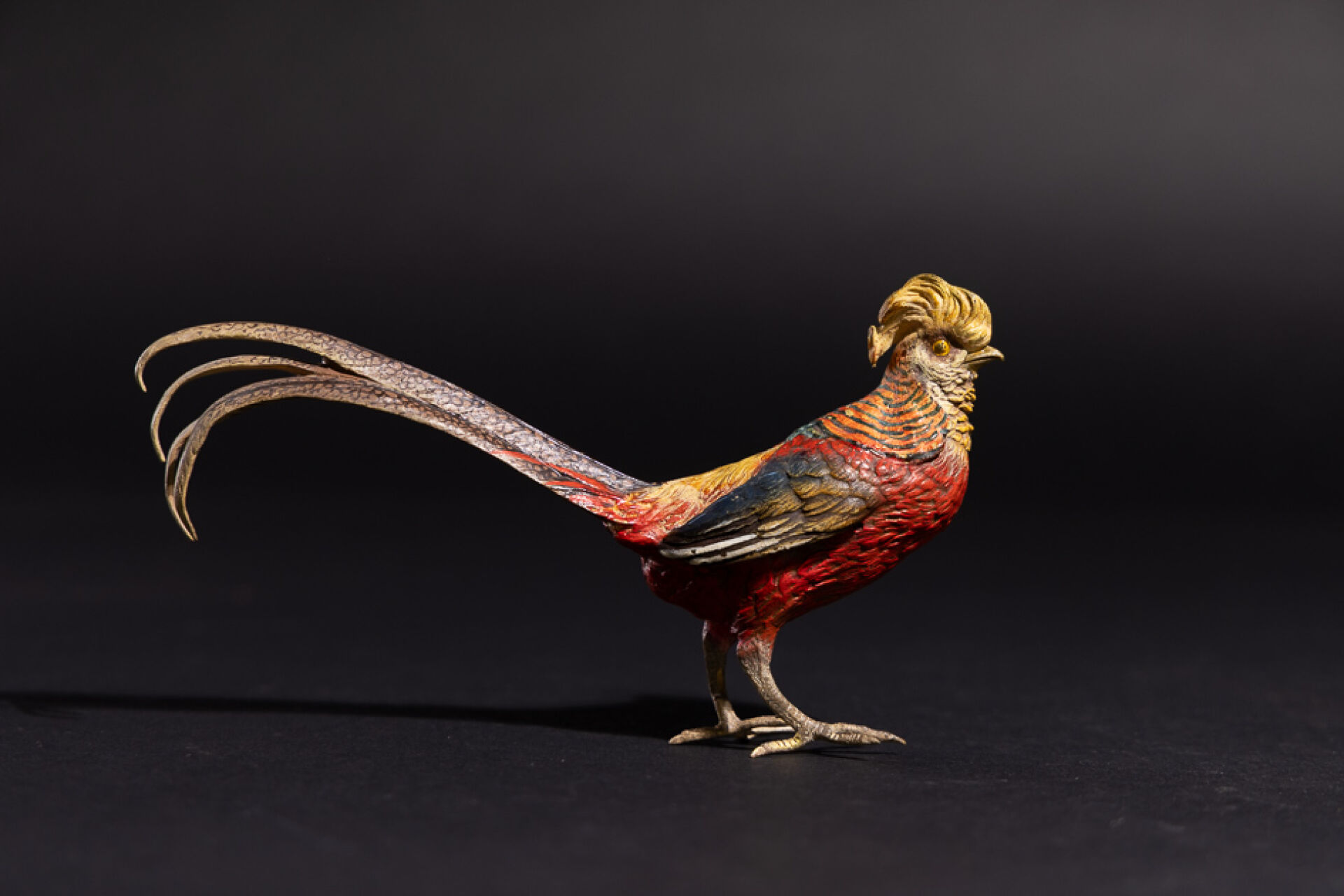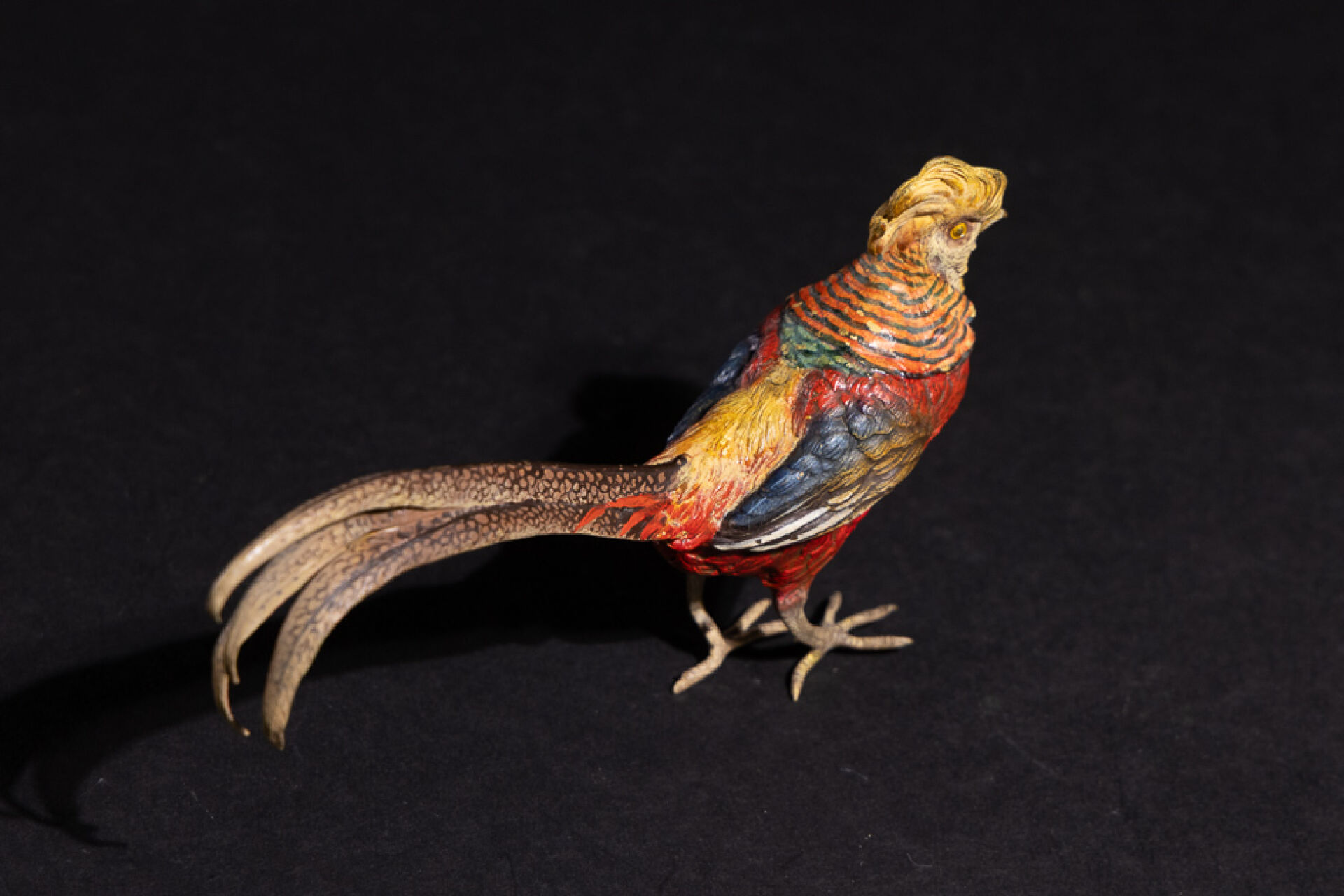 Faisan vénéré en plomb dit de Vienne polychrome, numéroté 1801 au niveau du croupion. XIXe siècle. Haut. : 8 cm - Long. : 17 cm